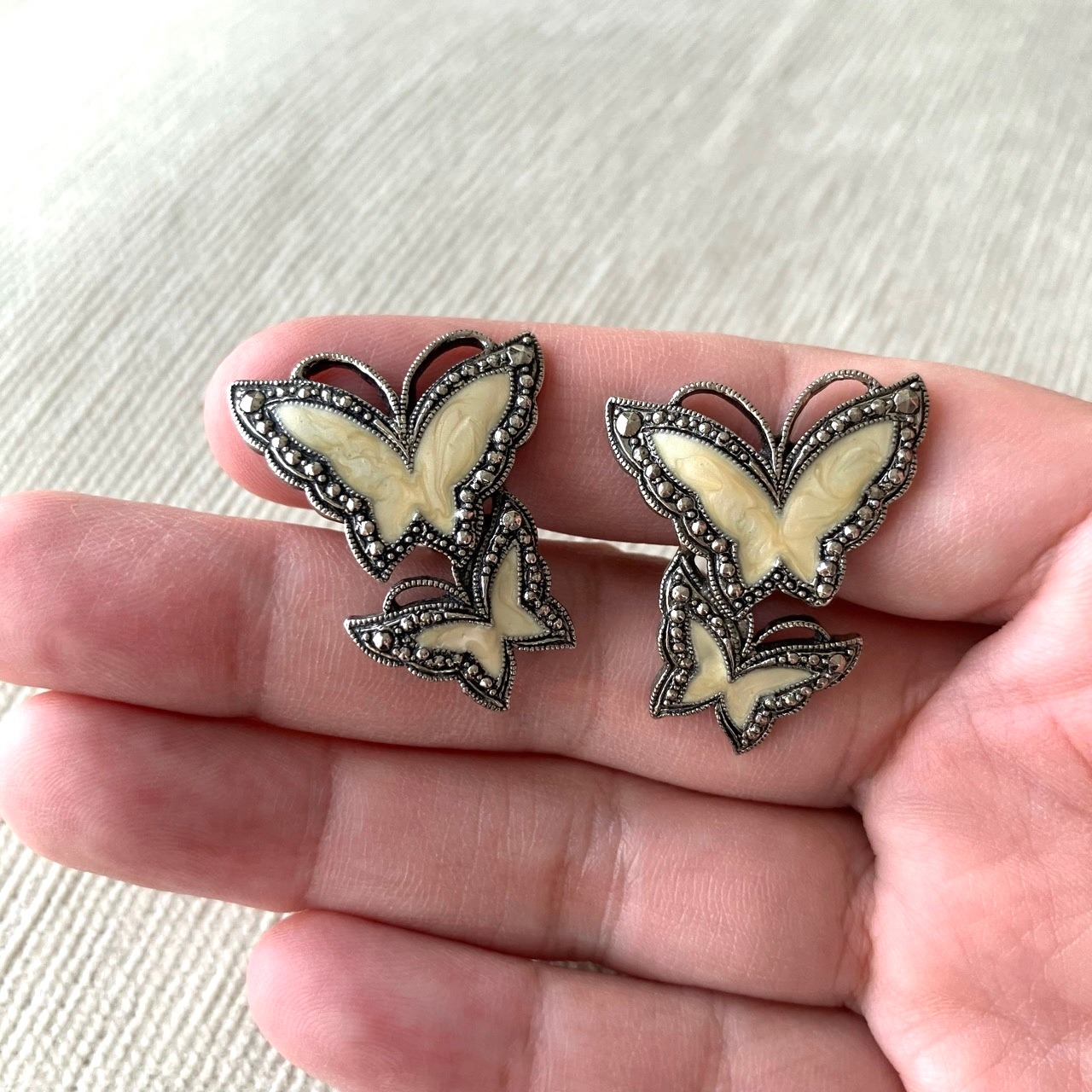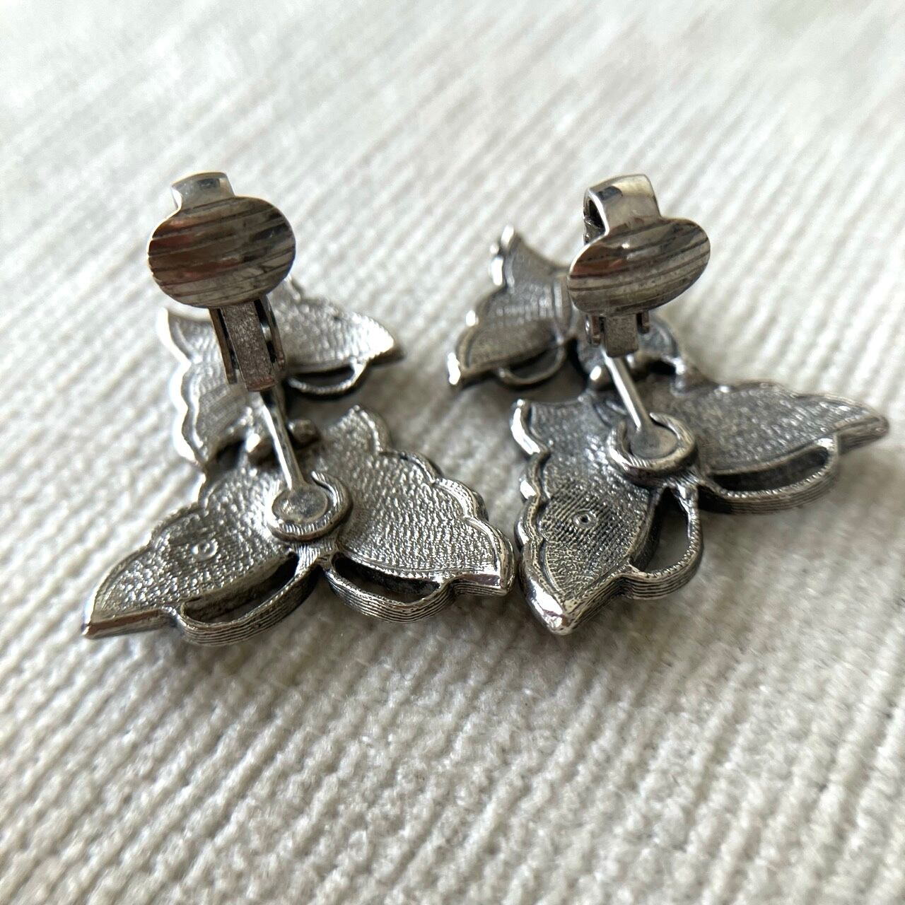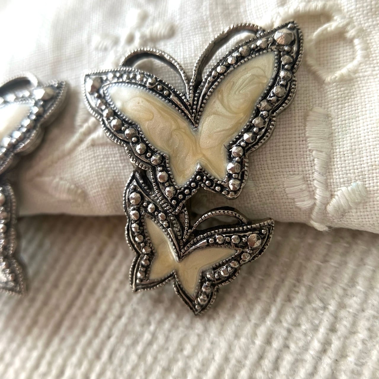 アンティーク調シルバーメタルのマーカサイト風装飾のある土台に、優しいクリームマーブルエナメルの蝶々のデザインが、とても素敵な”AVON”(エイボン)のヴィンテージイヤリングです。