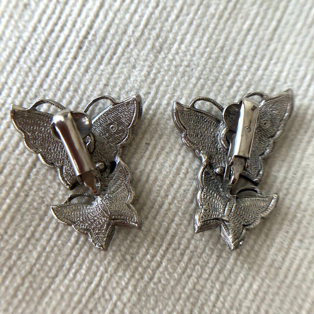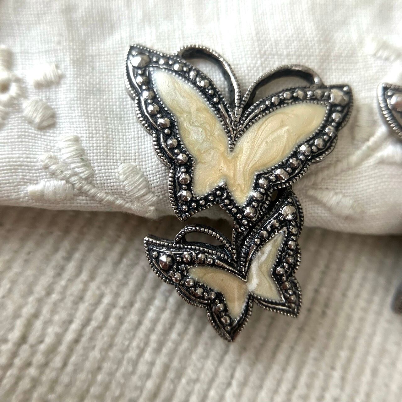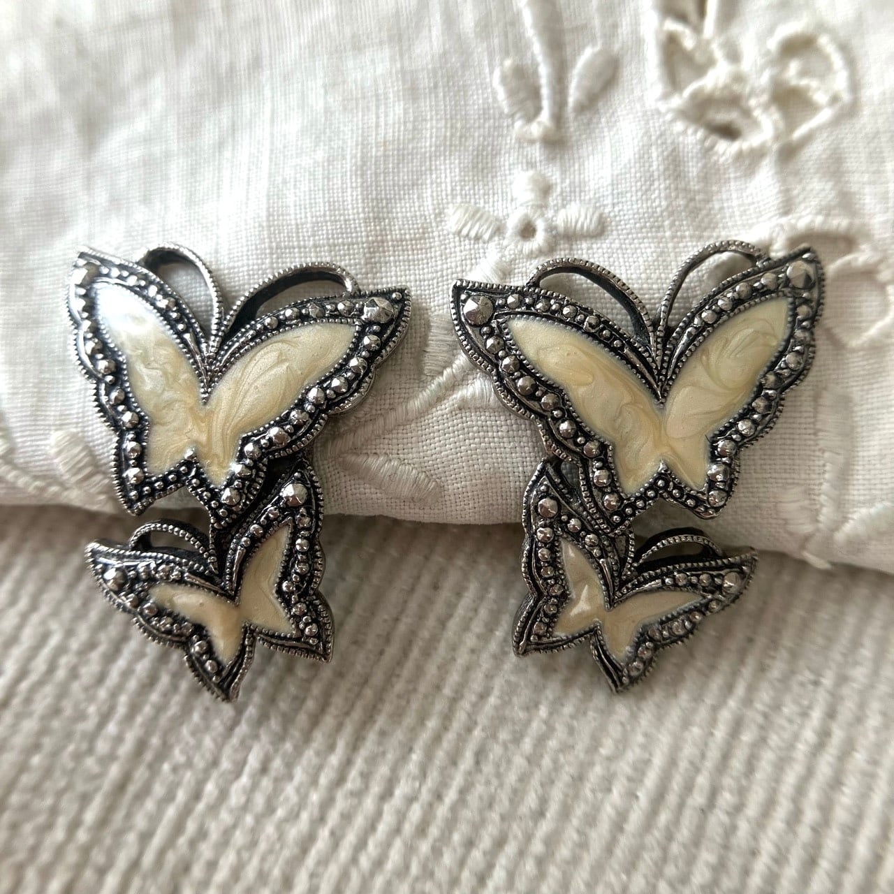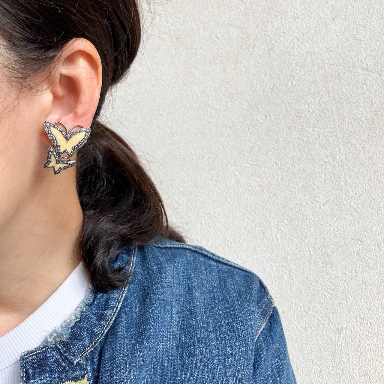 アンティーク調シルバーメタルのマーカサイト風装飾のある土台に、優しいクリームマーブルエナメルの蝶々のデザインが、とても素敵な”AVON”(エイボン)のヴィンテージイヤリングです。