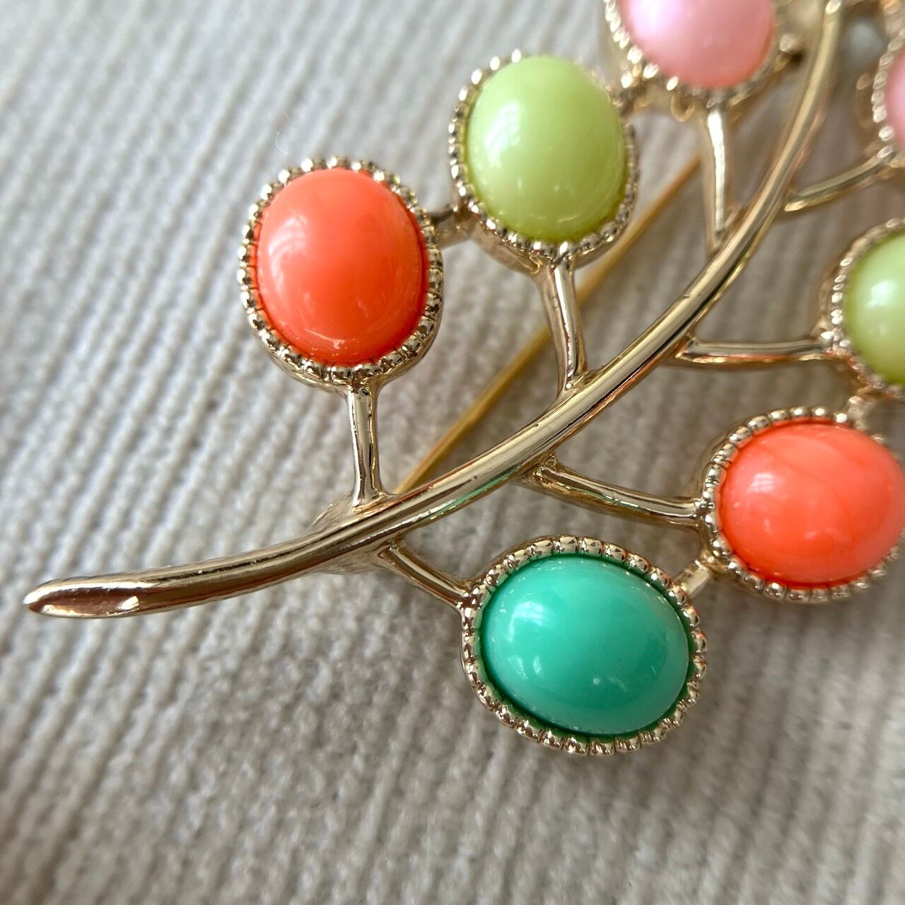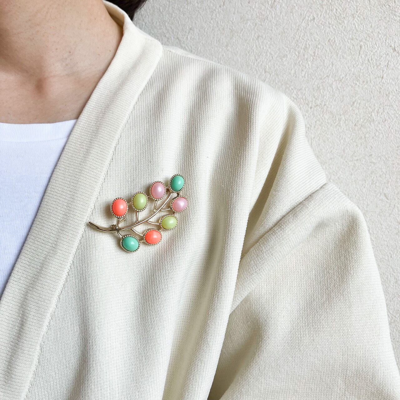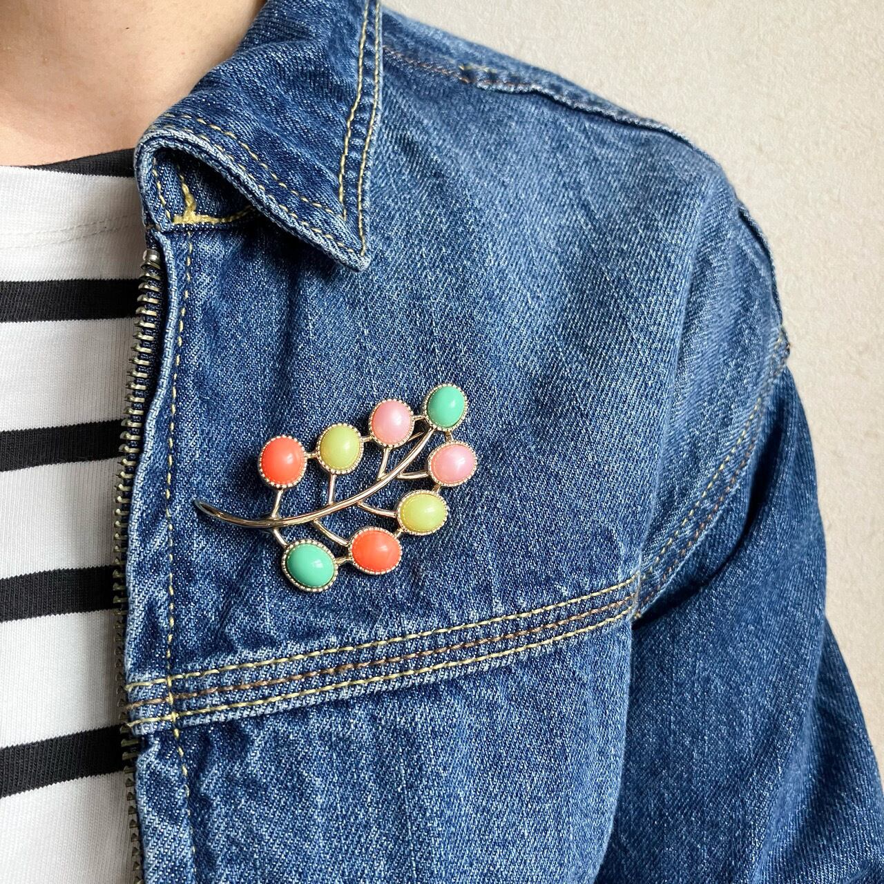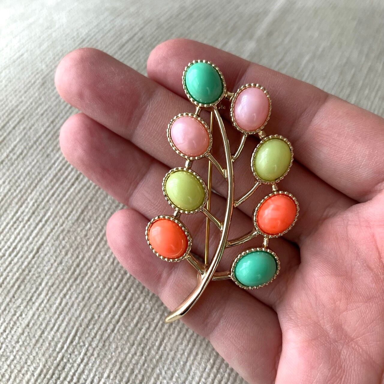 1949年に設立されたジュエリーメーカー”Sarah Coventry”(サラコベントリー)の、レトロなパステルカラーカボションとゴールドメタルの小枝と実のような愛らしくお洒落なデザインがとても素敵なヴィンテージブローチです。