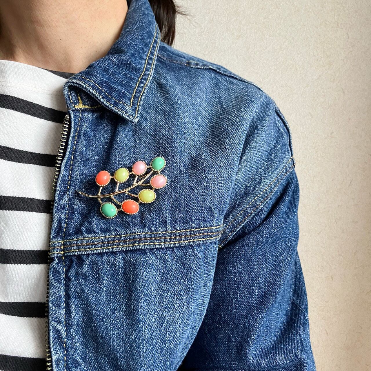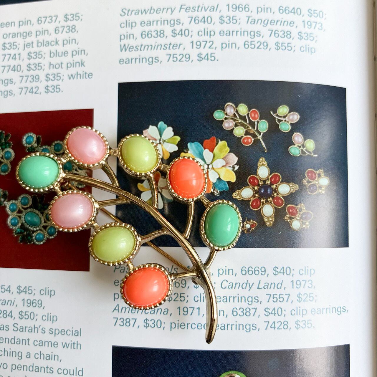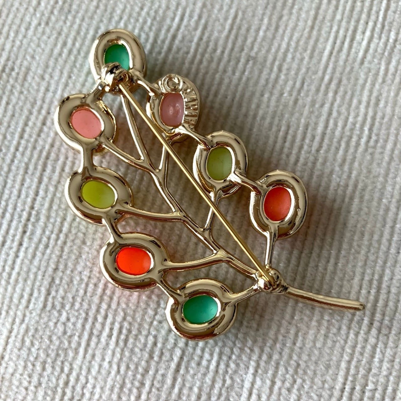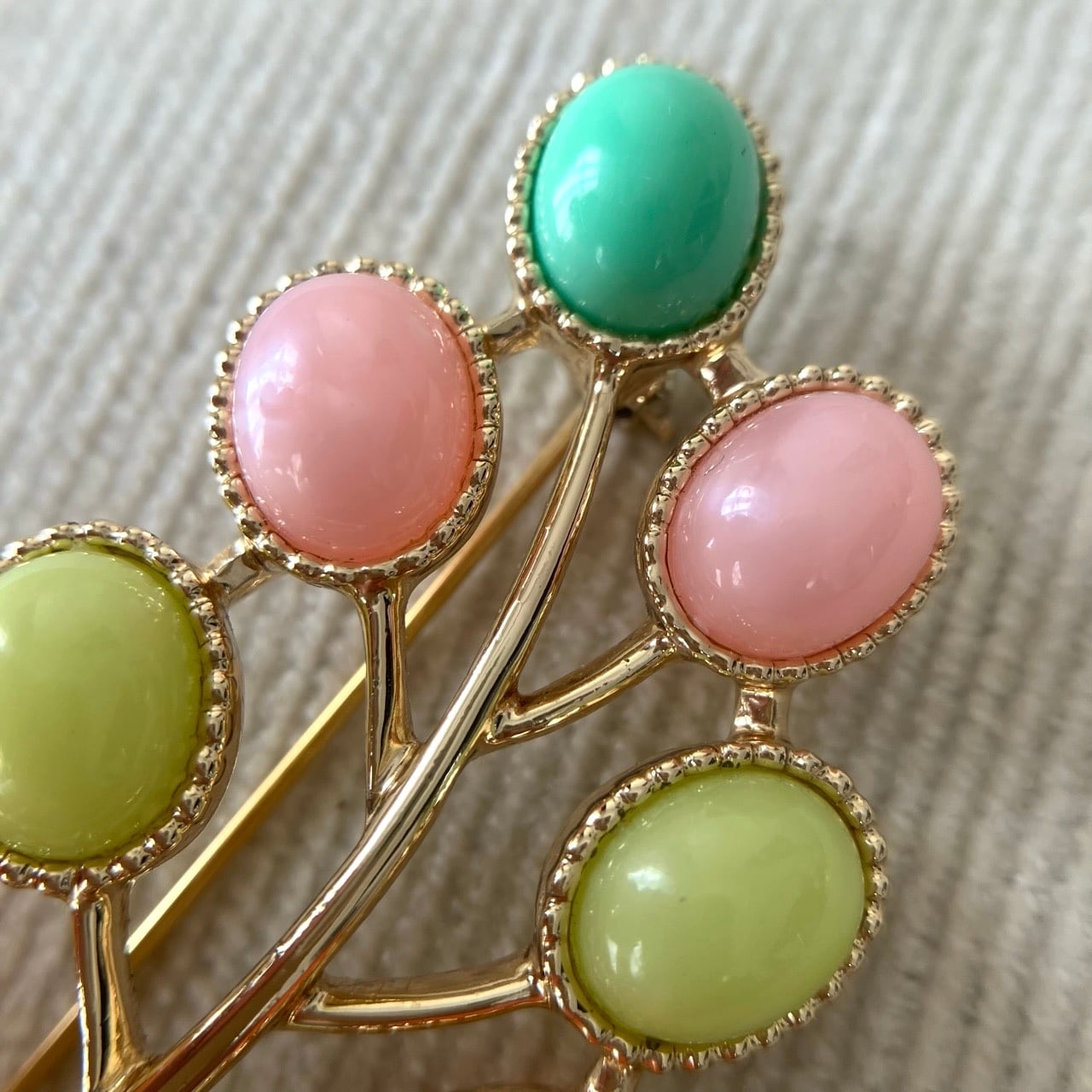 1949年に設立されたジュエリーメーカー”Sarah Coventry”(サラコベントリー)の、レトロなパステルカラーカボションとゴールドメタルの小枝と実のような愛らしくお洒落なデザインがとても素敵なヴィンテージブローチです。