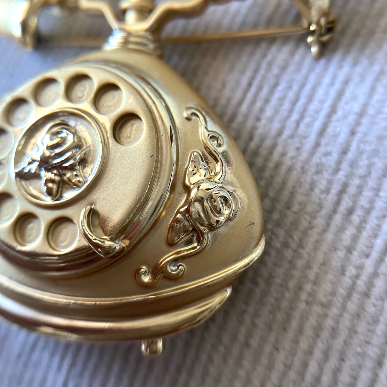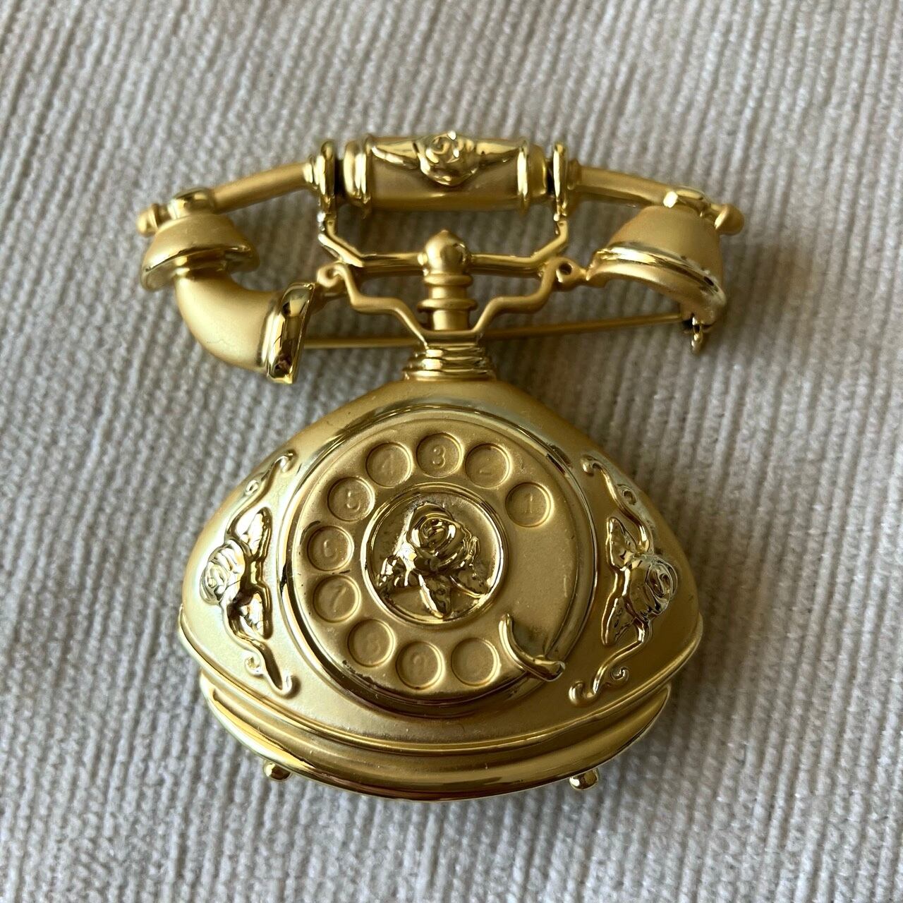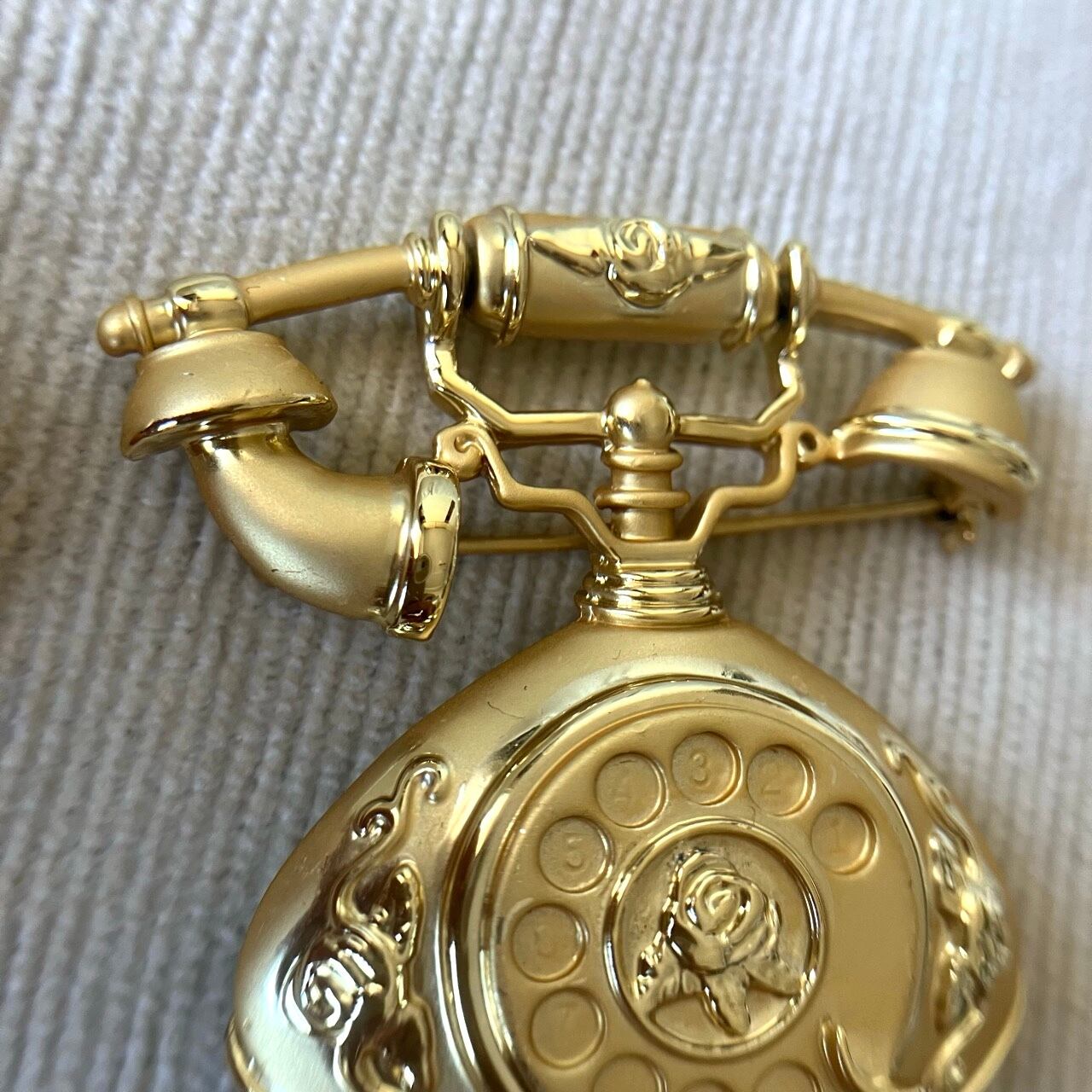 "AJC"のマットと艶のゴールドメタルの、クラシカルで美しい電話のデザインがとても素敵なヴィンテージブローチです。