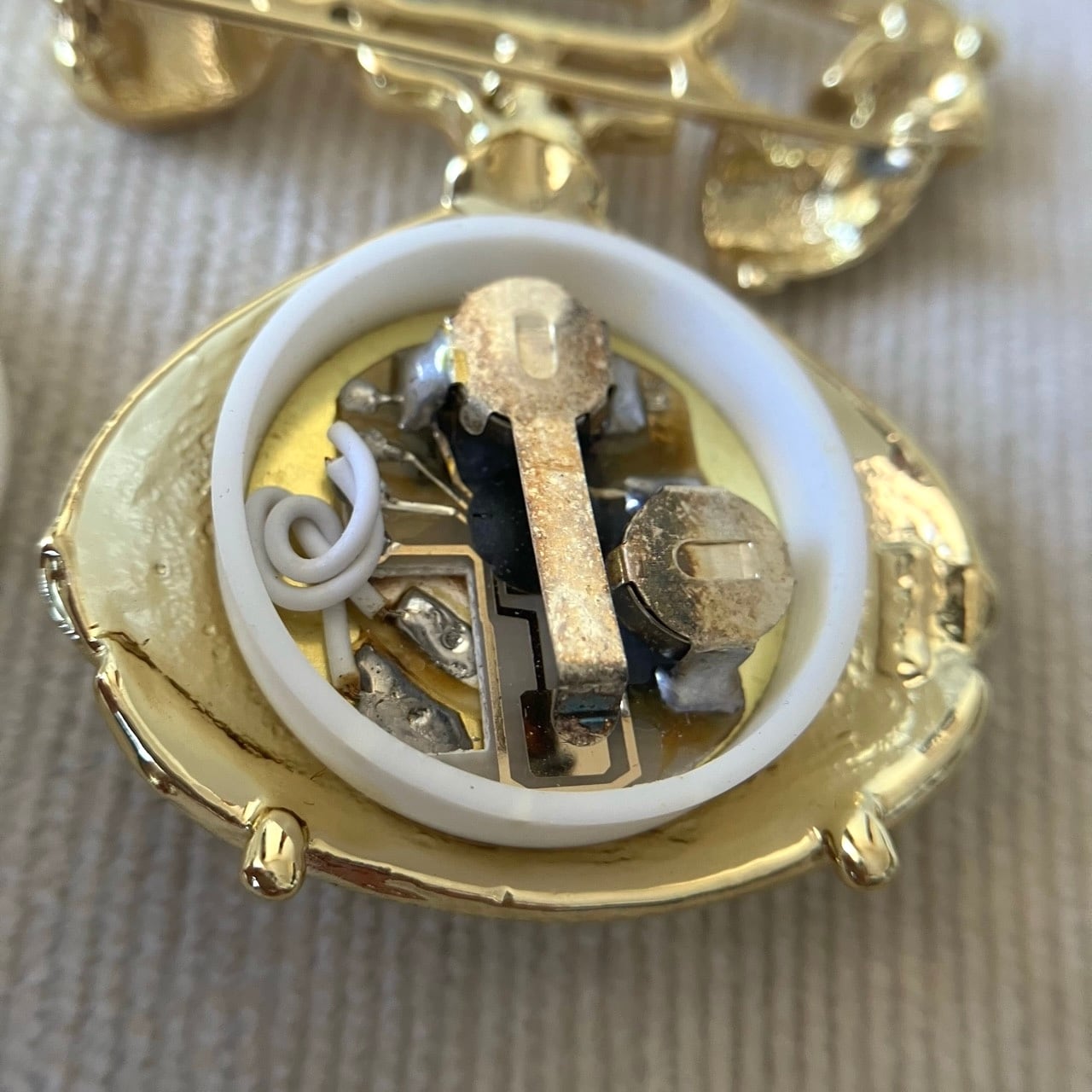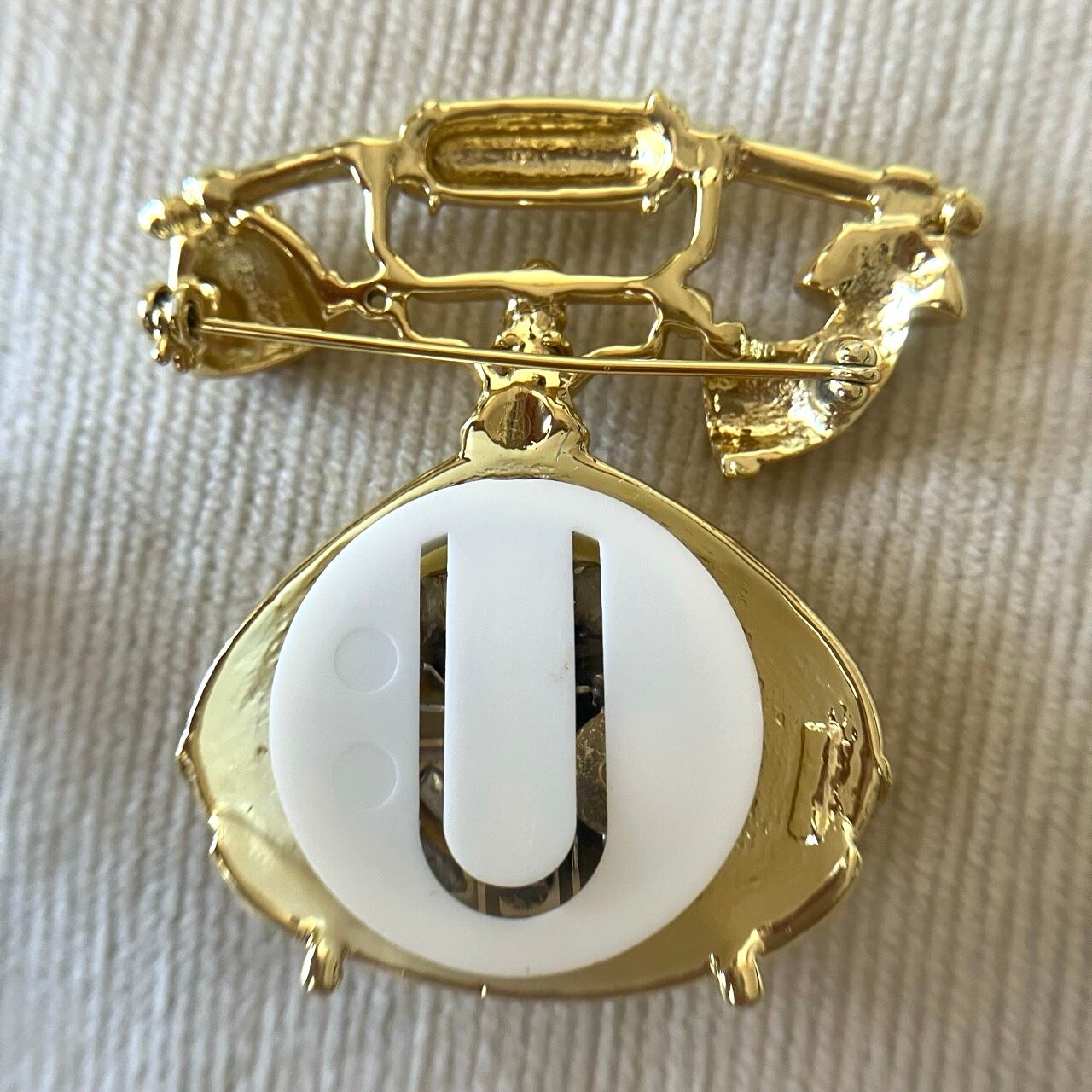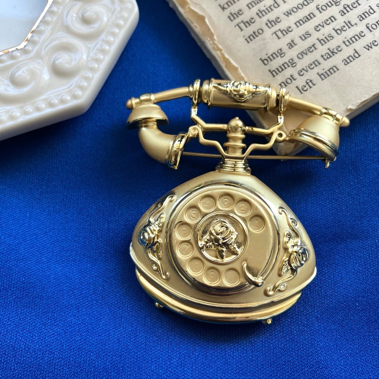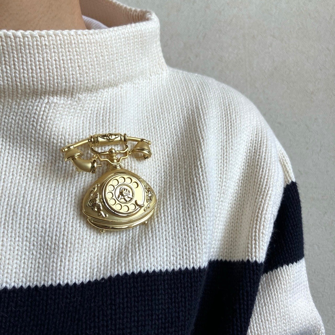 "AJC"のマットと艶のゴールドメタルの、クラシカルで美しい電話のデザインがとても素敵なヴィンテージブローチです。