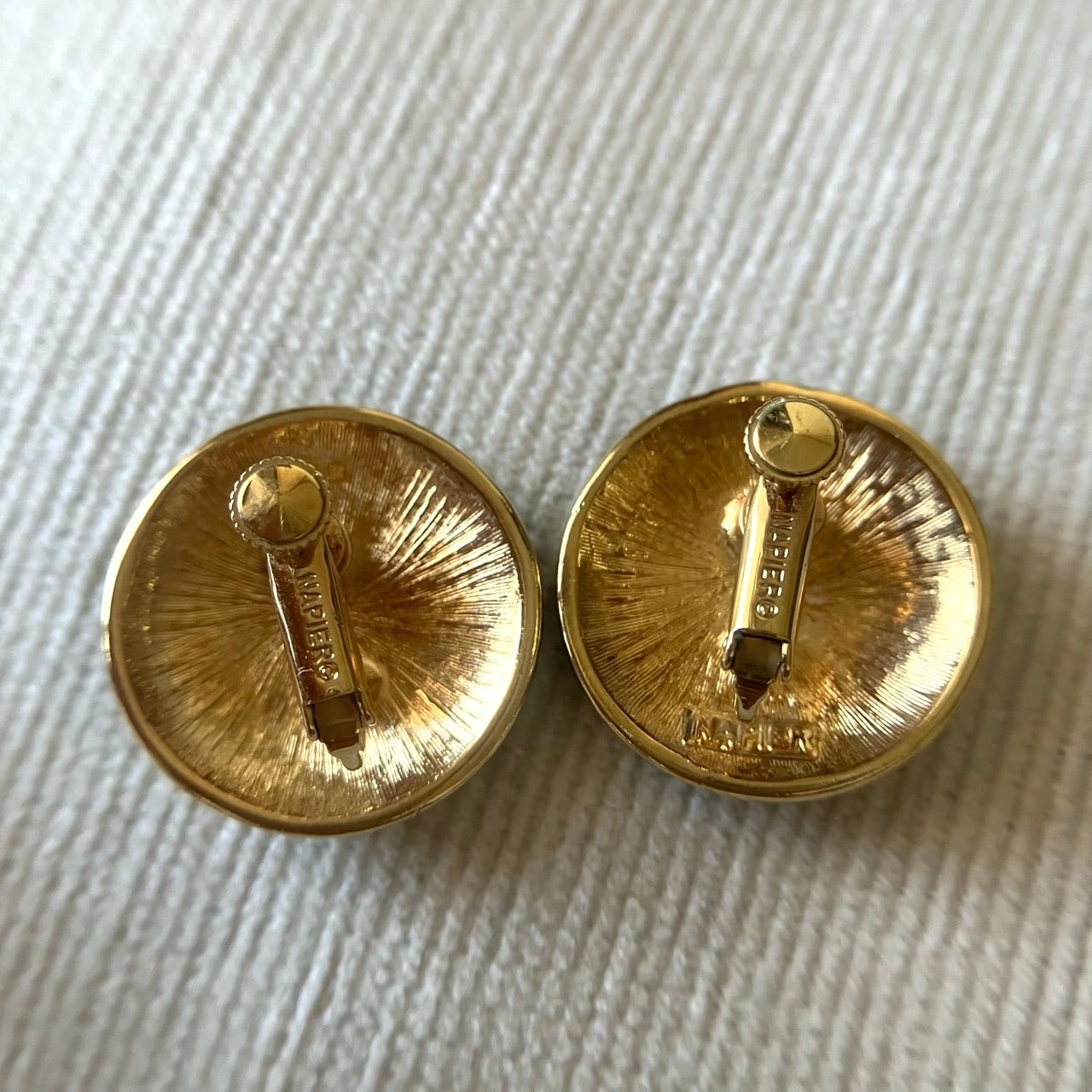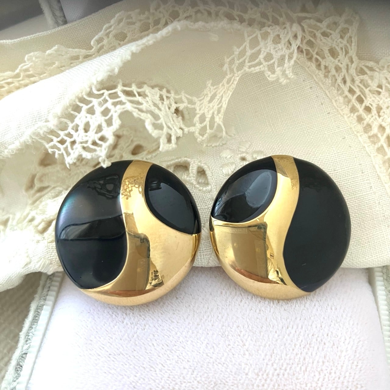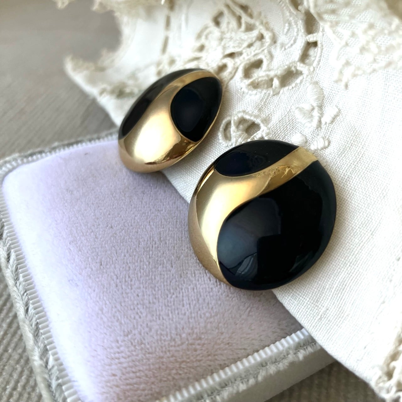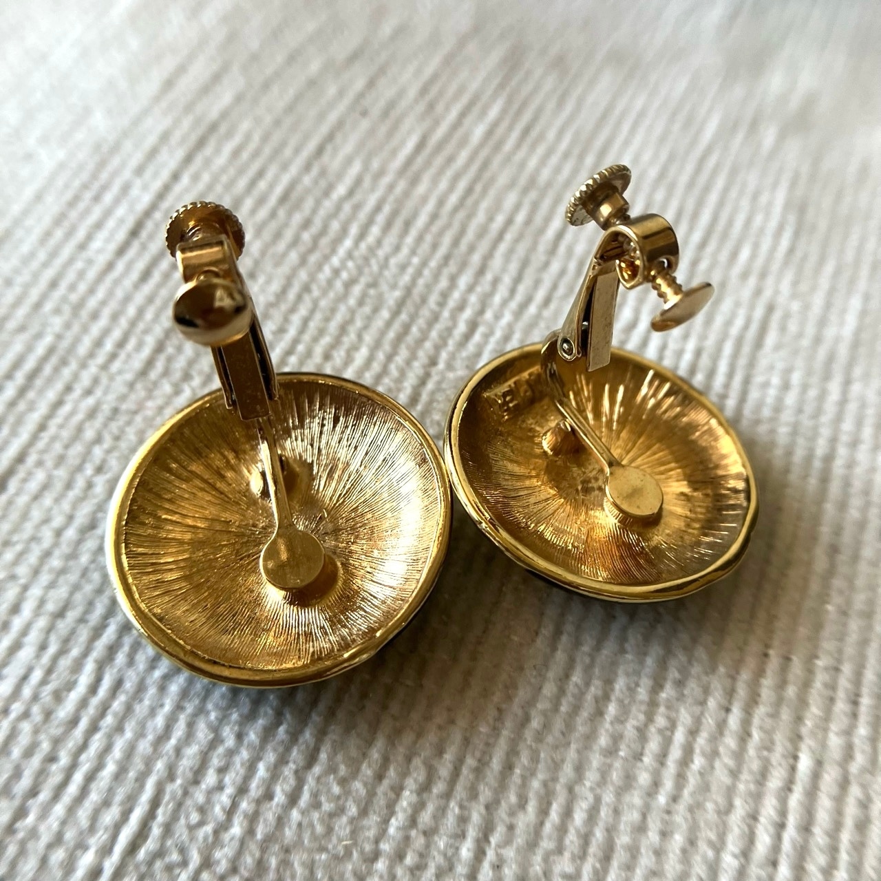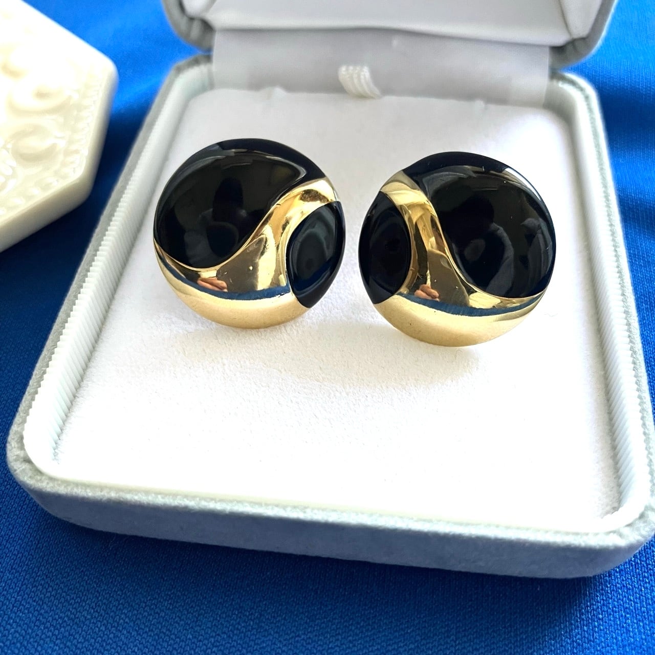 1875年にシルバージュエリーメーカーとして設立され、第一次世界大戦後よりコスチュームジュエリーも制作していた老舗のメーカー“Napier”(ネイピア)の、ゴールドメタルにブラックエナメルのモダンなラウンドデザインが、とても素敵なヴィンテージイヤリングです。