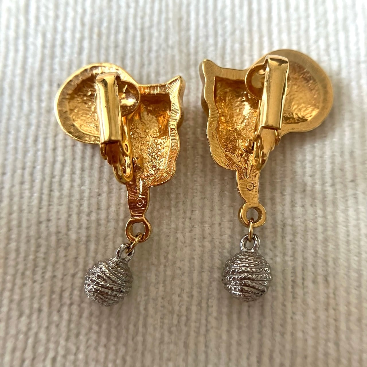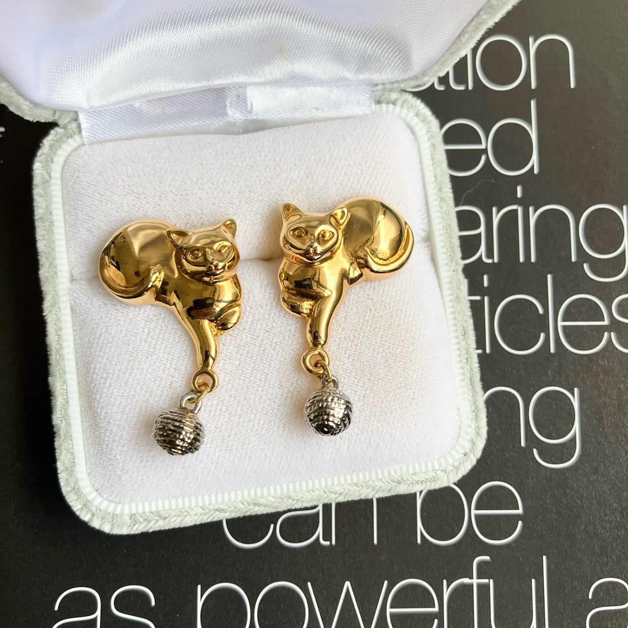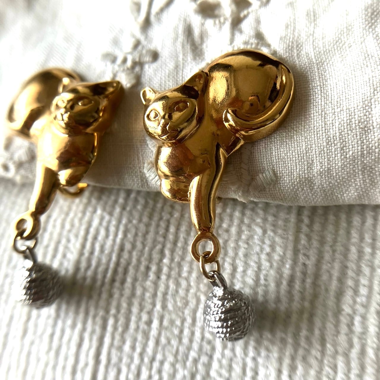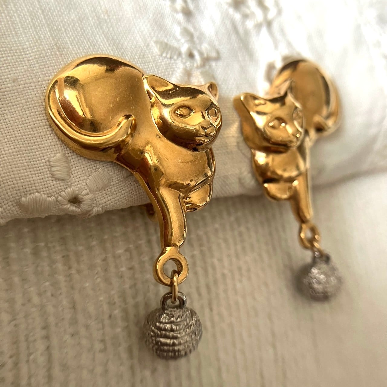 ゴールドメタルの愛らしい猫に、シルバーメタルの小さな毛糸玉が揺れるデザインが、ユニークでとても素敵な”AVON”(エイボン)のヴィンテージイヤリングです。