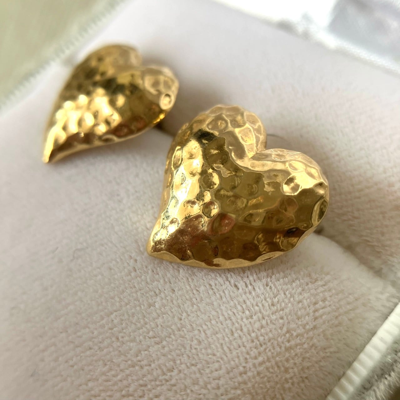 ゴールドメタルの表面が叩かれたようなハンマードメタルのハートデザインが、とても素敵な”AVON”(エイボン)のヴィンテージピアスです。