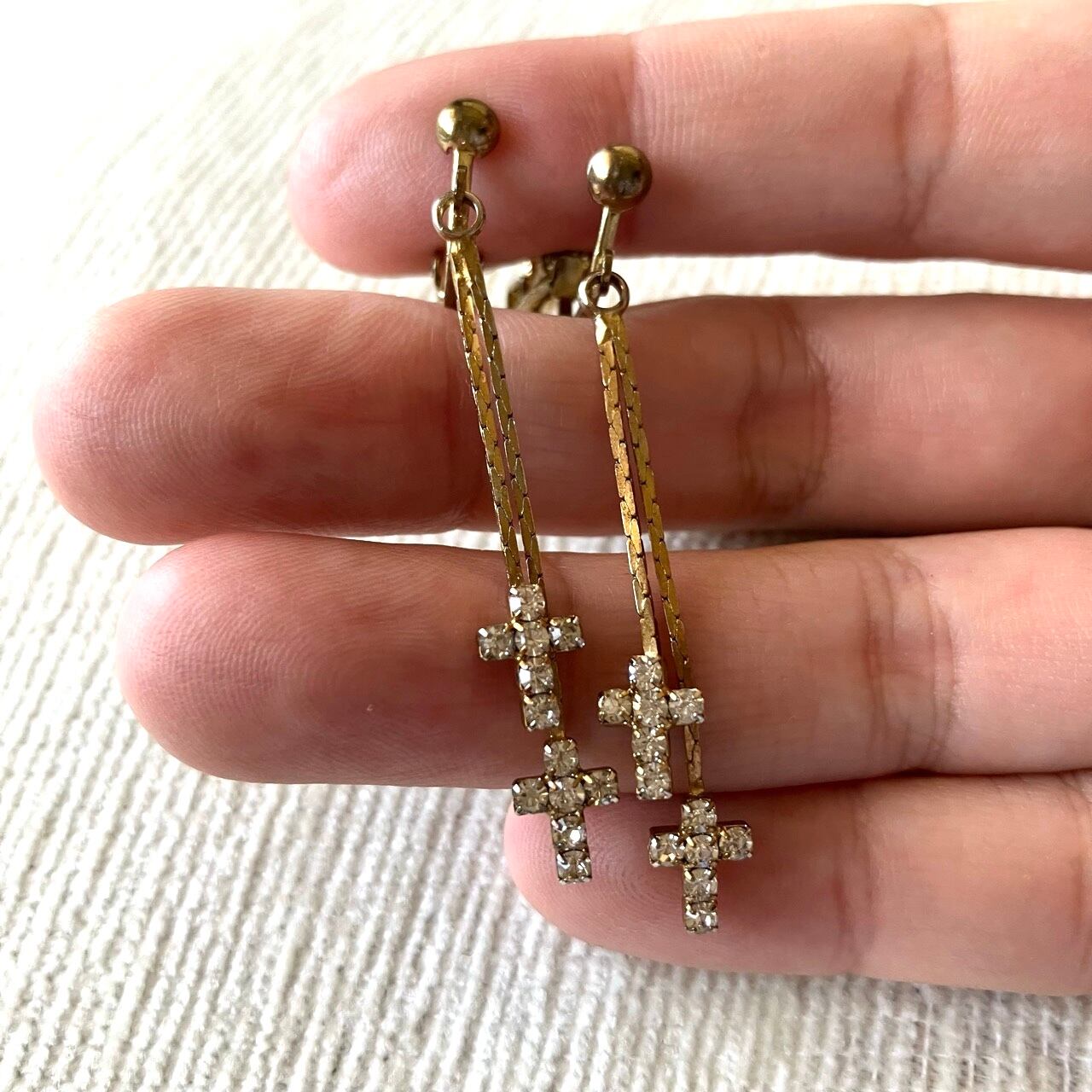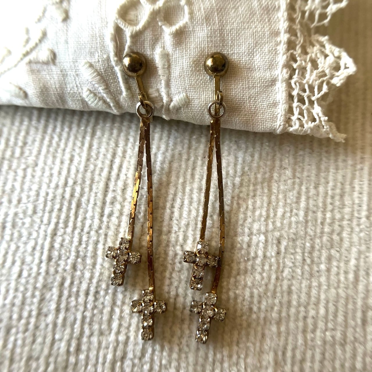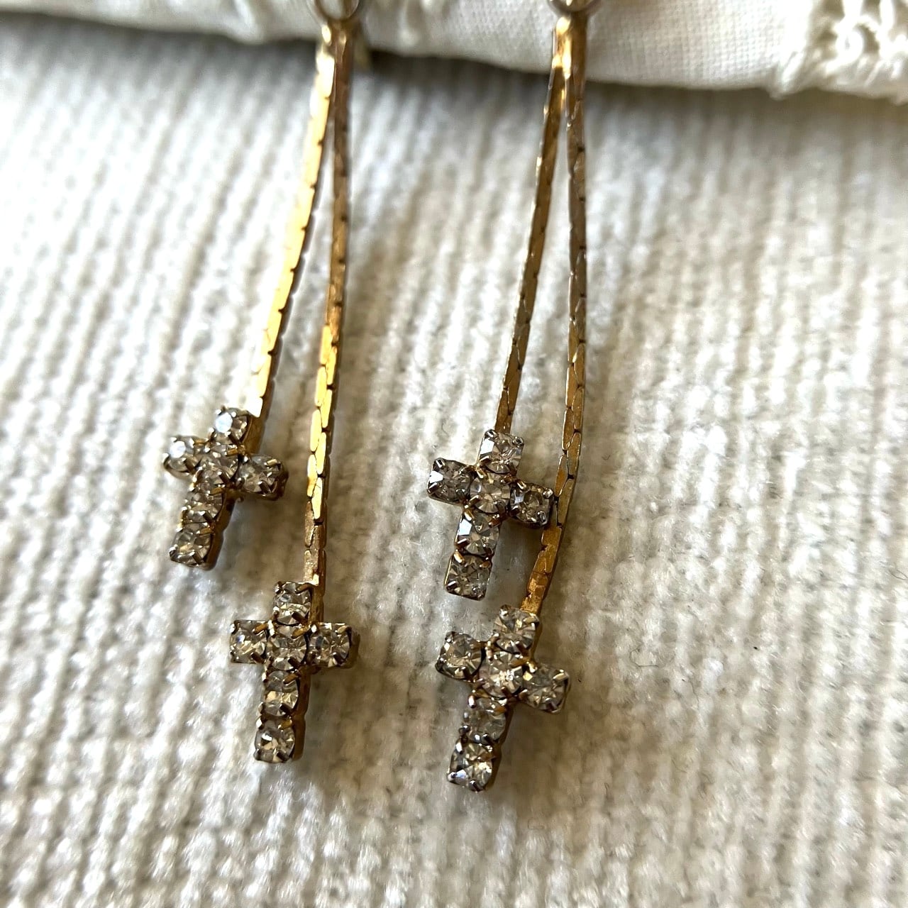 小さなクリアラインストーンのクロスが2つ、フラットチェーンの先で揺れる、ヴィンテージらしい雰囲気のあるデザインが、とてもお洒落で素敵なヴィンテージイヤリングです。