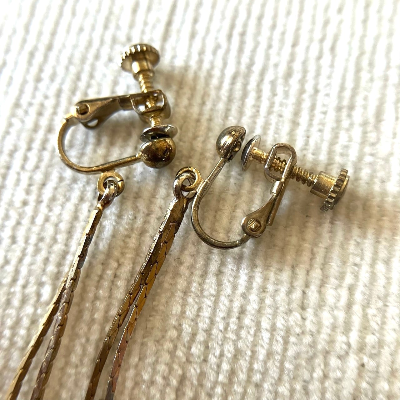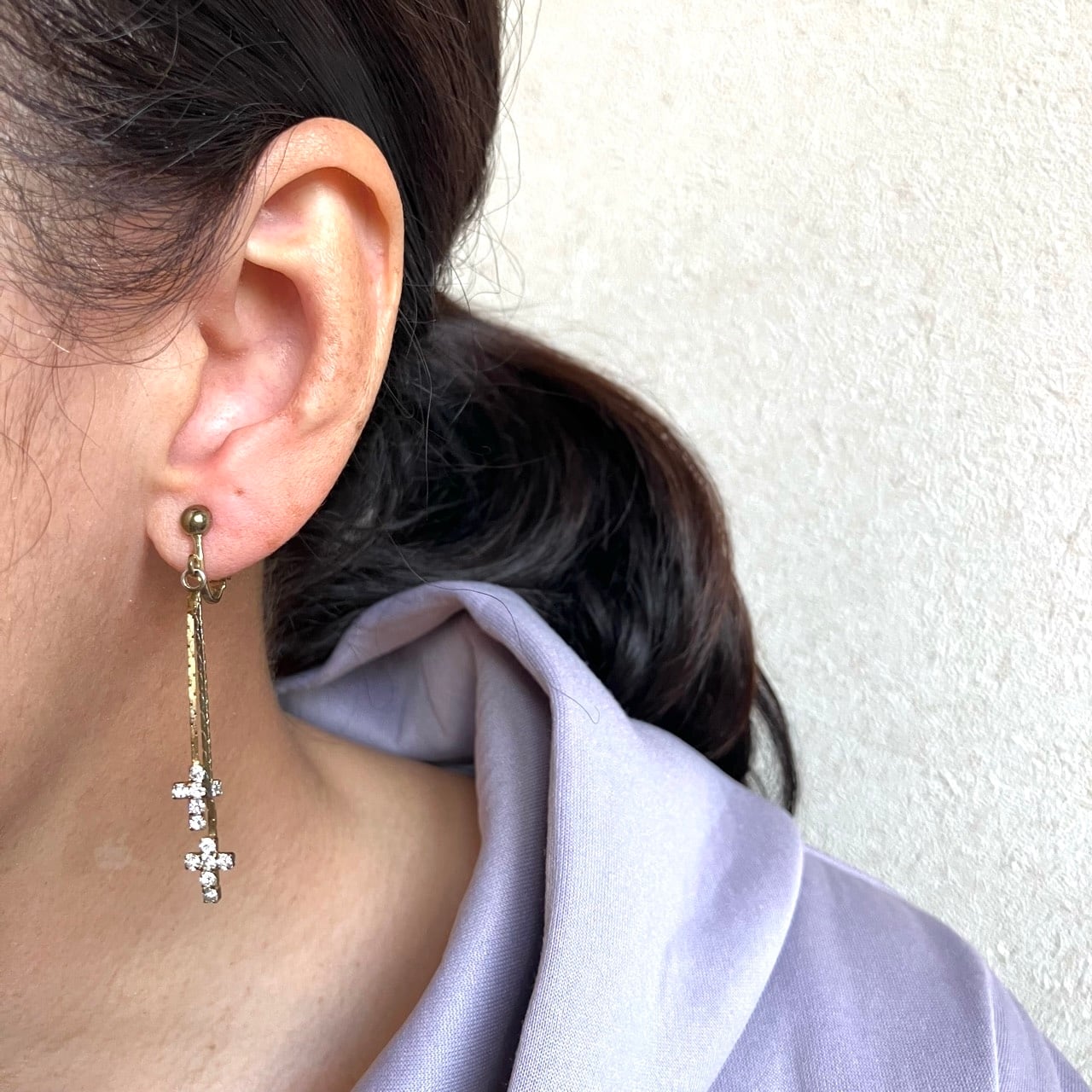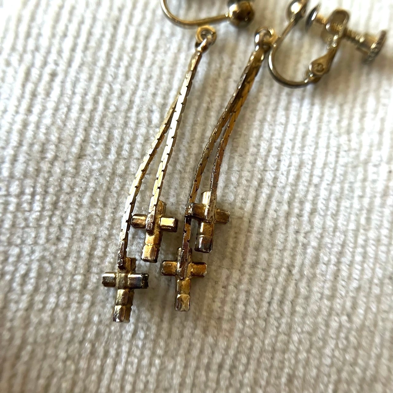 小さなクリアラインストーンのクロスが2つ、フラットチェーンの先で揺れる、ヴィンテージらしい雰囲気のあるデザインが、とてもお洒落で素敵なヴィンテージイヤリングです。