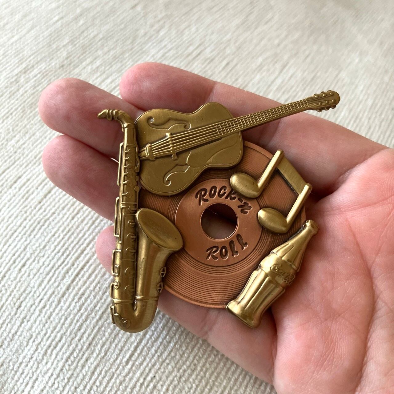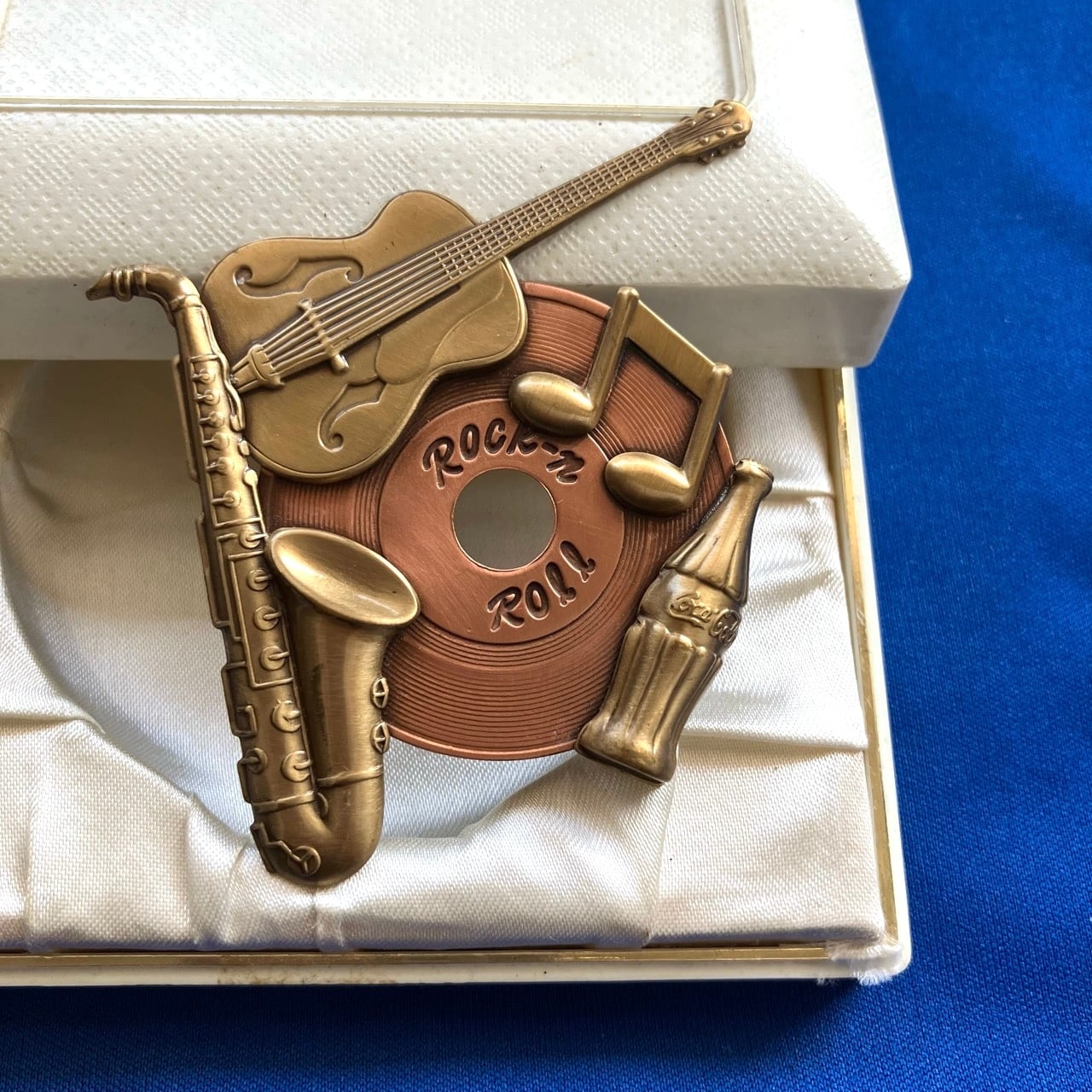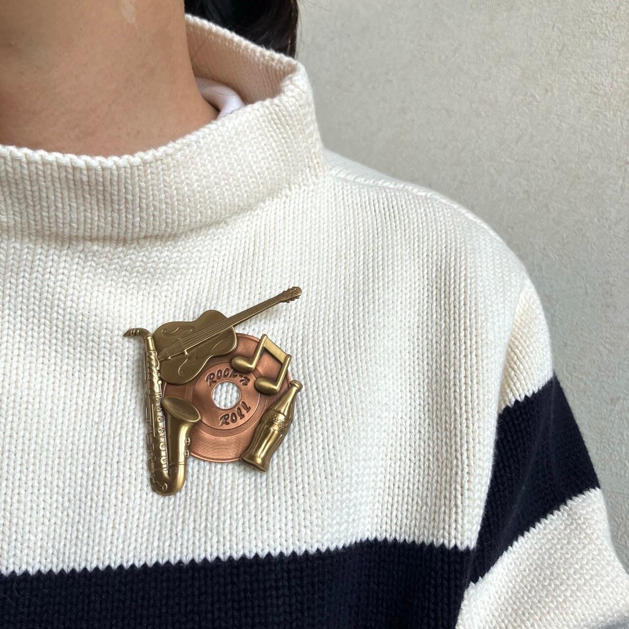 マットなゴールド&コパーのメタルの色合いの違いがユニークな、楽器やレコード、音符やコーラのデザインが、とてもスペシャルで素敵なヴィンテージブローチです。