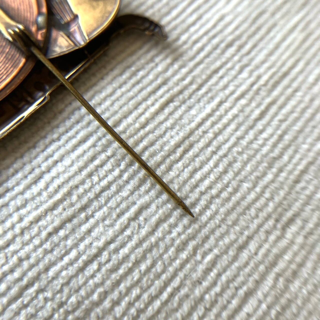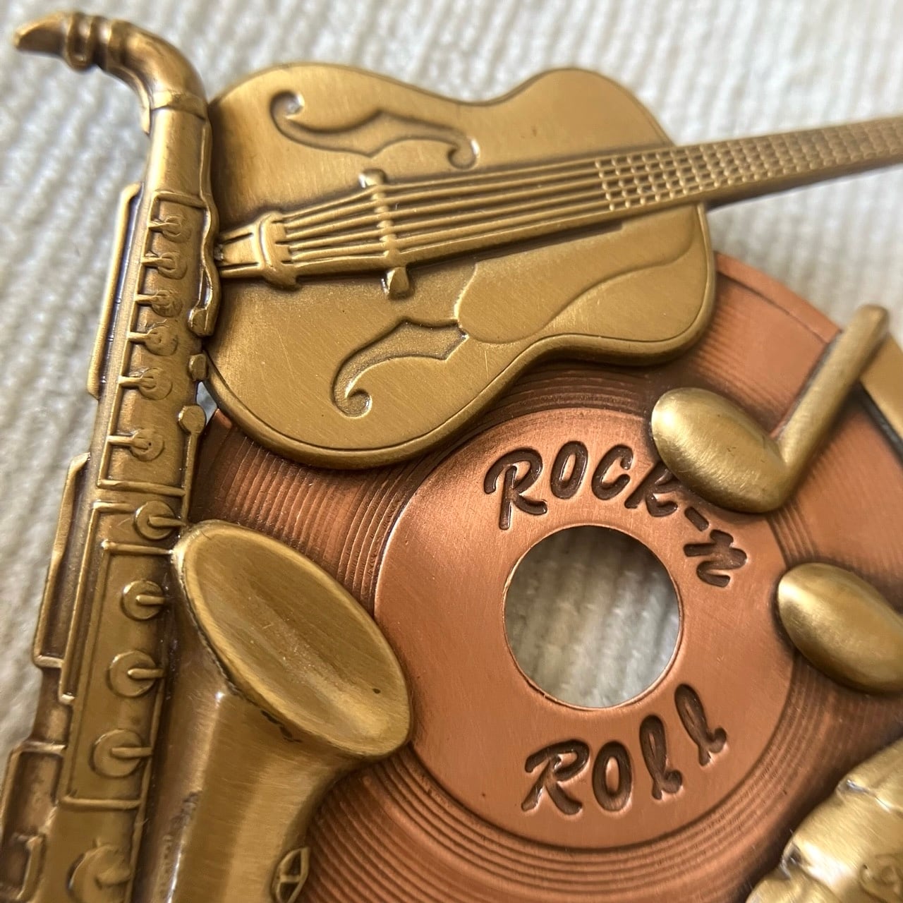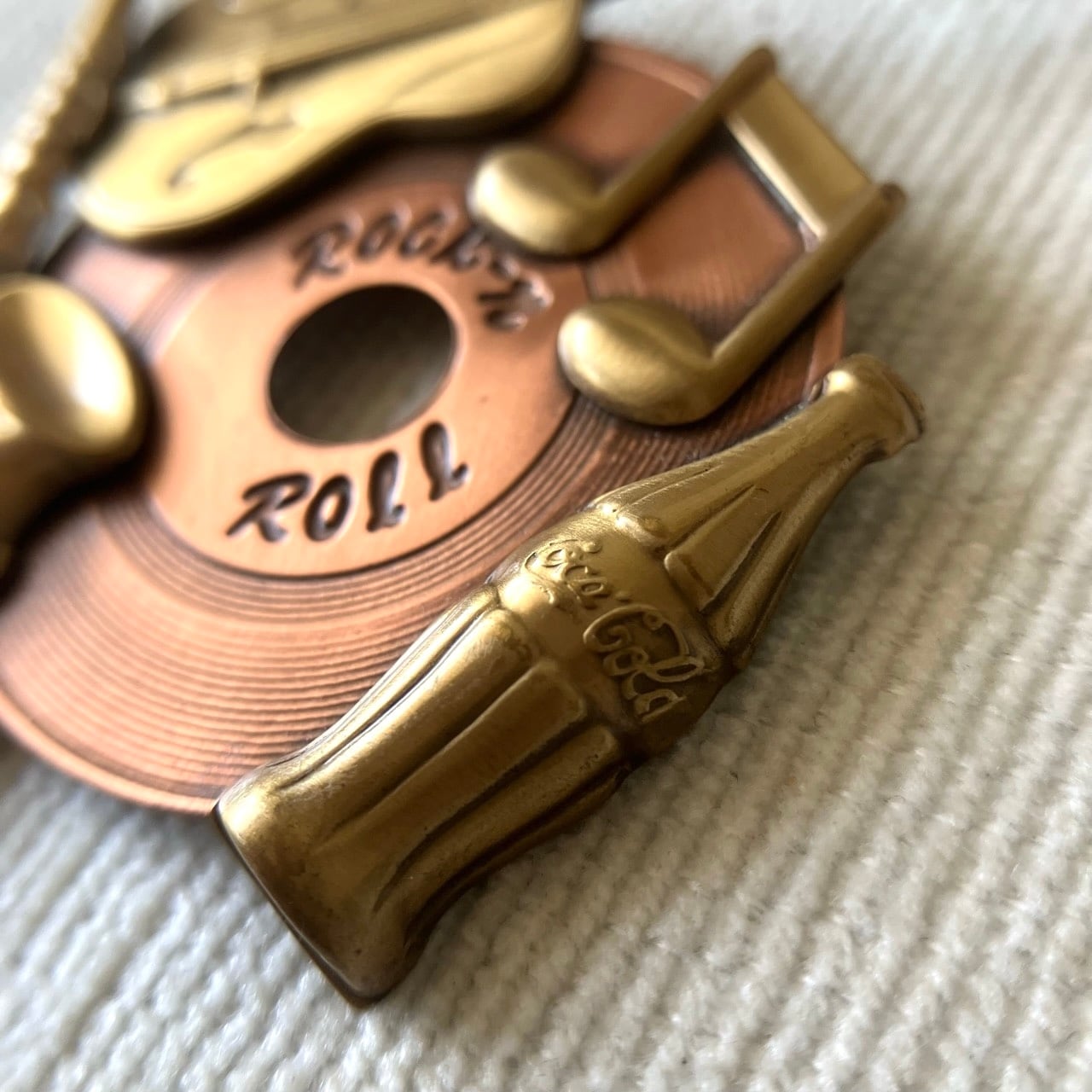 マットなゴールド&コパーのメタルの色合いの違いがユニークな、楽器やレコード、音符やコーラのデザインが、とてもスペシャルで素敵なヴィンテージブローチです。