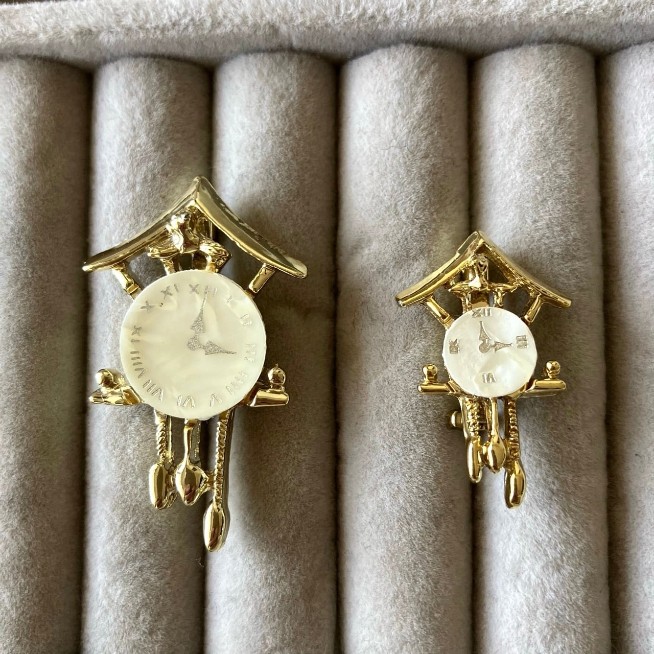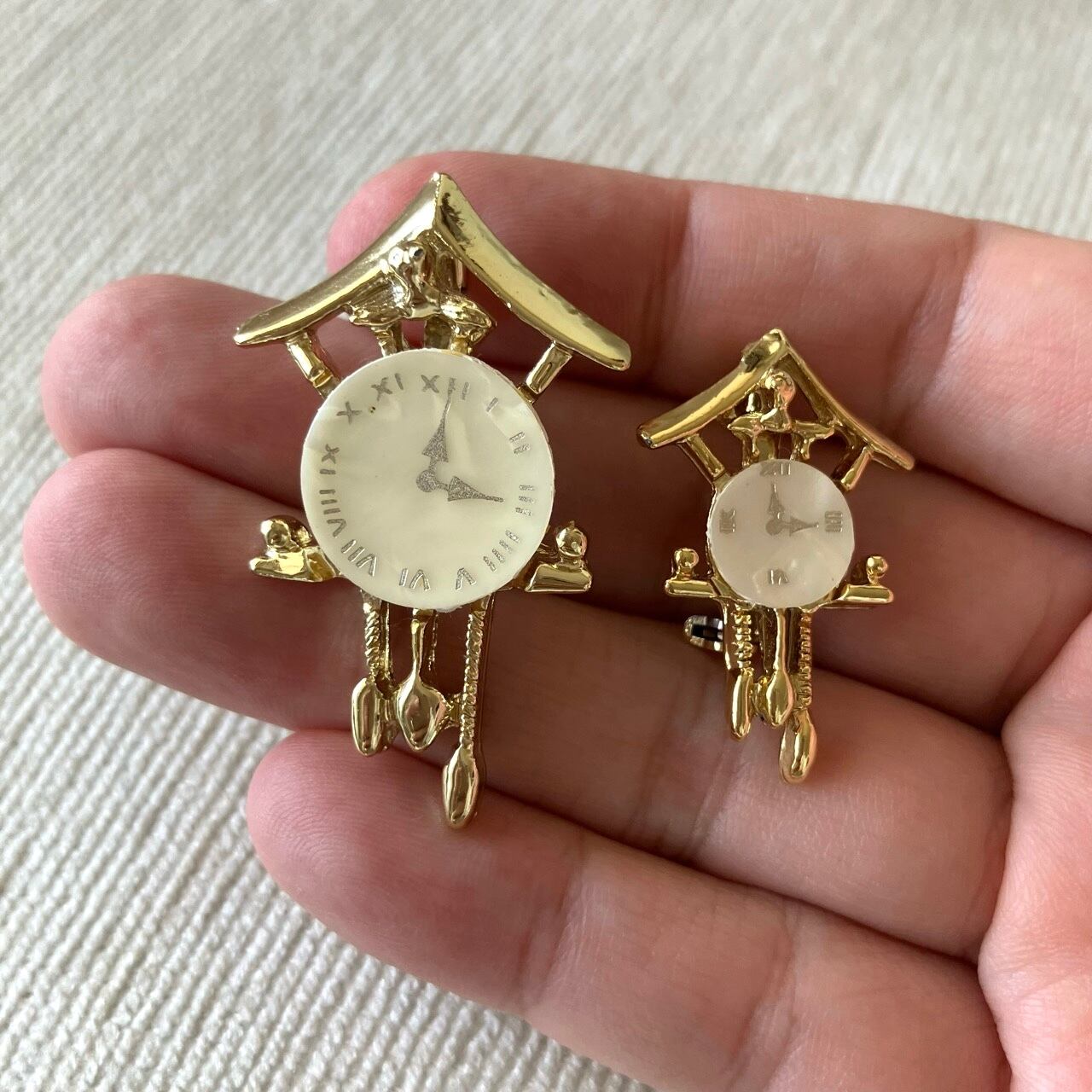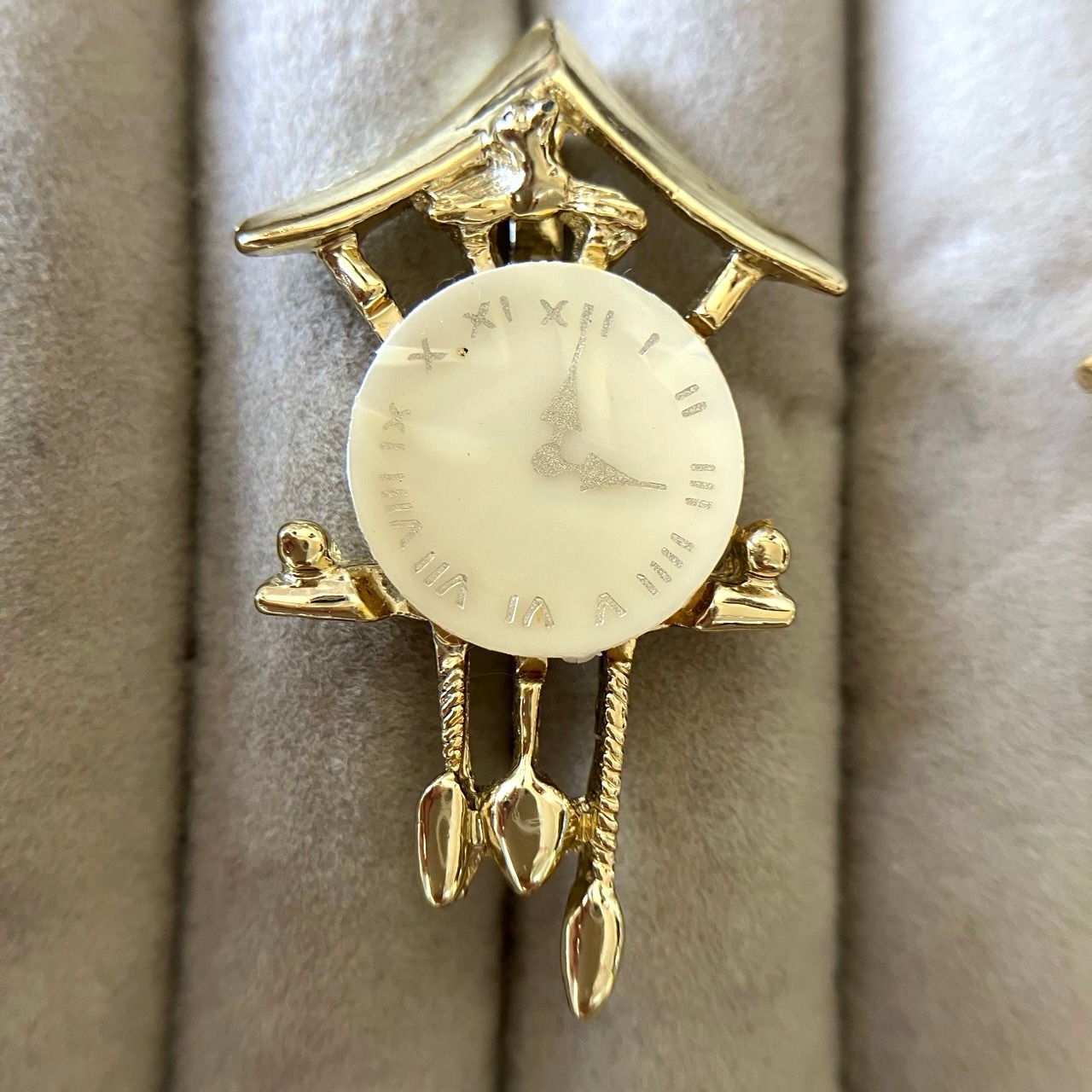 ゴールドメタルにマザーオブパールのプレートが組み合わされた鳩時計のデザインが、とても素敵なヴィンテージブローチです。
