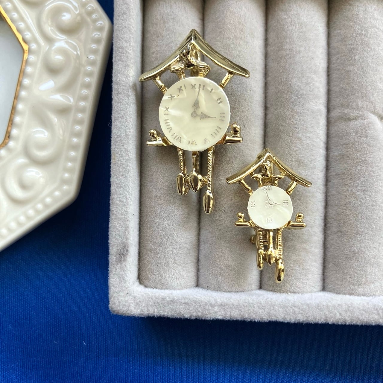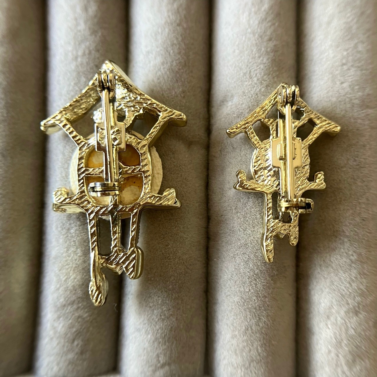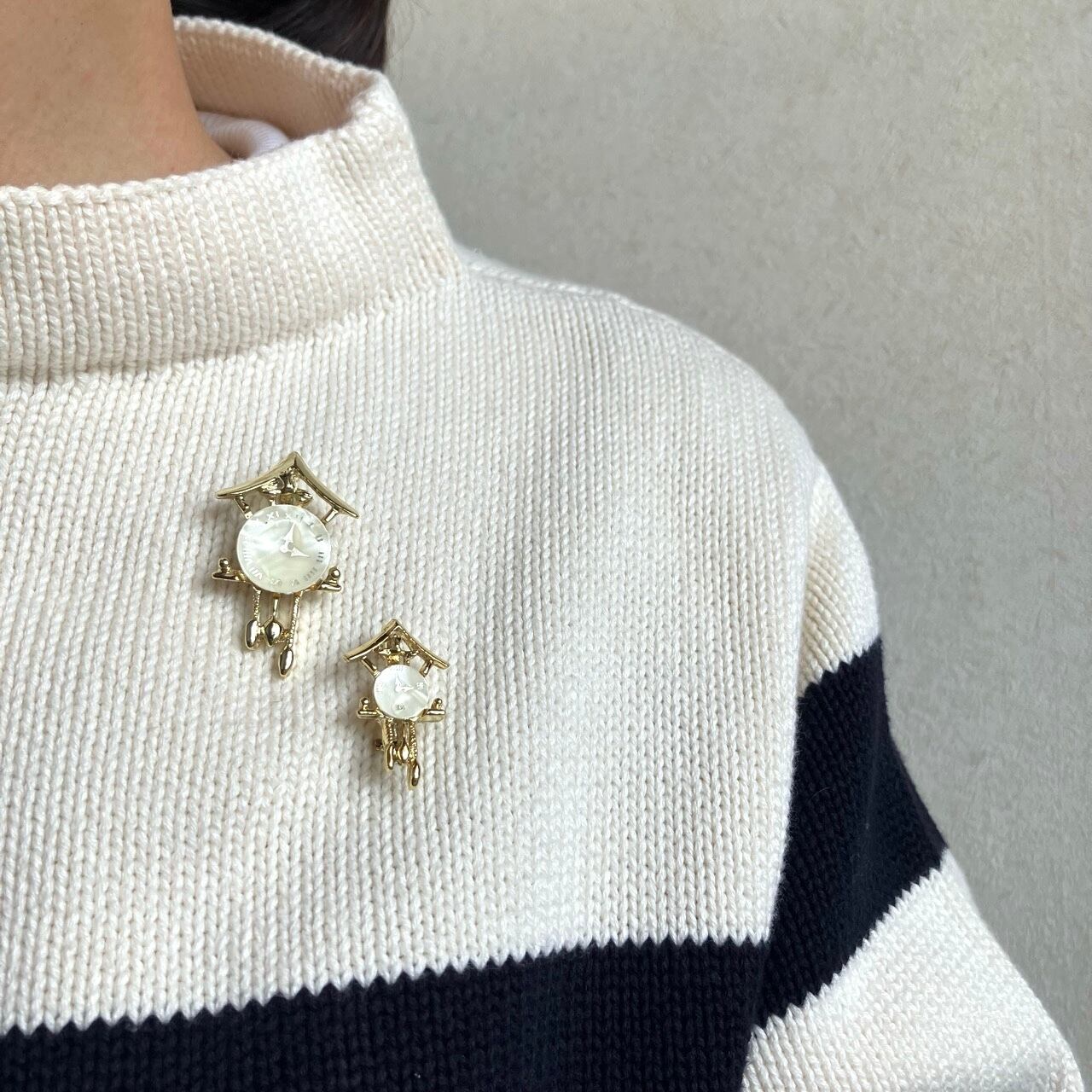 ゴールドメタルにマザーオブパールのプレートが組み合わされた鳩時計のデザインが、とても素敵なヴィンテージブローチです。