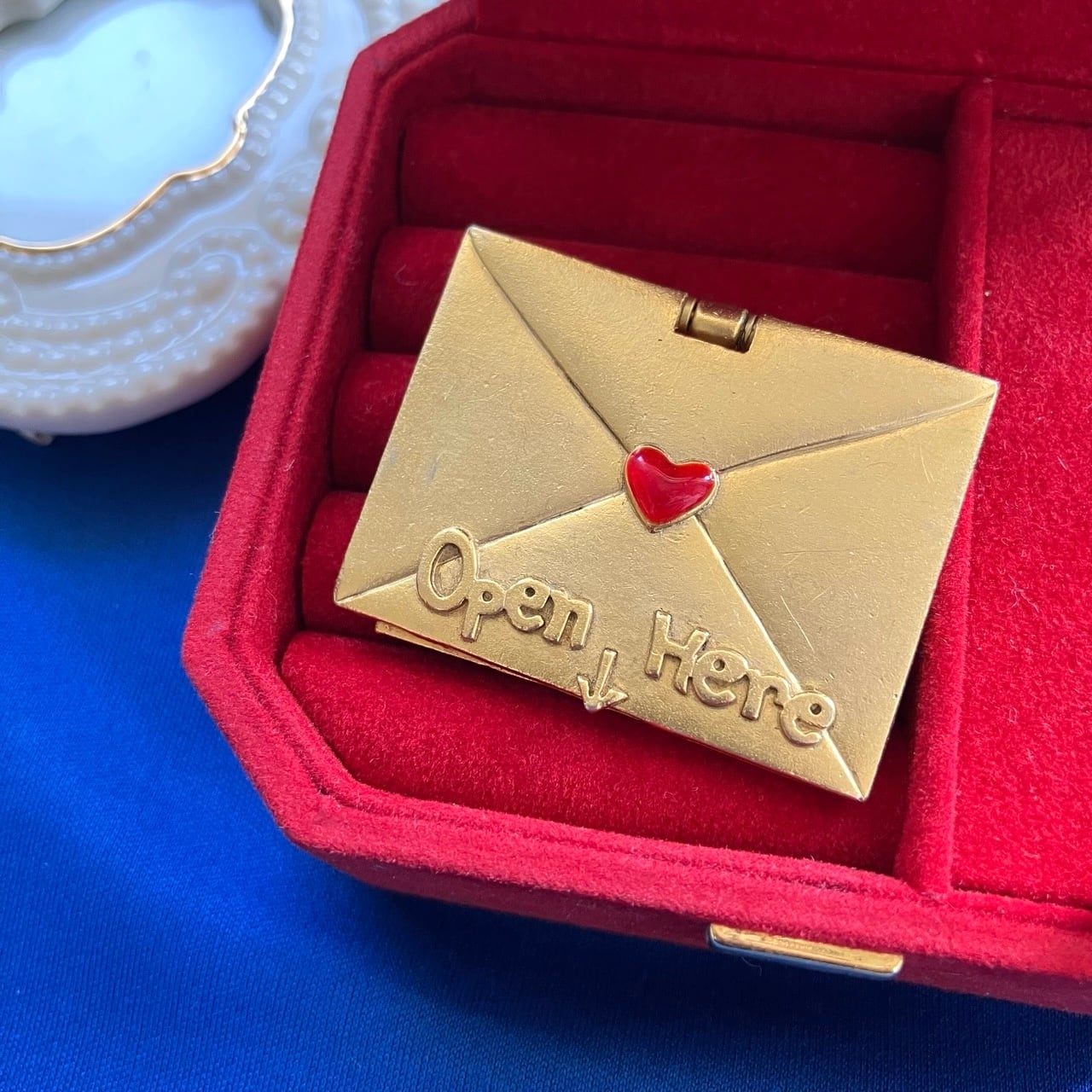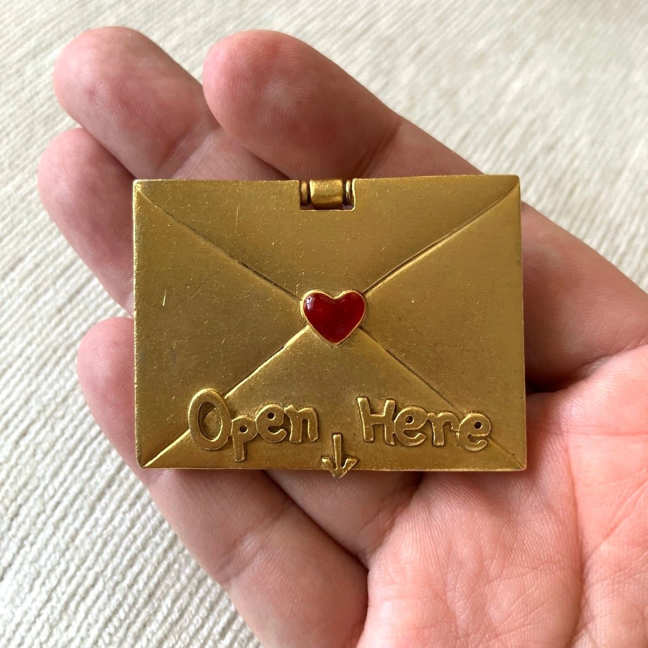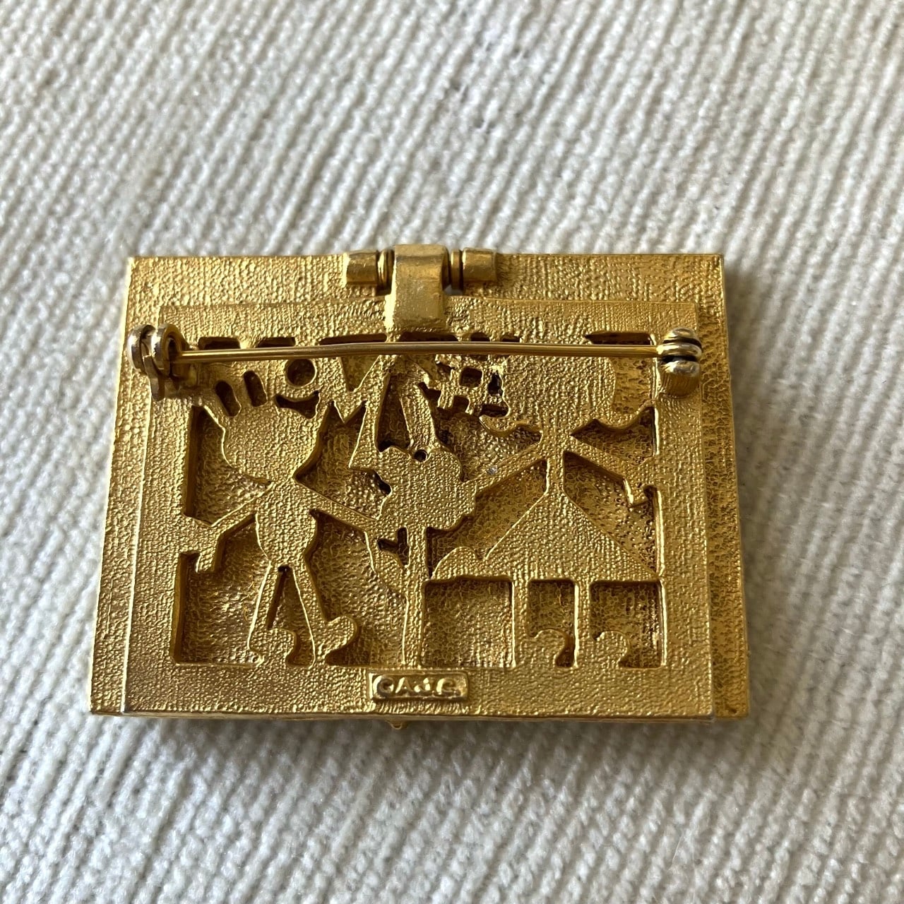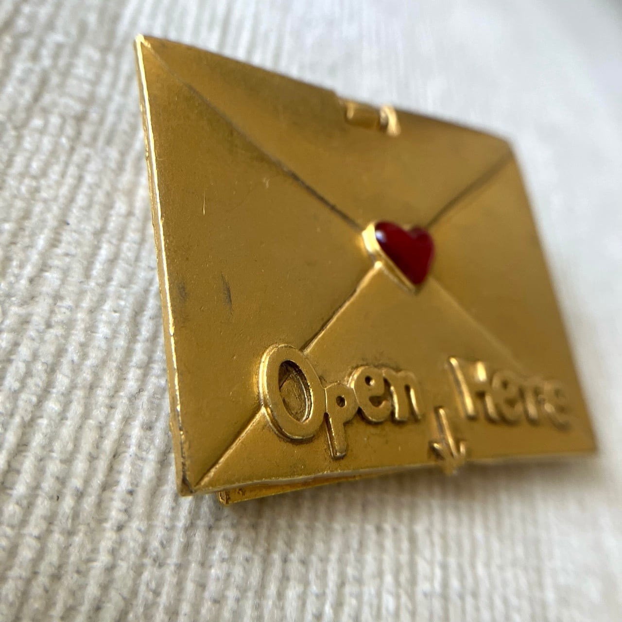 "AJC"のマットなゴールドメタルに赤いエナメルハートがアクセントになった、手紙の部分を蓋のように持ち上げると中に母の日のカードが入ったようなデザインが、ユニークでとても素敵なヴィンテージブローチです。