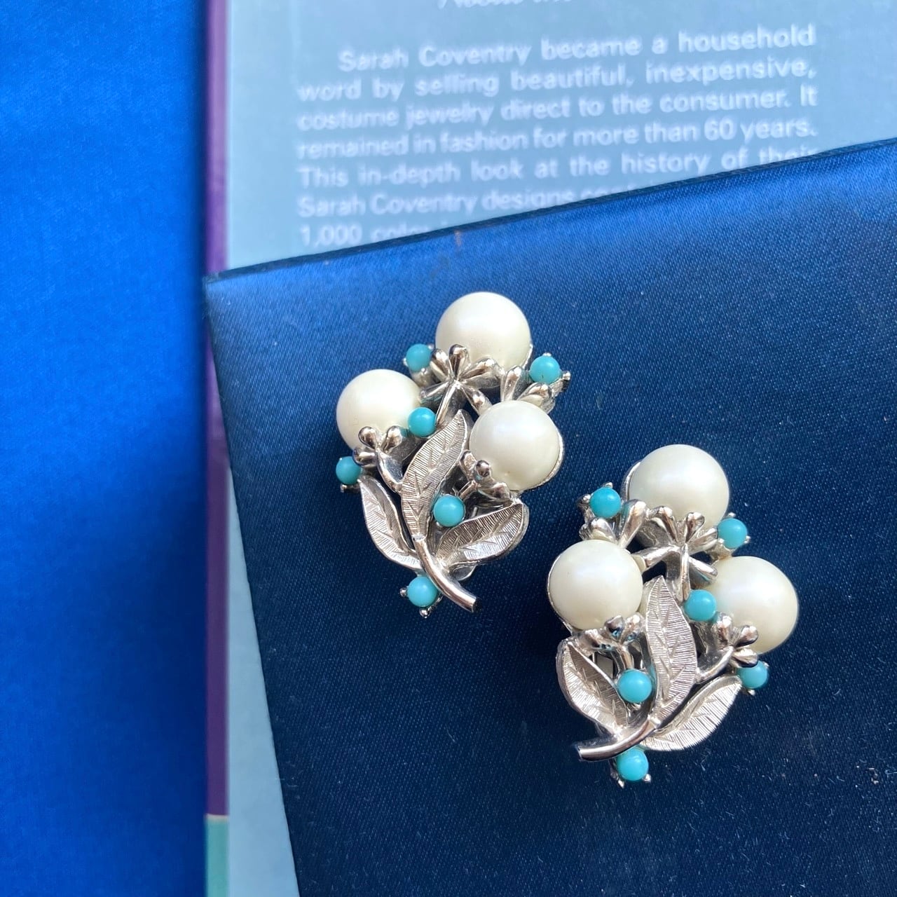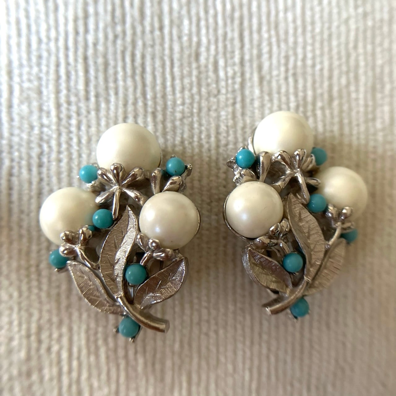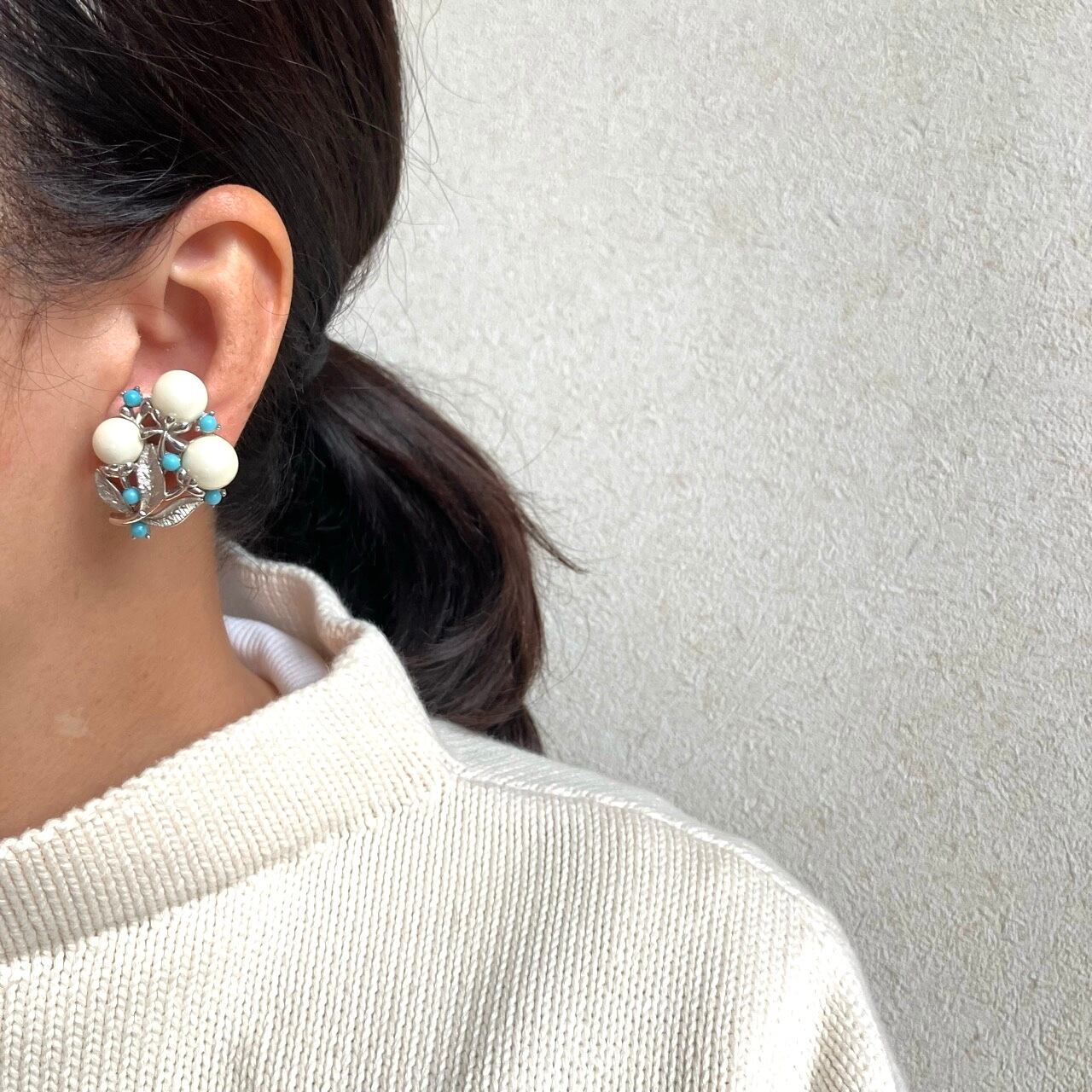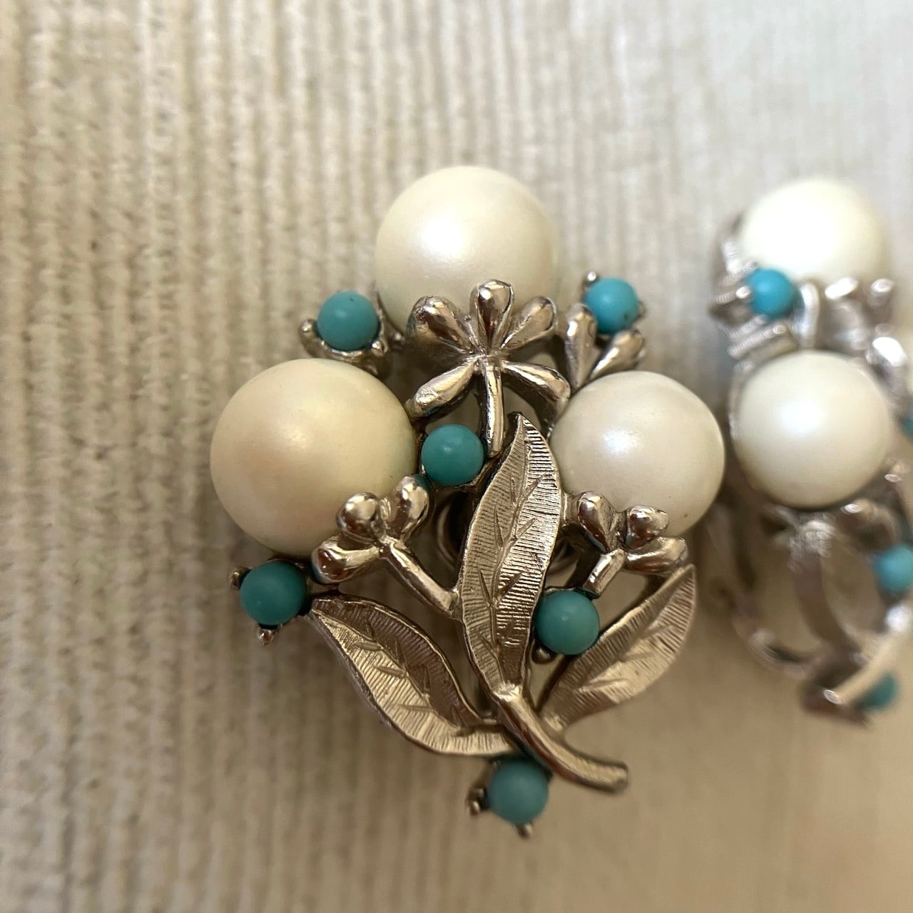 1949年に設立されたジュエリーメーカー”Sarah Coventry”(サラコベントリー )の、シルバーメタルの土台に、ややマット感のある大粒のパールビーズと小粒のターコイズビーズがセットされた、装飾的でヴィンテージらしいボタニカルなデザインがとても素敵なイヤリングです。