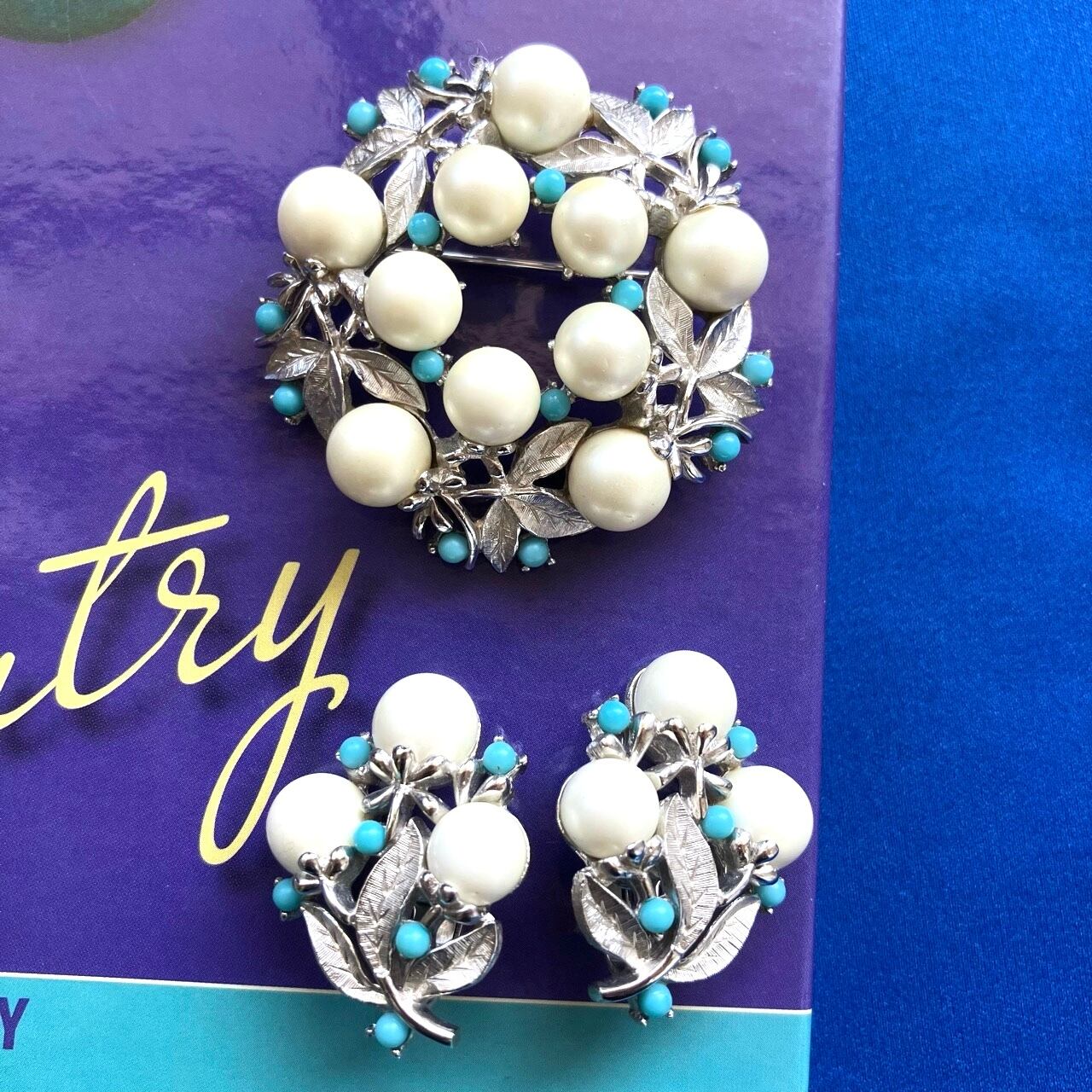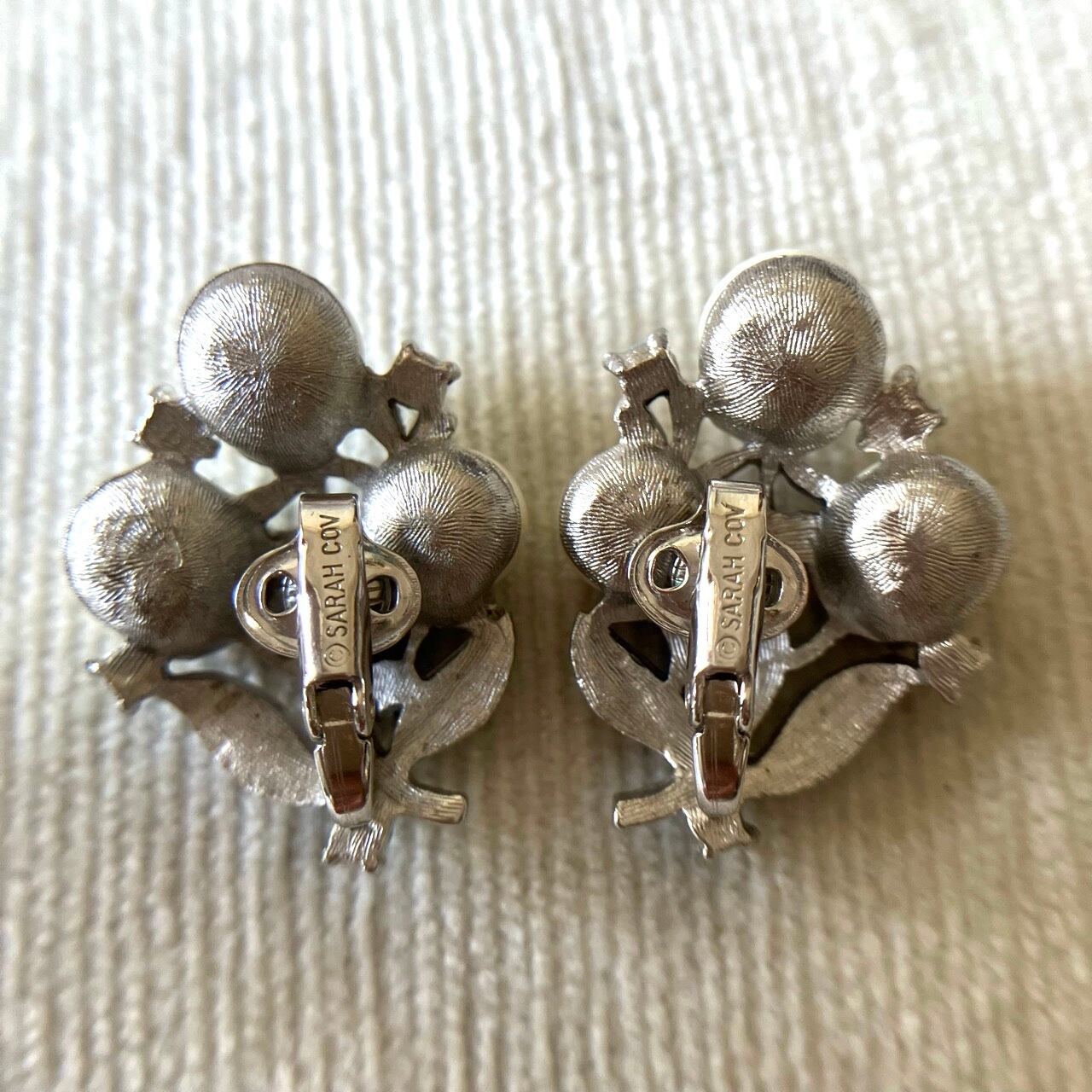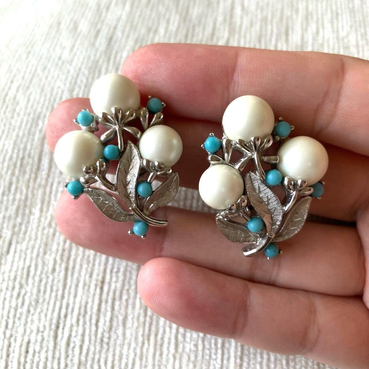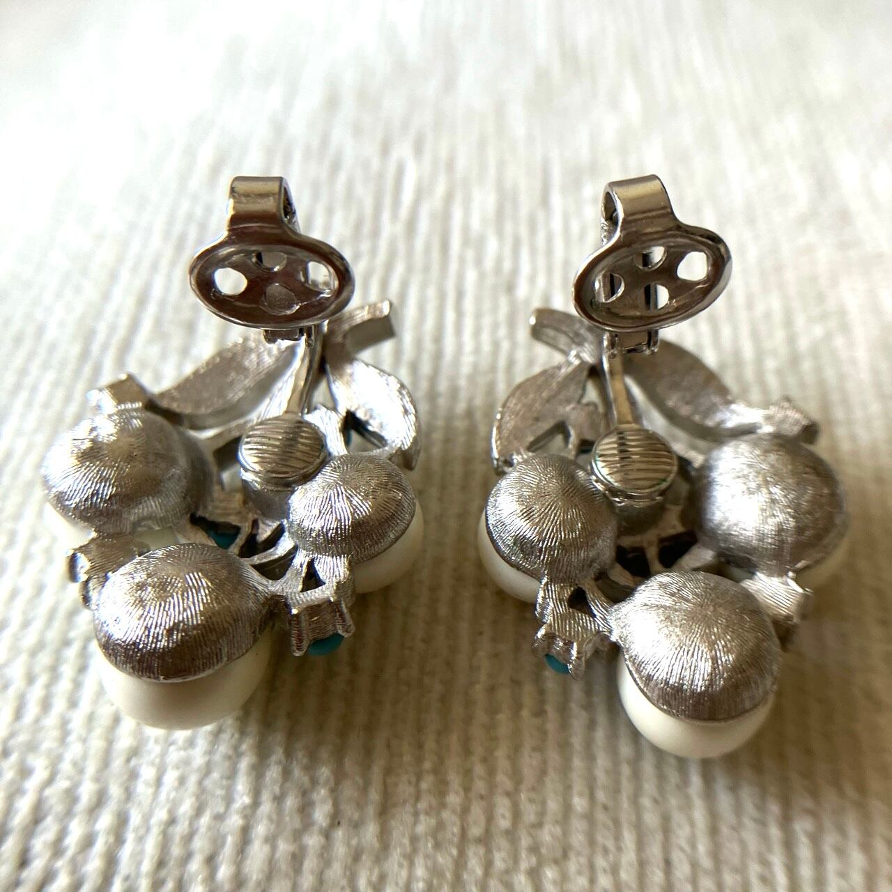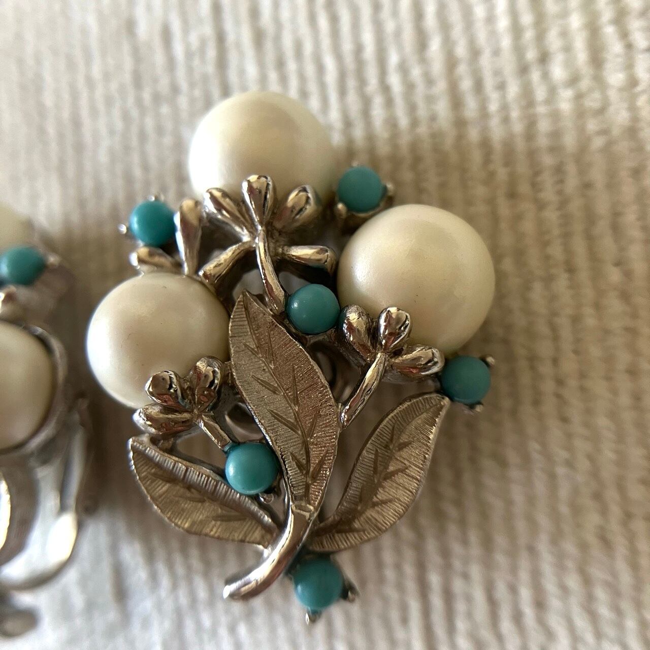 1949年に設立されたジュエリーメーカー”Sarah Coventry”(サラコベントリー )の、シルバーメタルの土台に、ややマット感のある大粒のパールビーズと小粒のターコイズビーズがセットされた、装飾的でヴィンテージらしいボタニカルなデザインがとても素敵なイヤリングです。