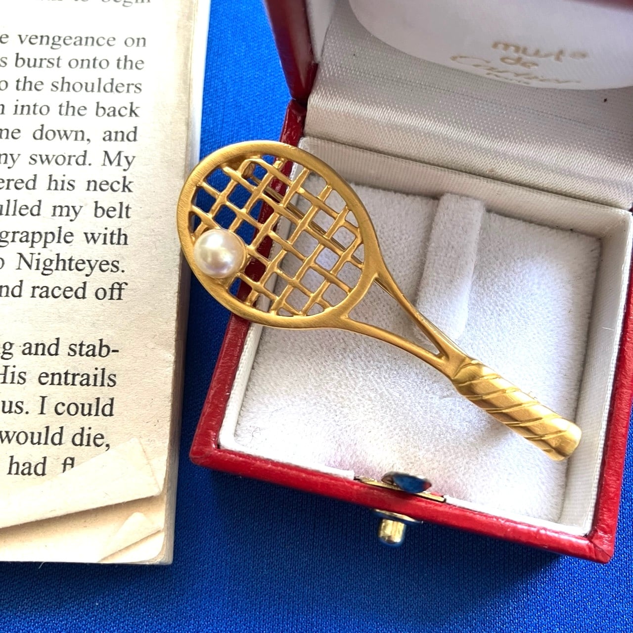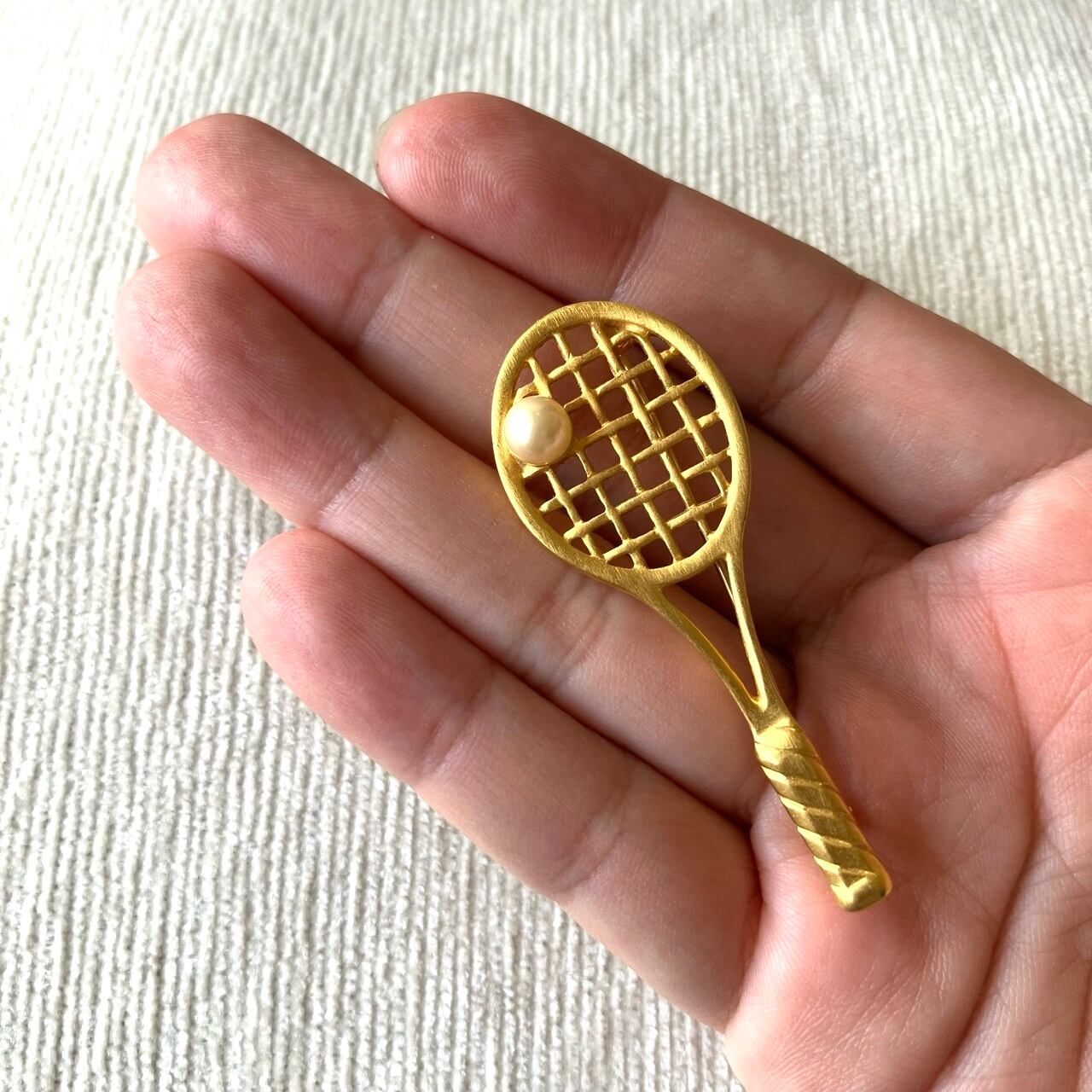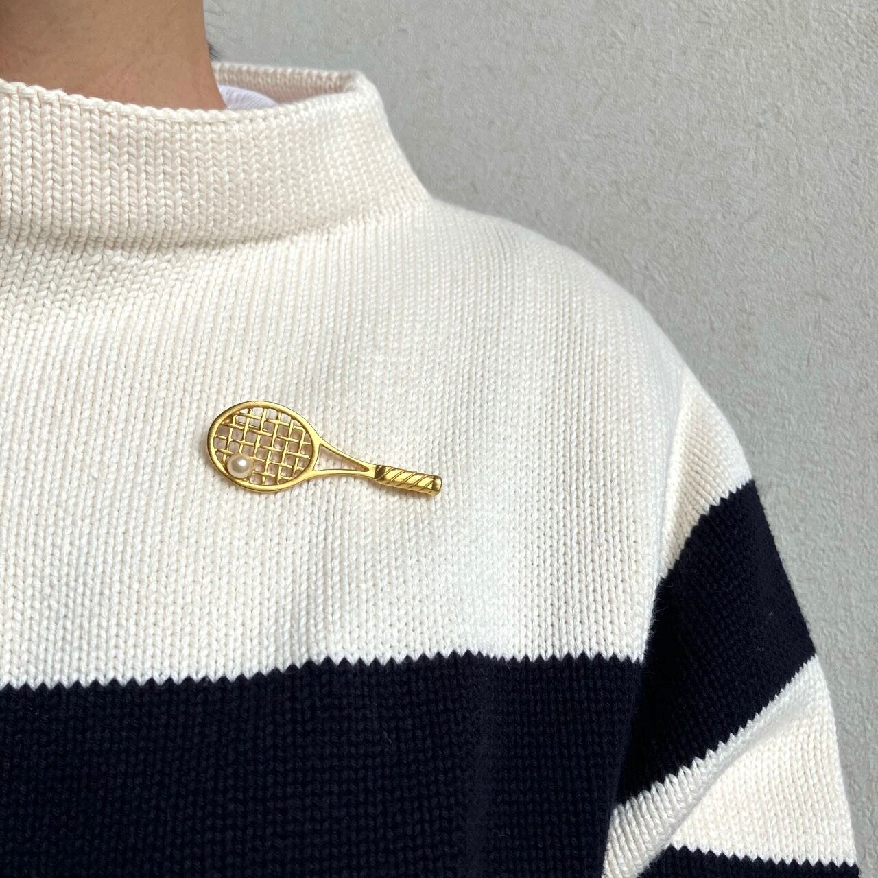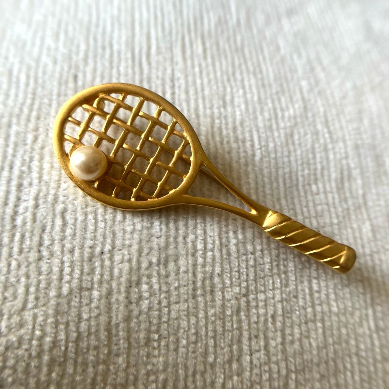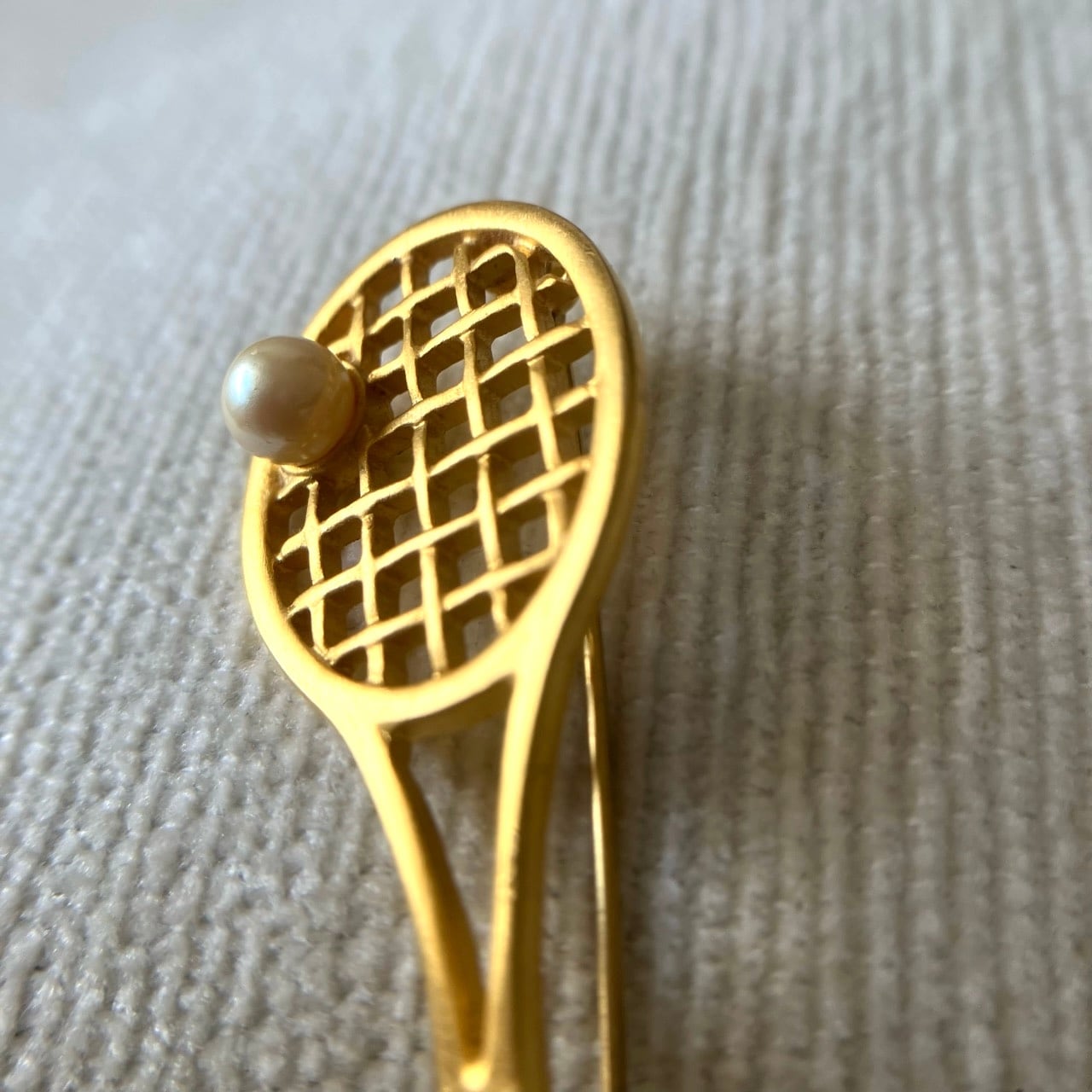 ゴールドメタルにパールのボールがアクセントになったテニスラケットのデザインが、とても素敵な”AVON”(エイボン)のヴィンテージブローチです。