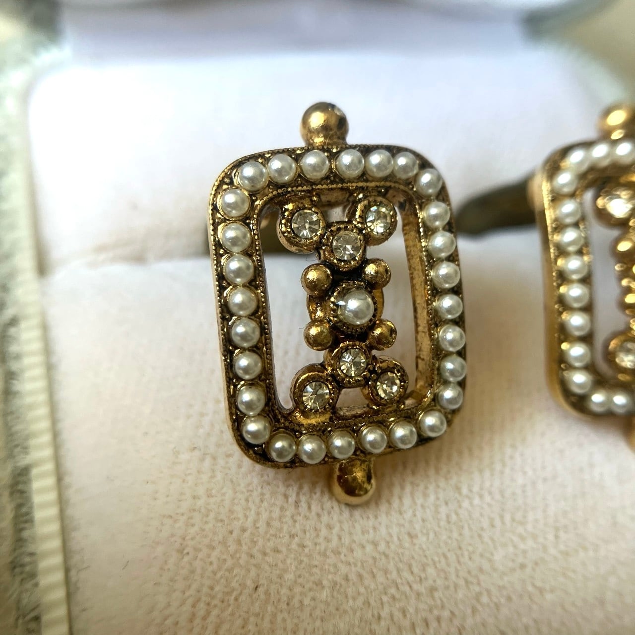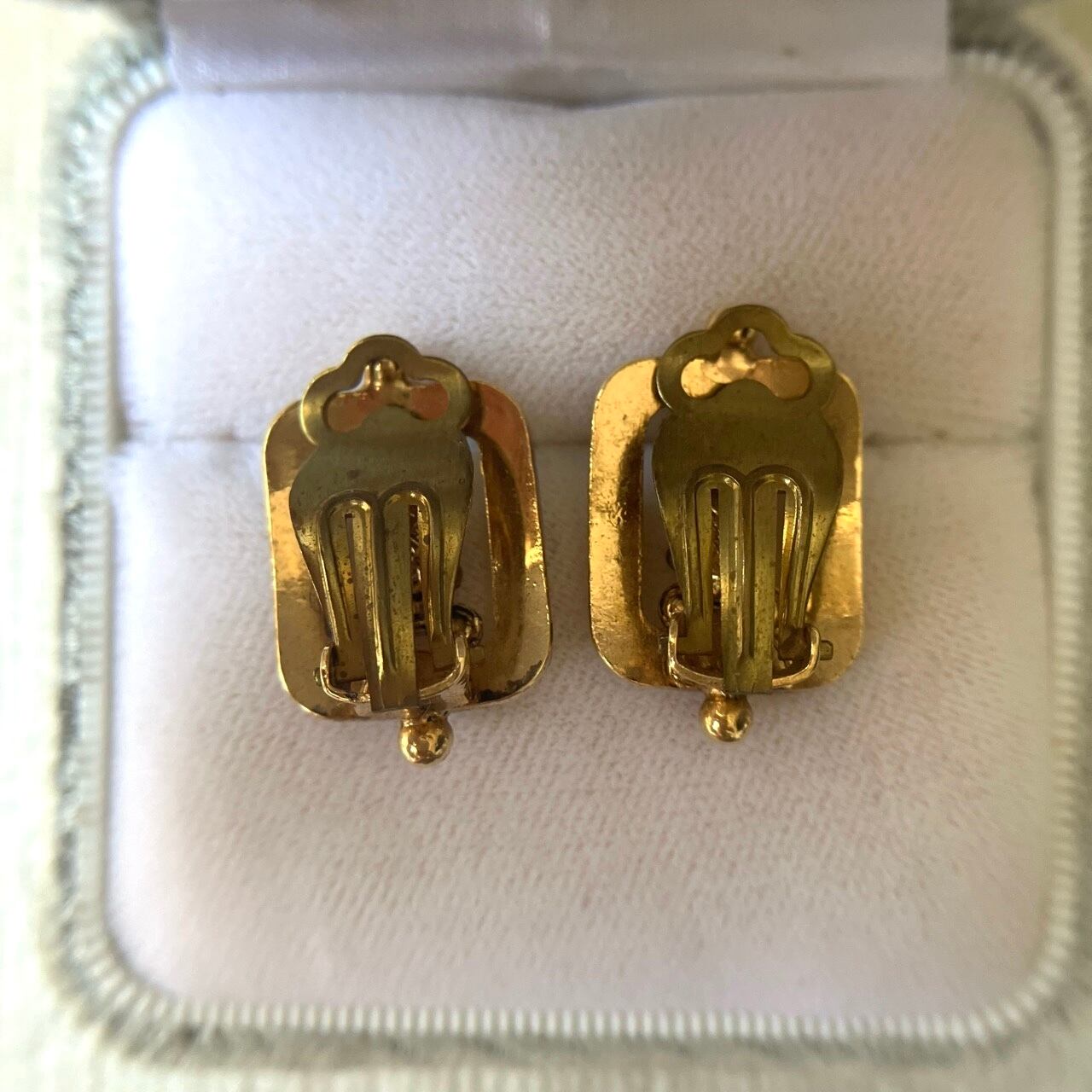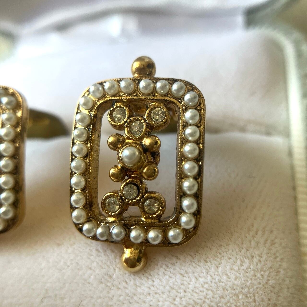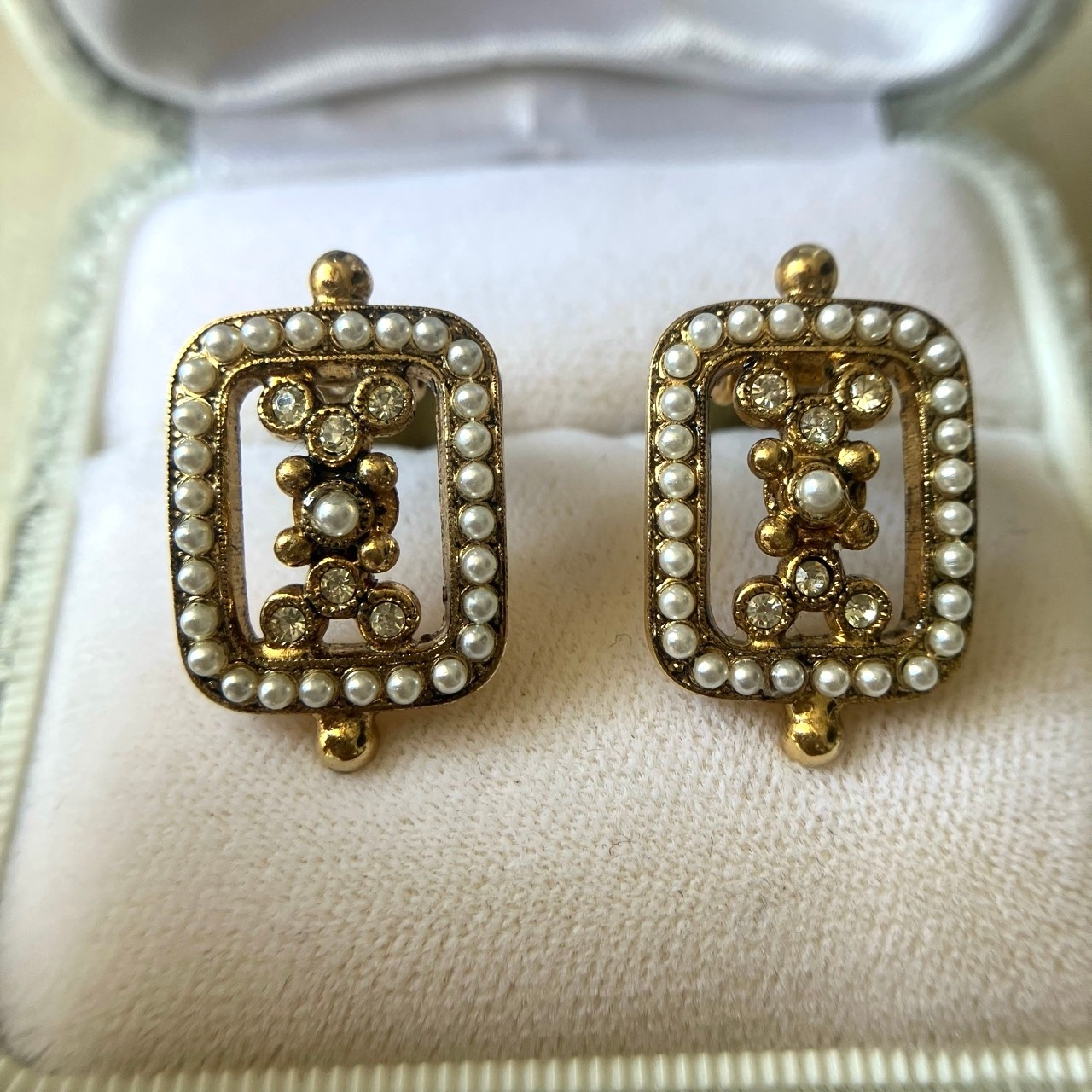 落ち着いたゴールドメタルの長方形のフレームに、雰囲気のある小粒のパールビーズとクリアラインストーンがセットされた細やかなデザインが、とても素敵な西ドイツ製のヴィンテージイヤリングです。