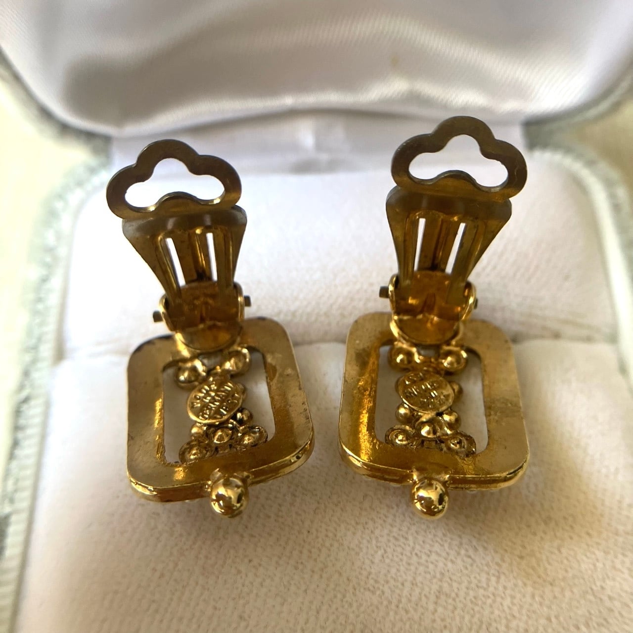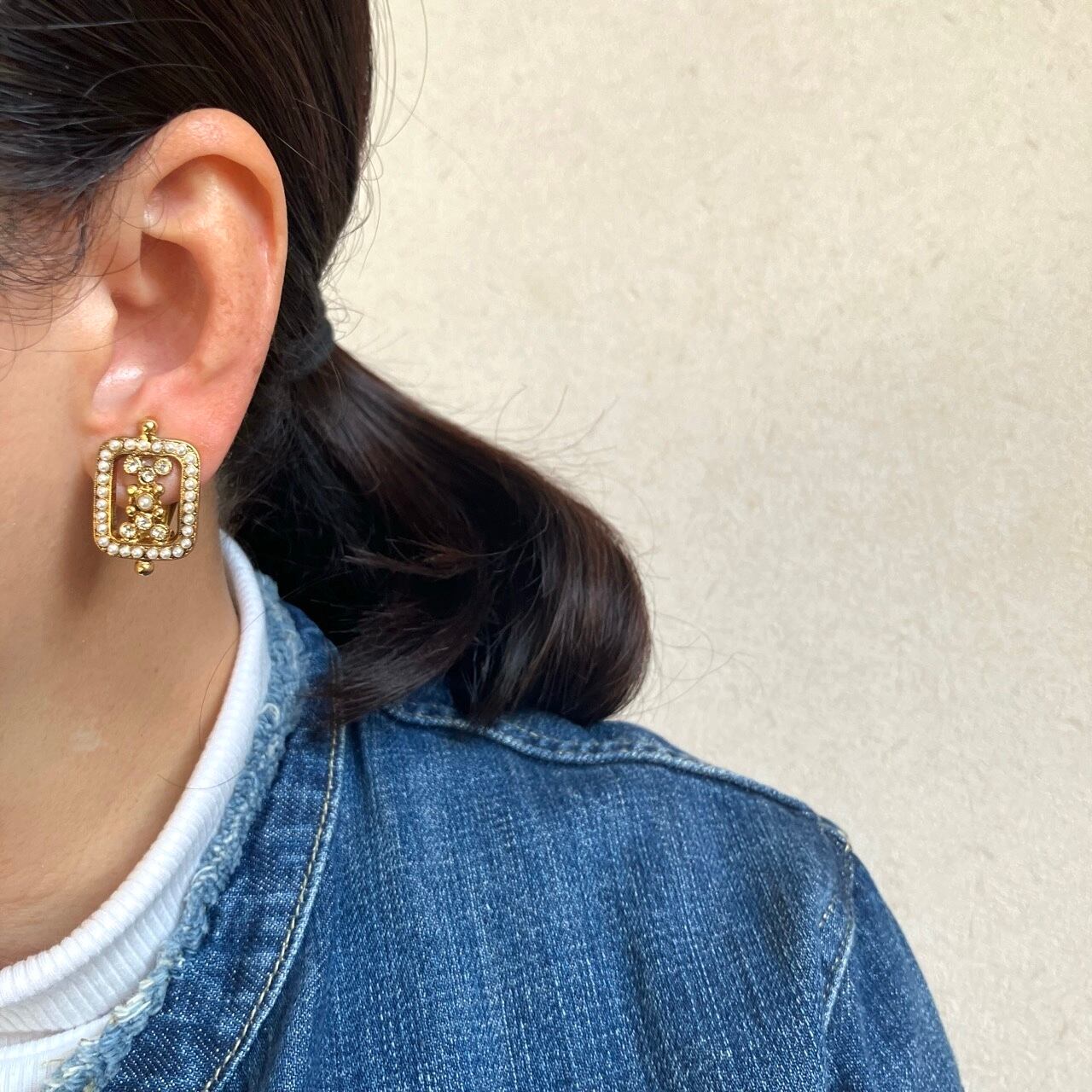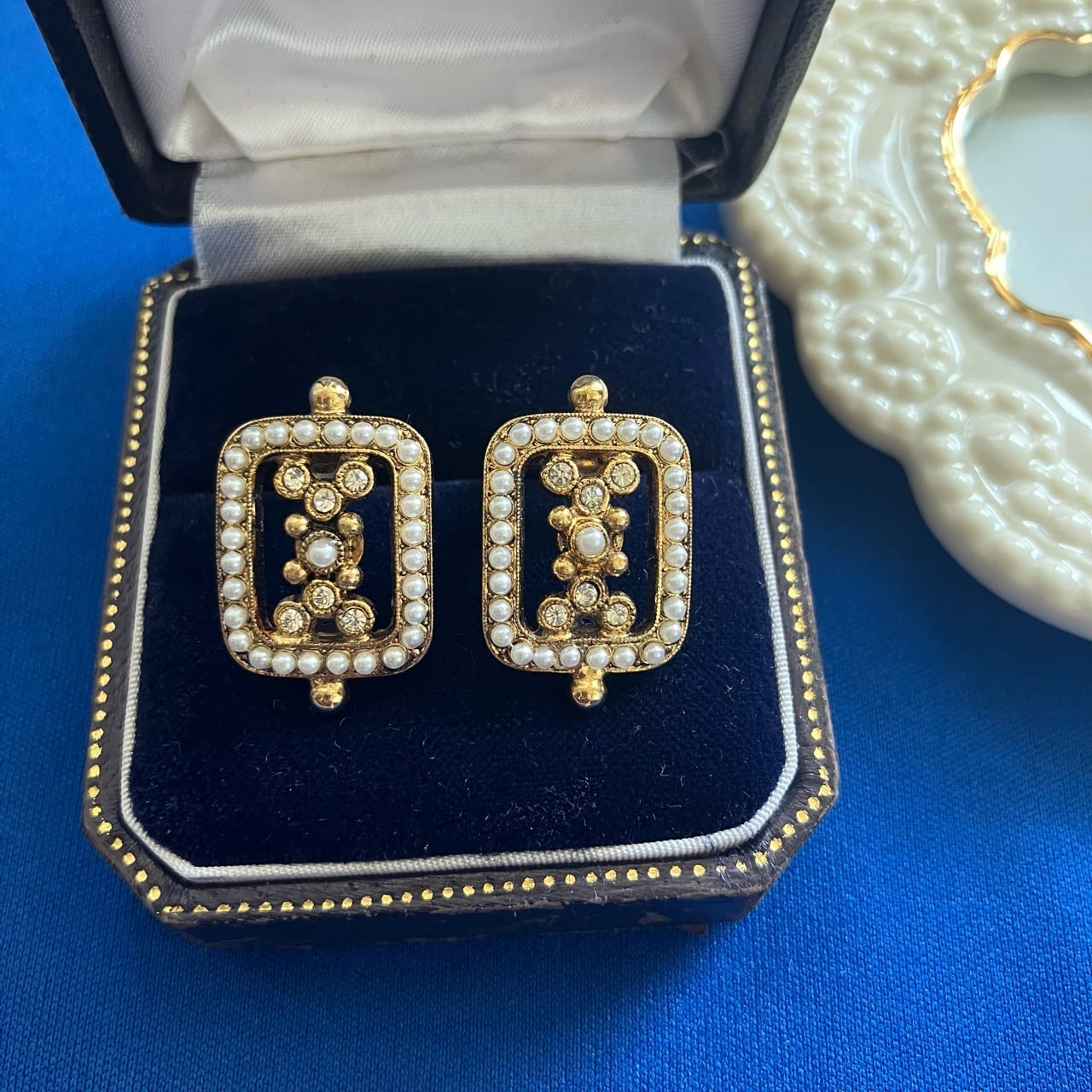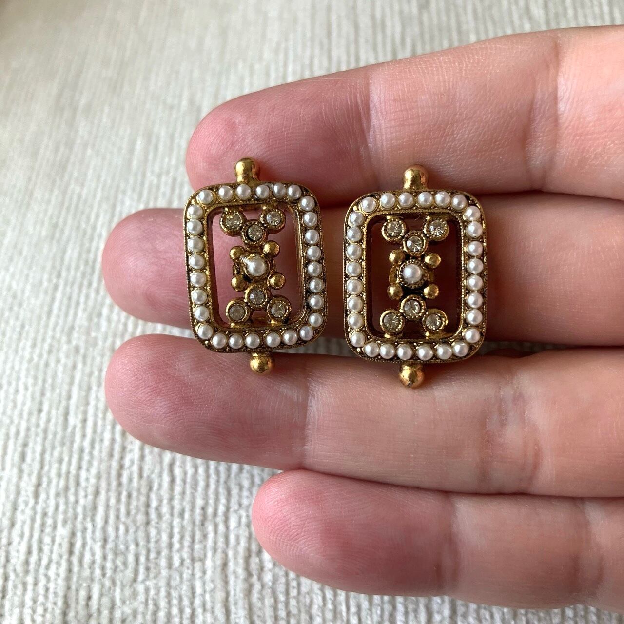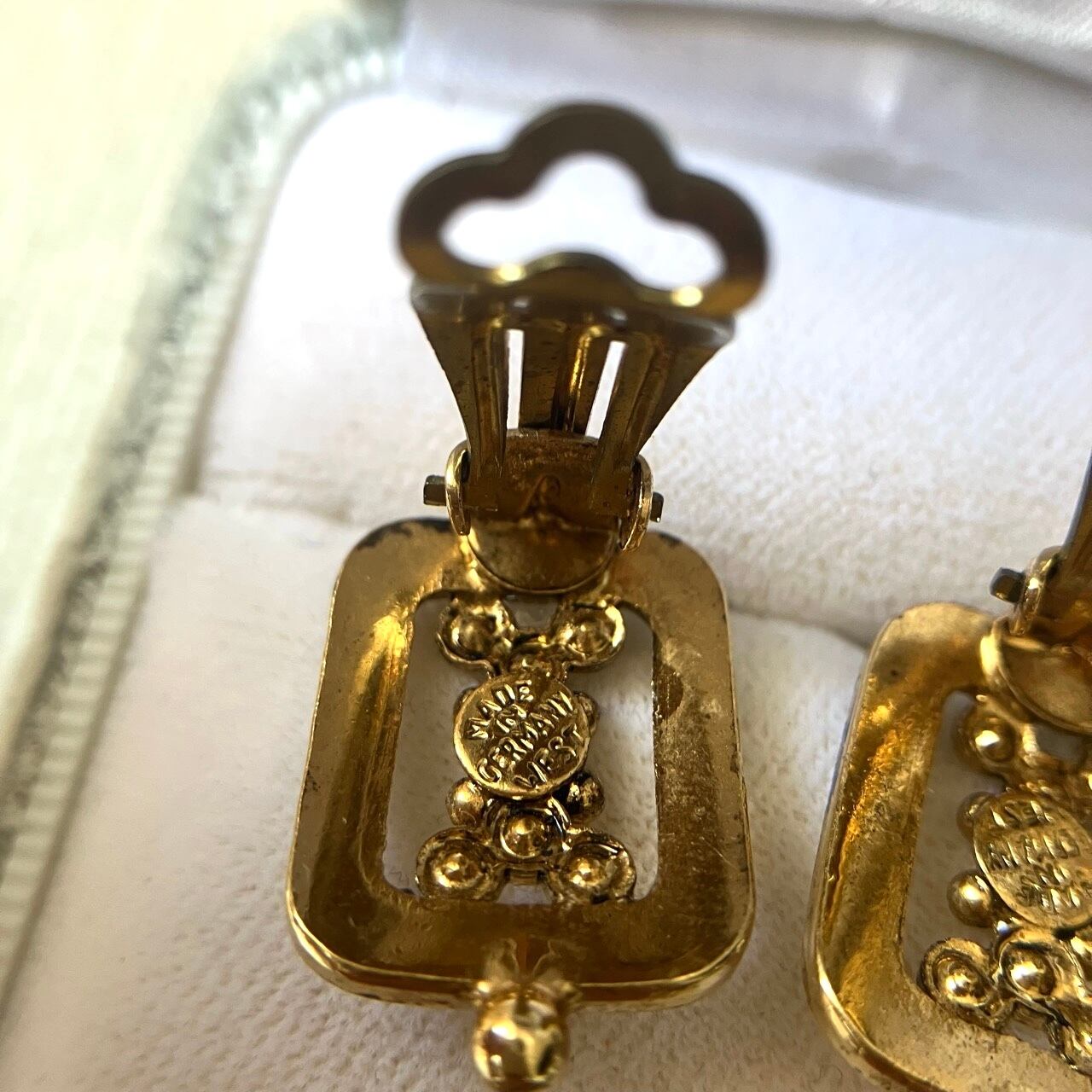 落ち着いたゴールドメタルの長方形のフレームに、雰囲気のある小粒のパールビーズとクリアラインストーンがセットされた細やかなデザインが、とても素敵な西ドイツ製のヴィンテージイヤリングです。
