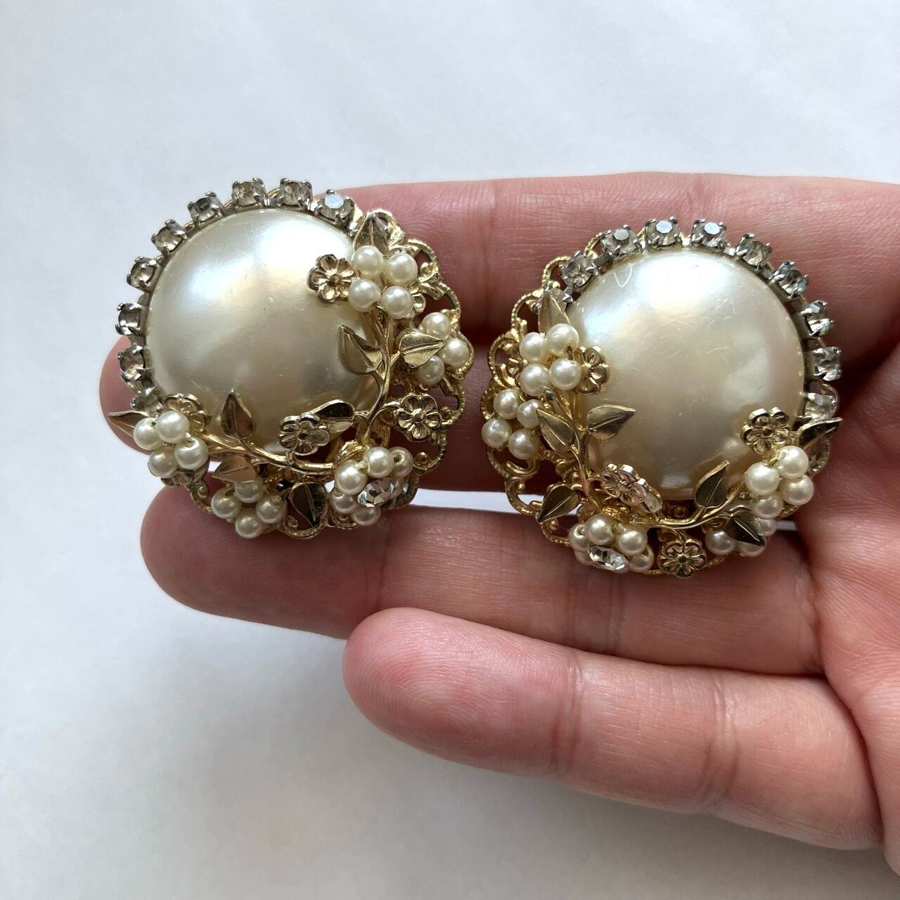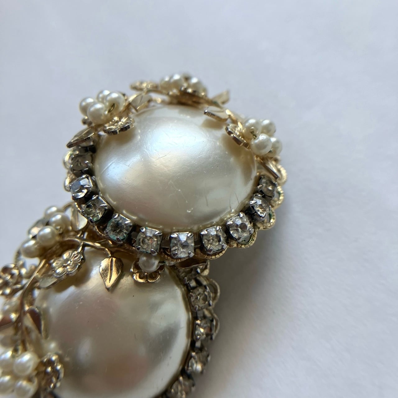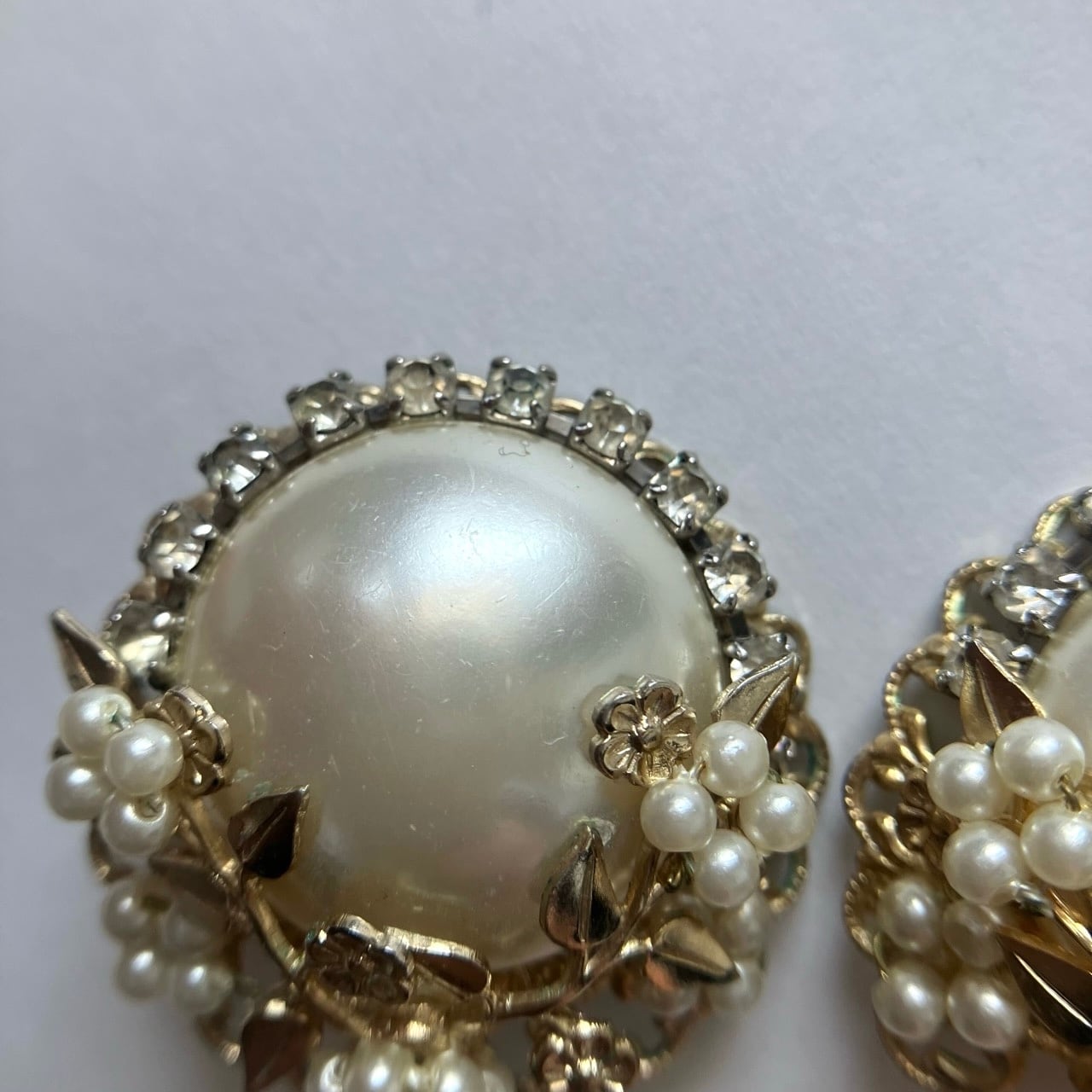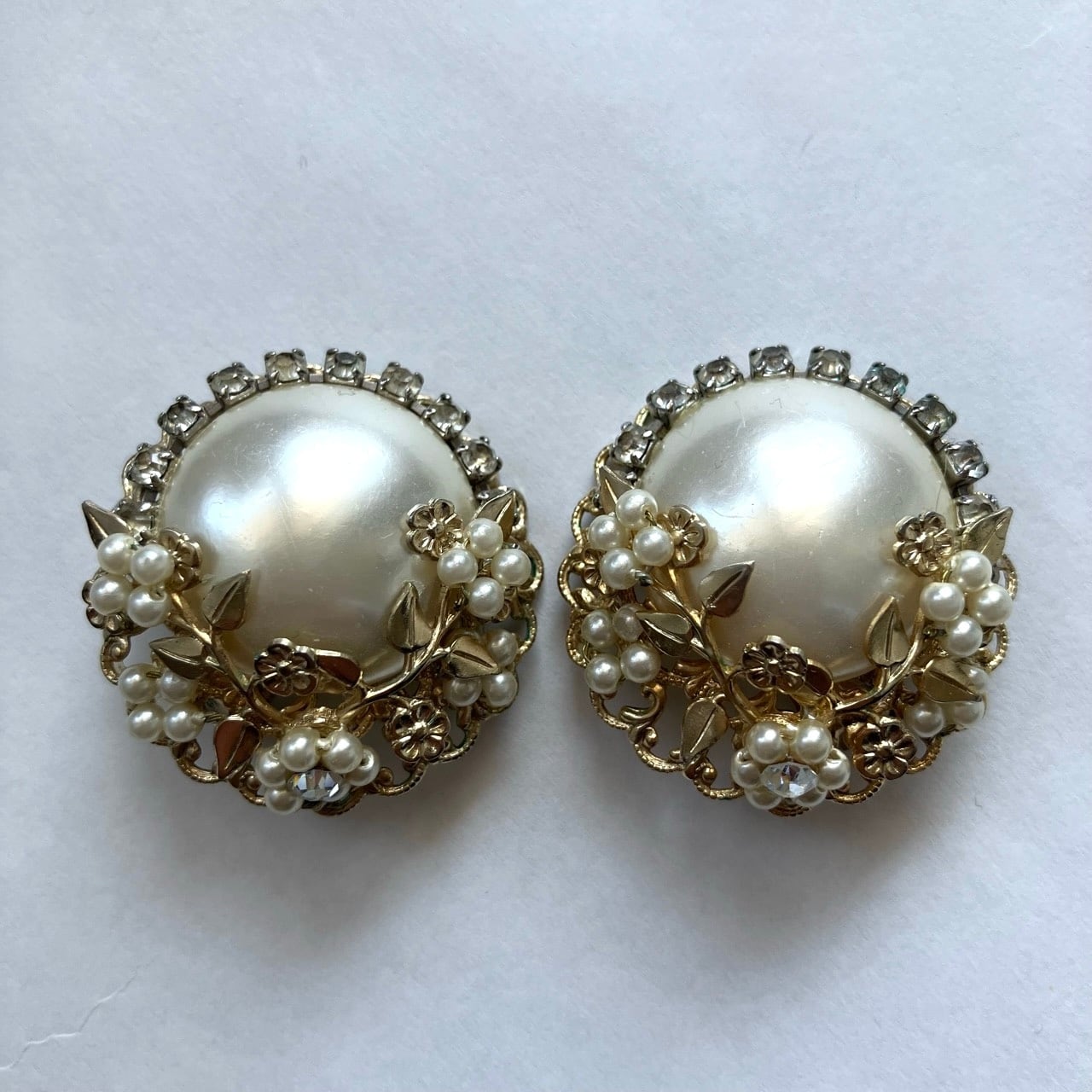 大きなパールカボションにラインストーンやメタルやパールビーズで葉や花が装飾的にデザインされた、とても素敵なヴィンテージイヤリングです。