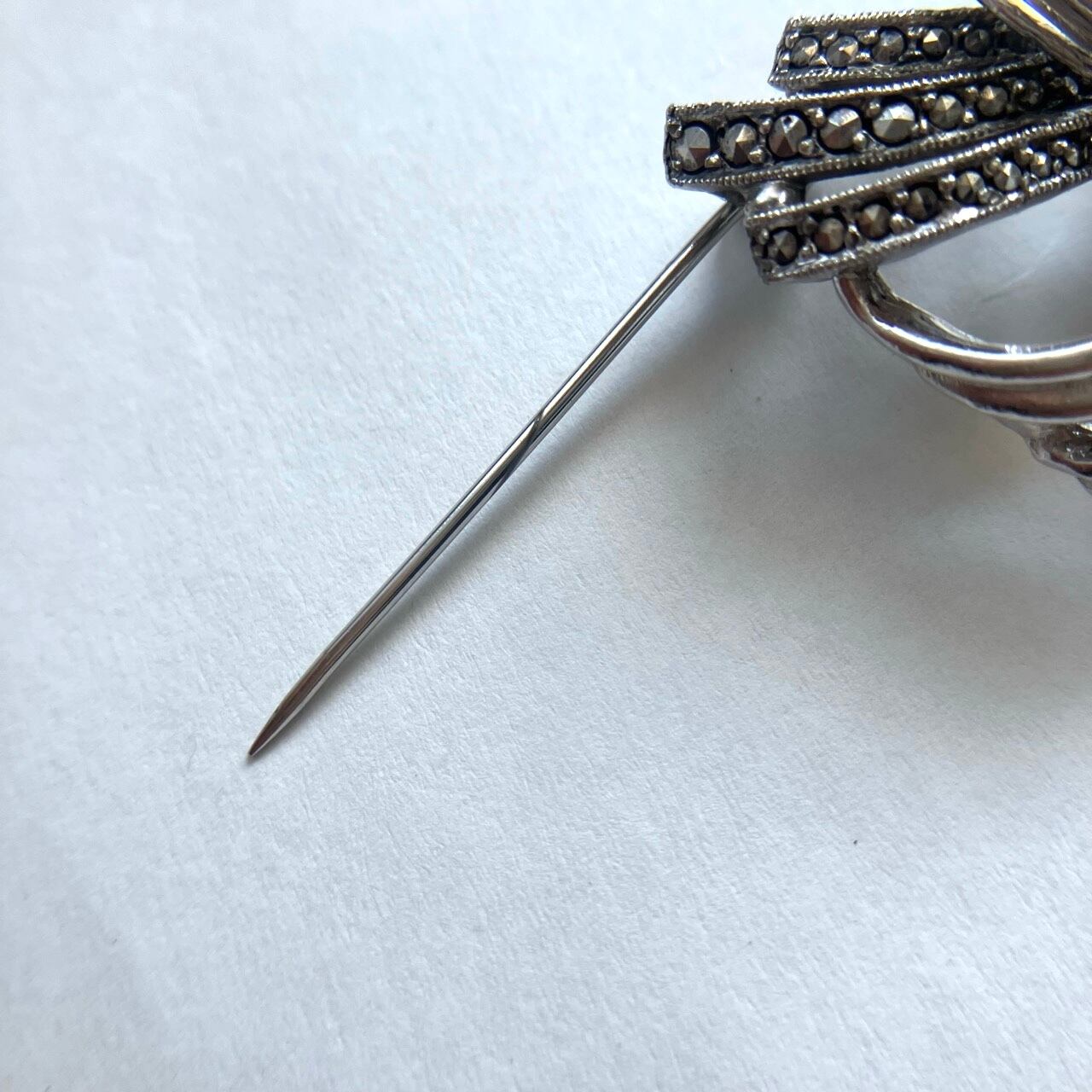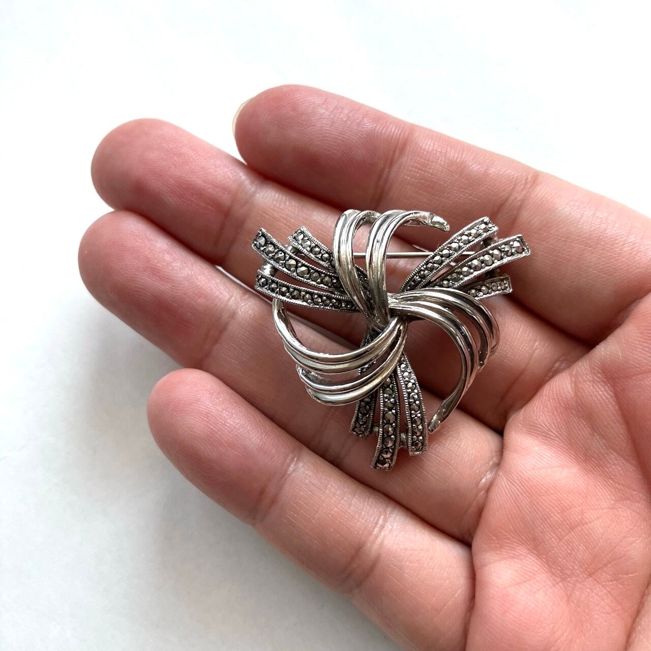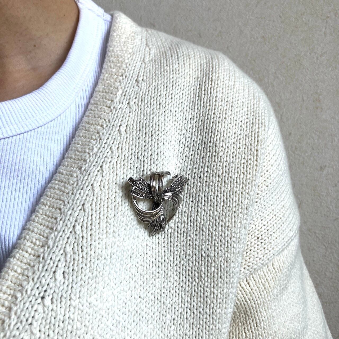 1939年にロンドンで設立され、高品質なコンパクトなどを制作、50年代にはジュエリーの制作も始めたメーカー“KIGU”の、落ち着いたシルバーメタルとマーカサイトでデザインされた、とても素敵なヴィンテージブローチです。
