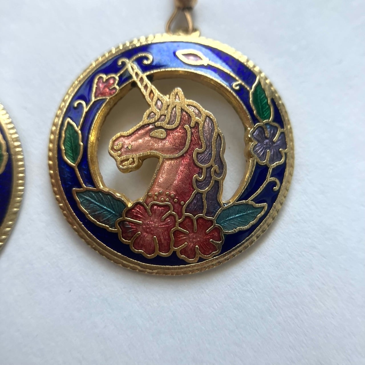 ゴールドメタルの土台に落ち着いた赤ピンク系のユニコーンと、ブルーのベースに植物柄がデザインされたサークル型パーツが揺れる、とても素敵なクロワゾネ(七宝焼)のヴィンテージピアスです。