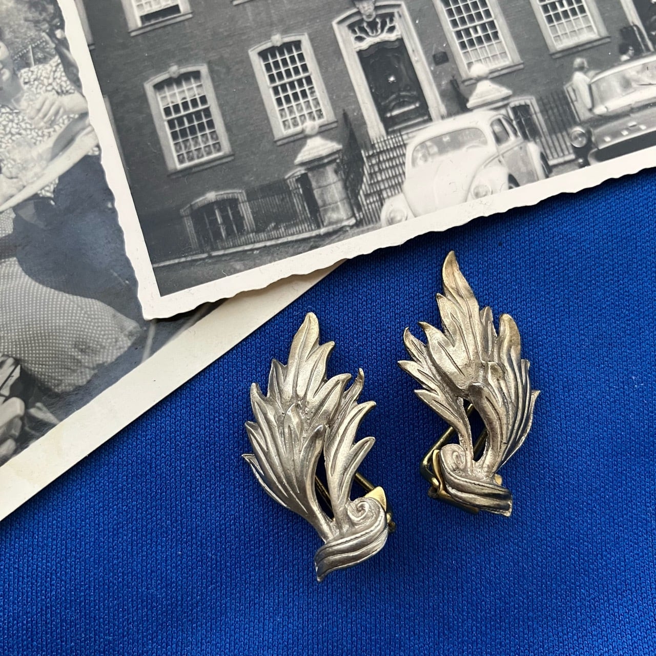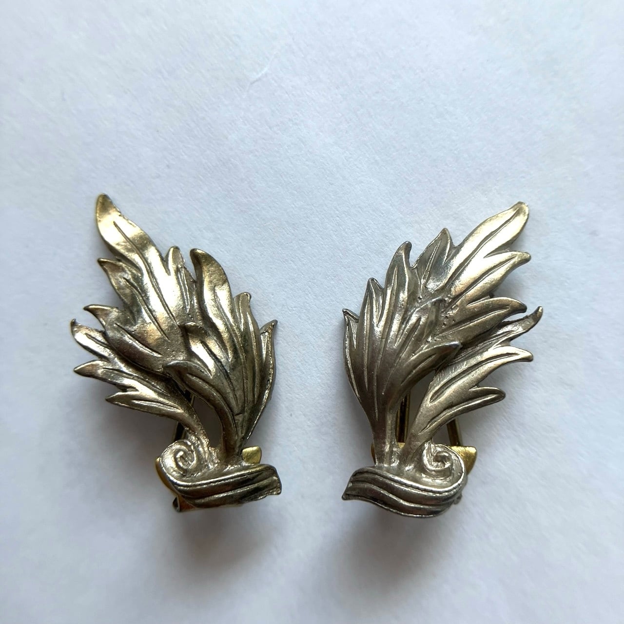 ゴールドとシルバーの中間のような色合いのヴィンテージ感のあるメタルの、動きのあるリーフのようなデザインが、とても素敵なヴィンテージイヤリングです。