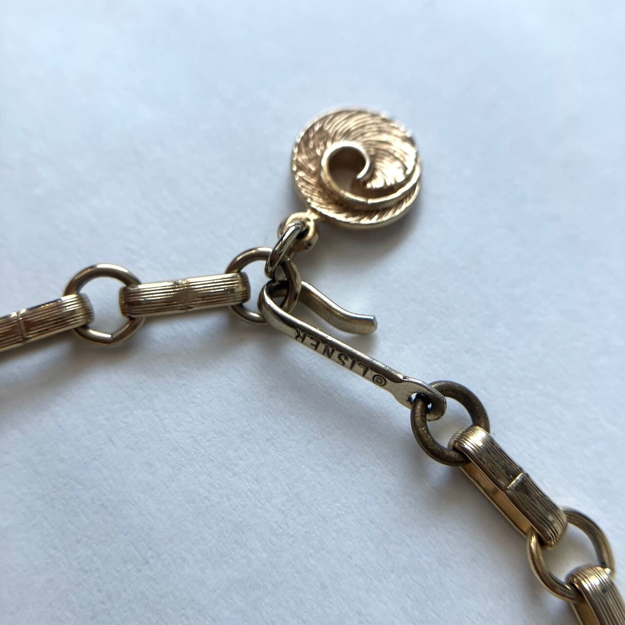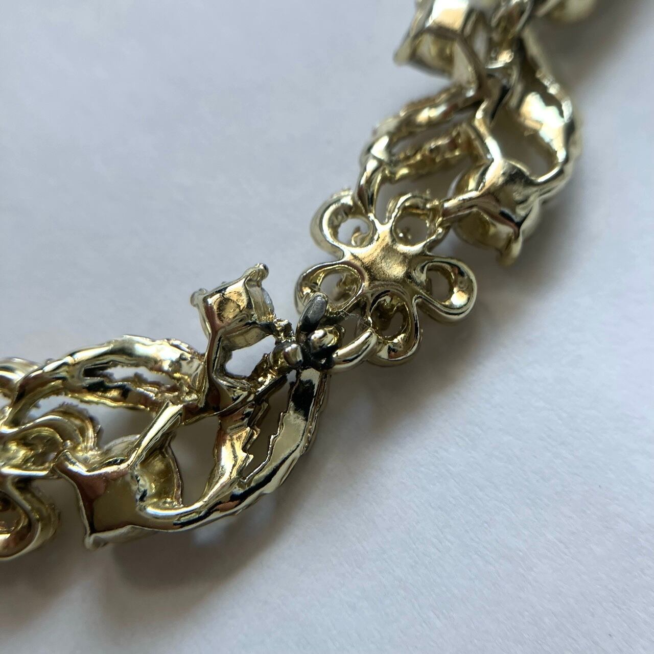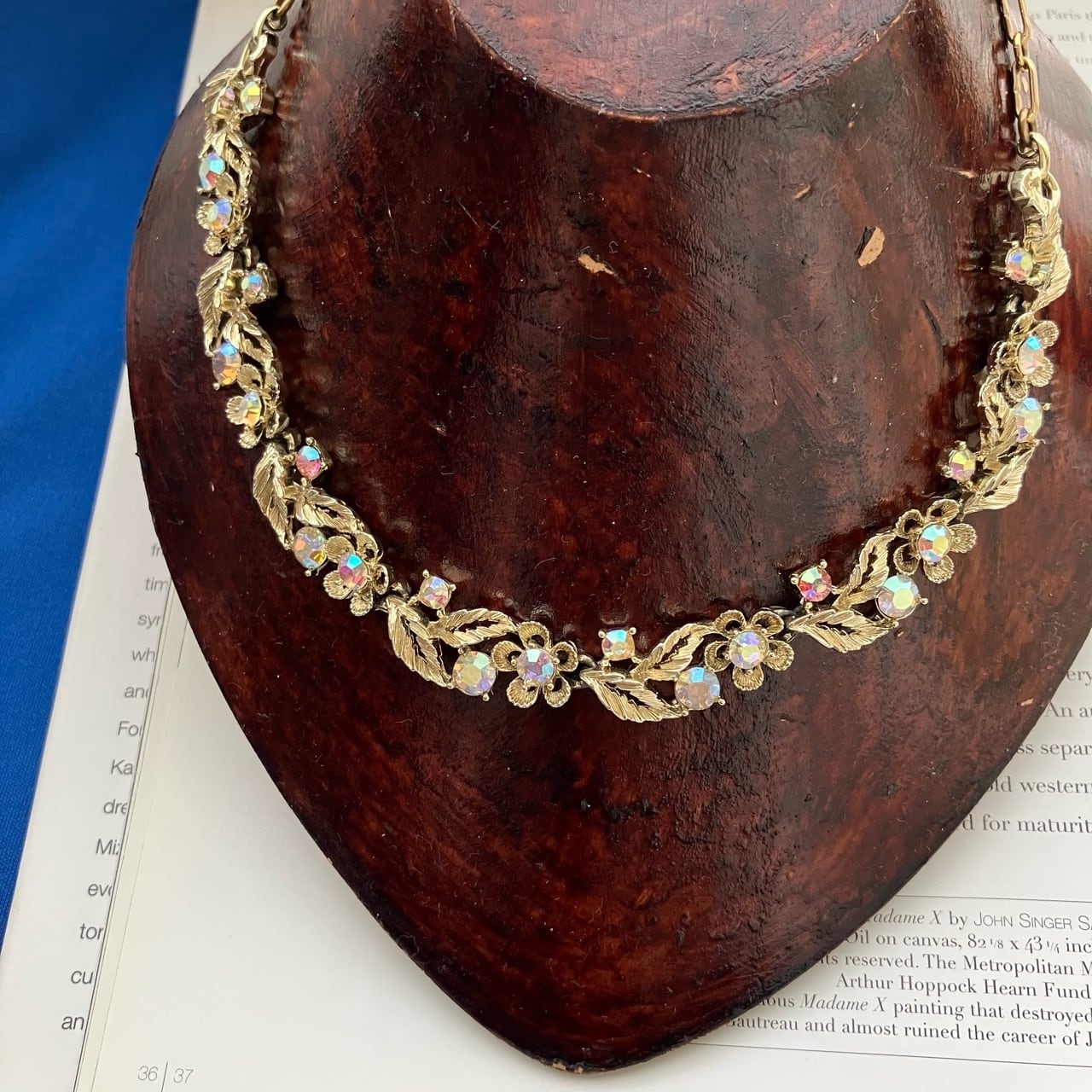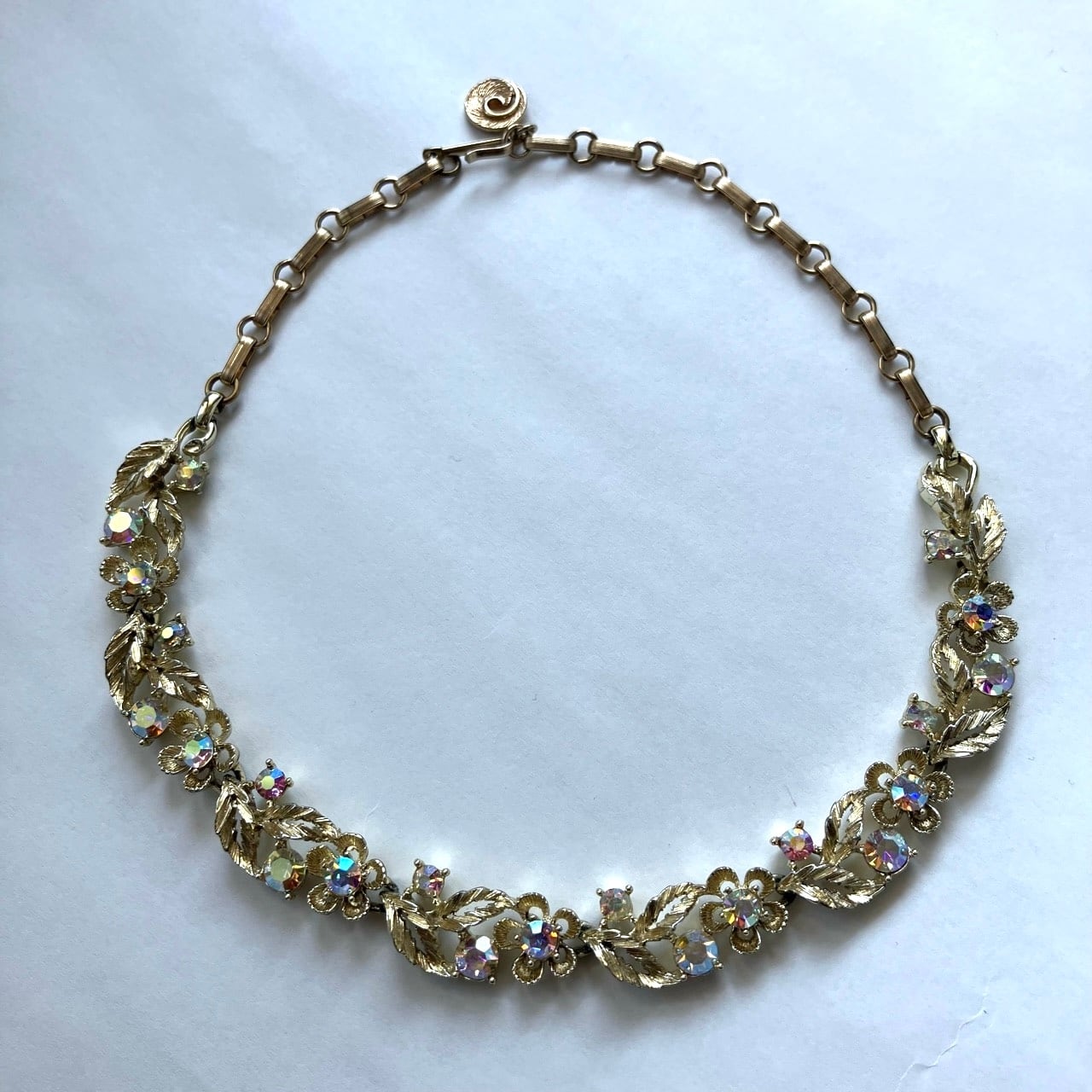 1904年にNYで設立されたジュエリーメーカー“Lisner”の、明るいゴールドメタルにオーロララインストーンのお花や葉の美しいデザインが、とても素敵なヴィンテージネックレスです。