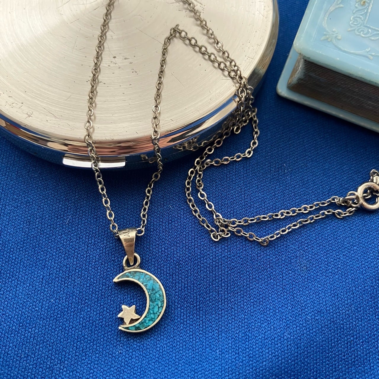 シルバージュエリーの生産が盛んなメキシコで作られていたALPACA MEXICOという合金素材のシルバーメタルにブルーのチップが埋め込まれた三日月と星のデザインが、とても素敵なヴィンテージネックレスです。