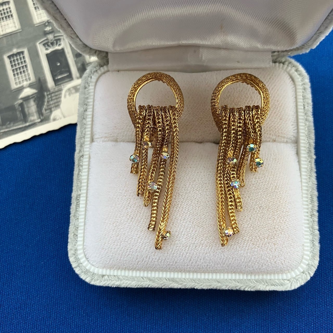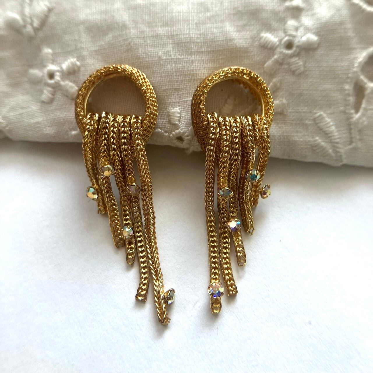 ゴールドメタルメッシュのサークル型トップに、小粒のオーロララインストーンがアクセントになった雰囲気のあるロングチェーンが揺れる、とても素敵なヴィンテージイヤリングです。