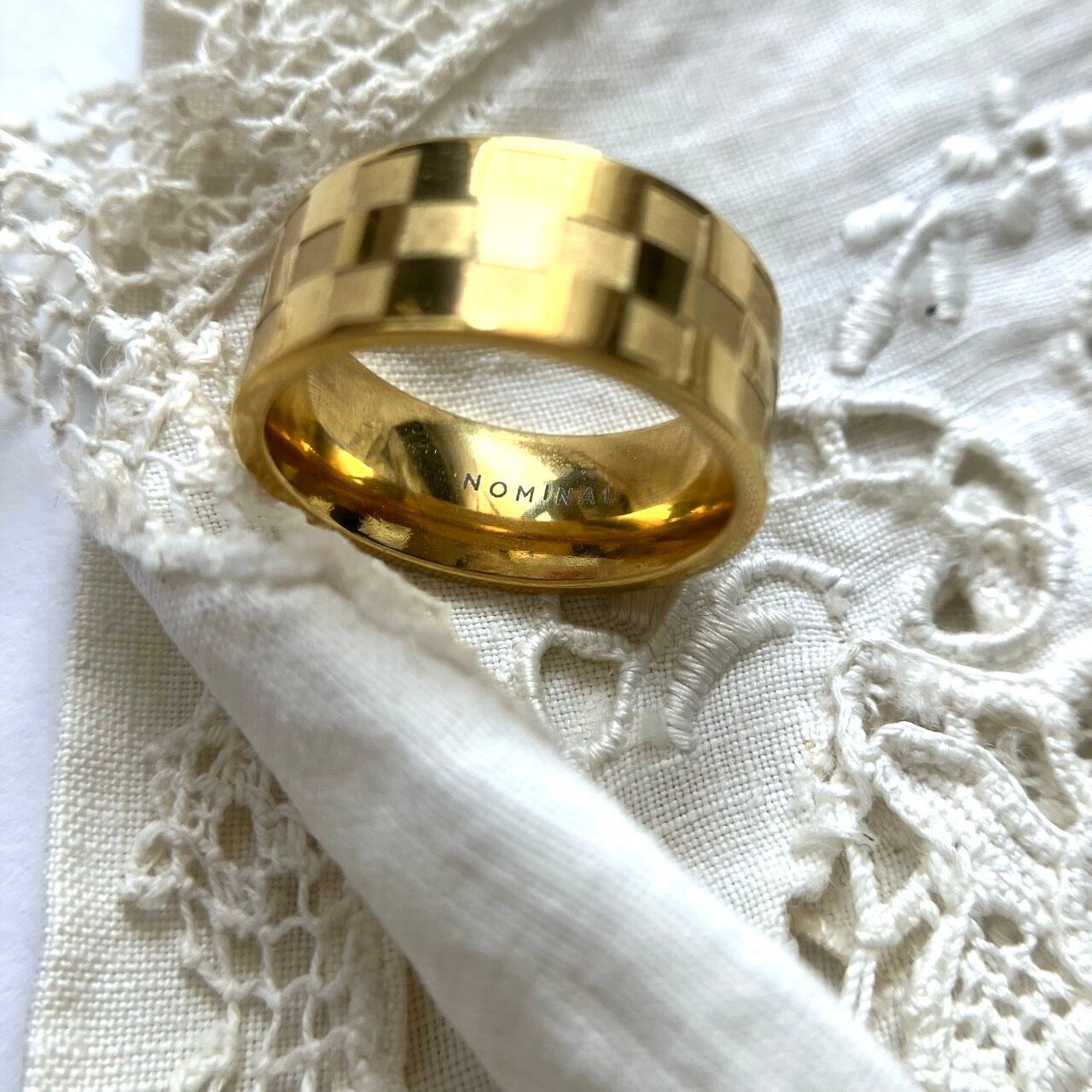 アリゾナをベースにしたジュエリーメーカー"NOMINAL"の、ゴールドのチェス盤をイメージしたチェックのデザインが、とても素敵なリングです。