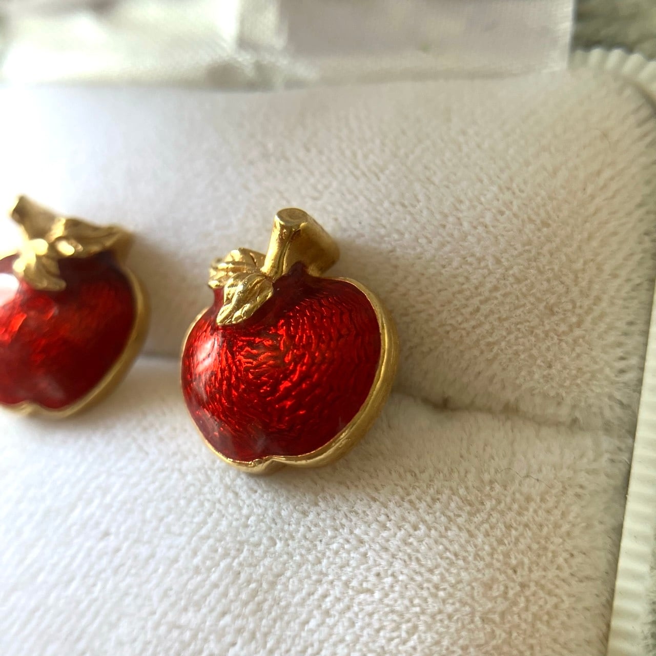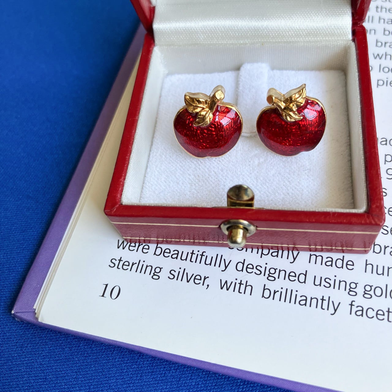 ゴールドメタルに落ち着いたレッドエナメルのぷっくりとしたアップルデザインが、とても素敵な”AVON”(エイボン)のヴィンテージピアスです。