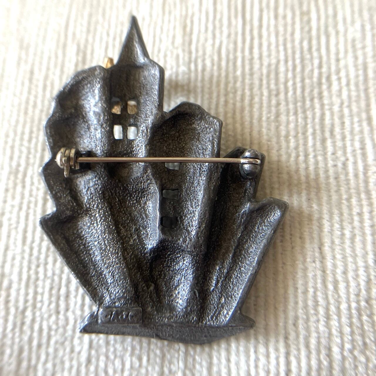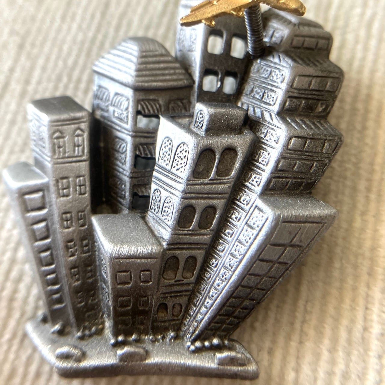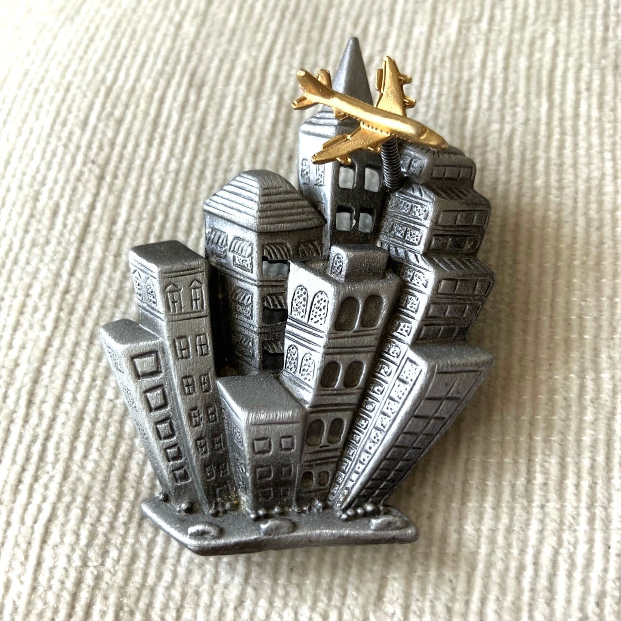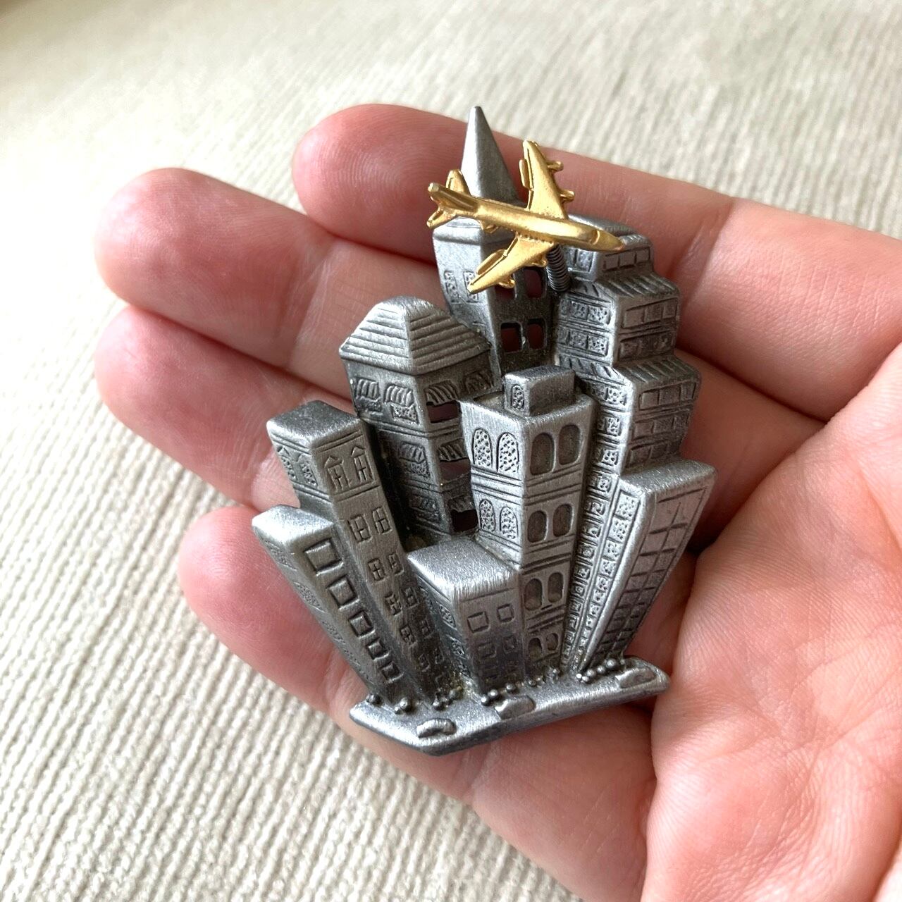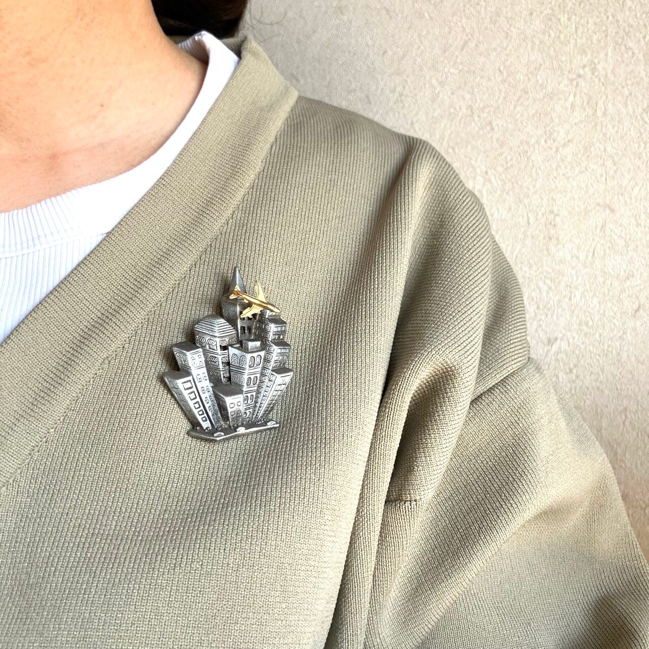 "AJC"のマットで落ち着いたシルバーメタルの高いビルの都市の上を、ゴールドメタルの飛行機が飛ぶデザインが、ユニークでとても素敵なヴィンテージブローチです。