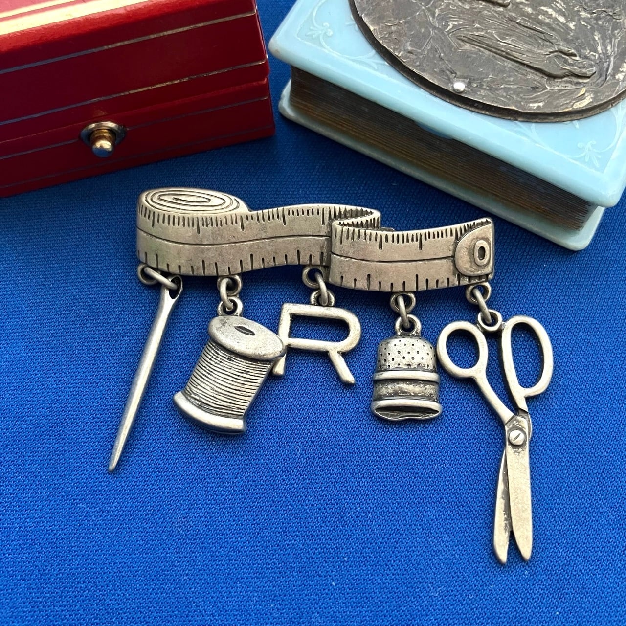 マットなシルバーメタルのメジャーや針、糸などのソーイングセットが揺れるデザインが、とてもユニークで素敵なヴィンテージブローチです。