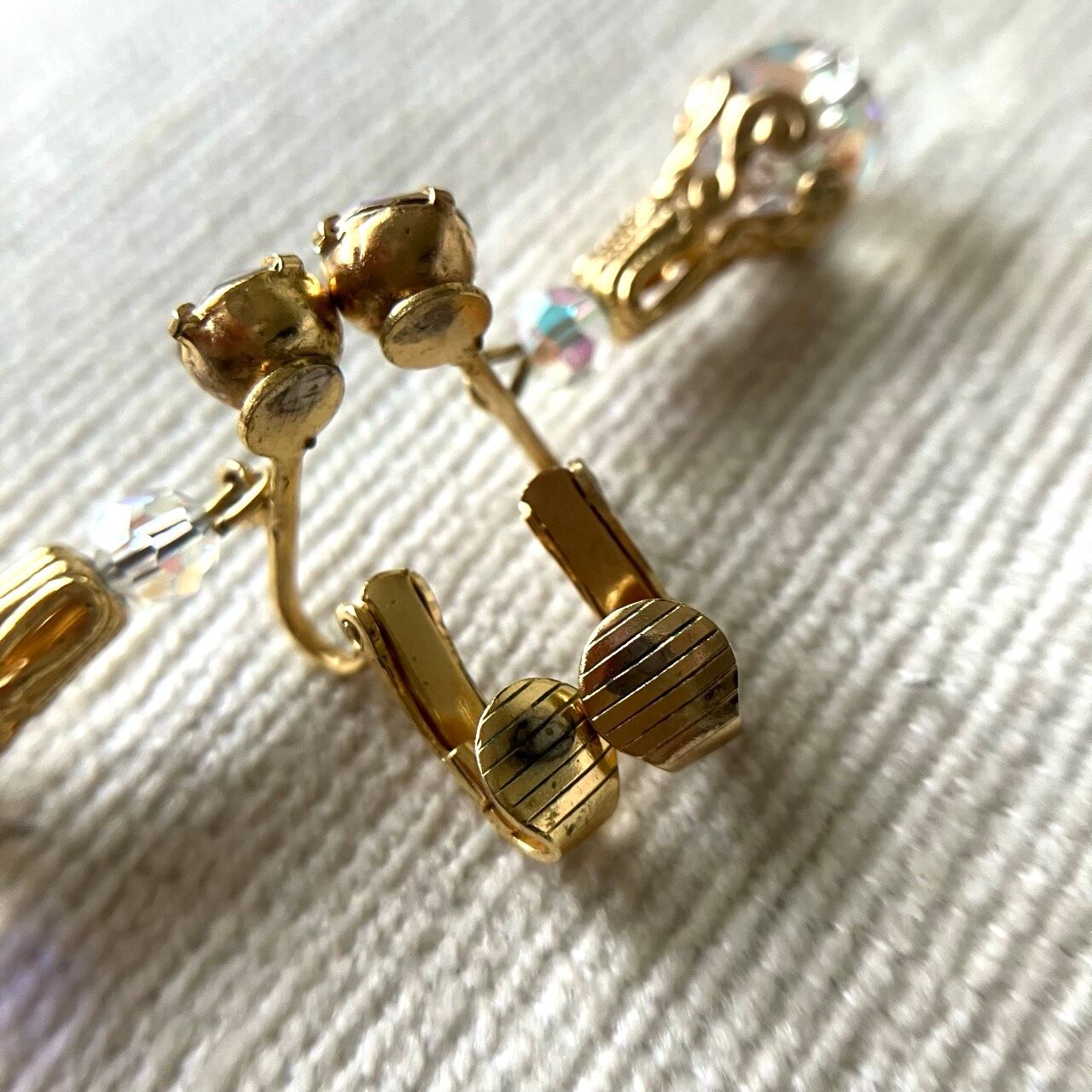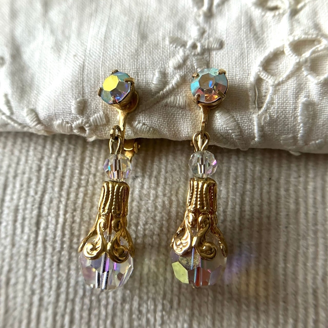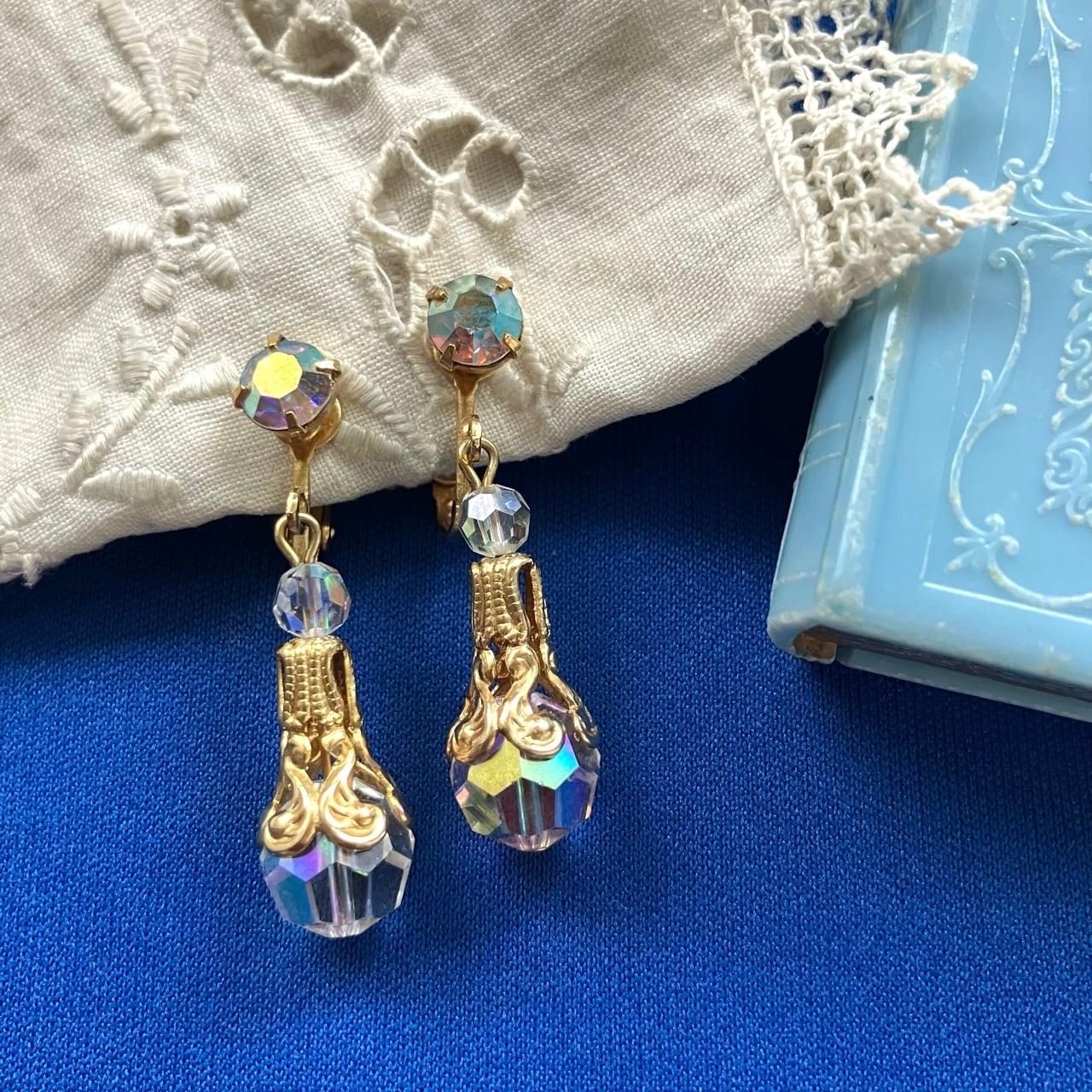 美しいオーロララインストーンのトップに、装飾的なゴールドパーツで飾られたオーロラビーズが揺れるデザインが、とても素敵なヴィンテージイヤリングです。