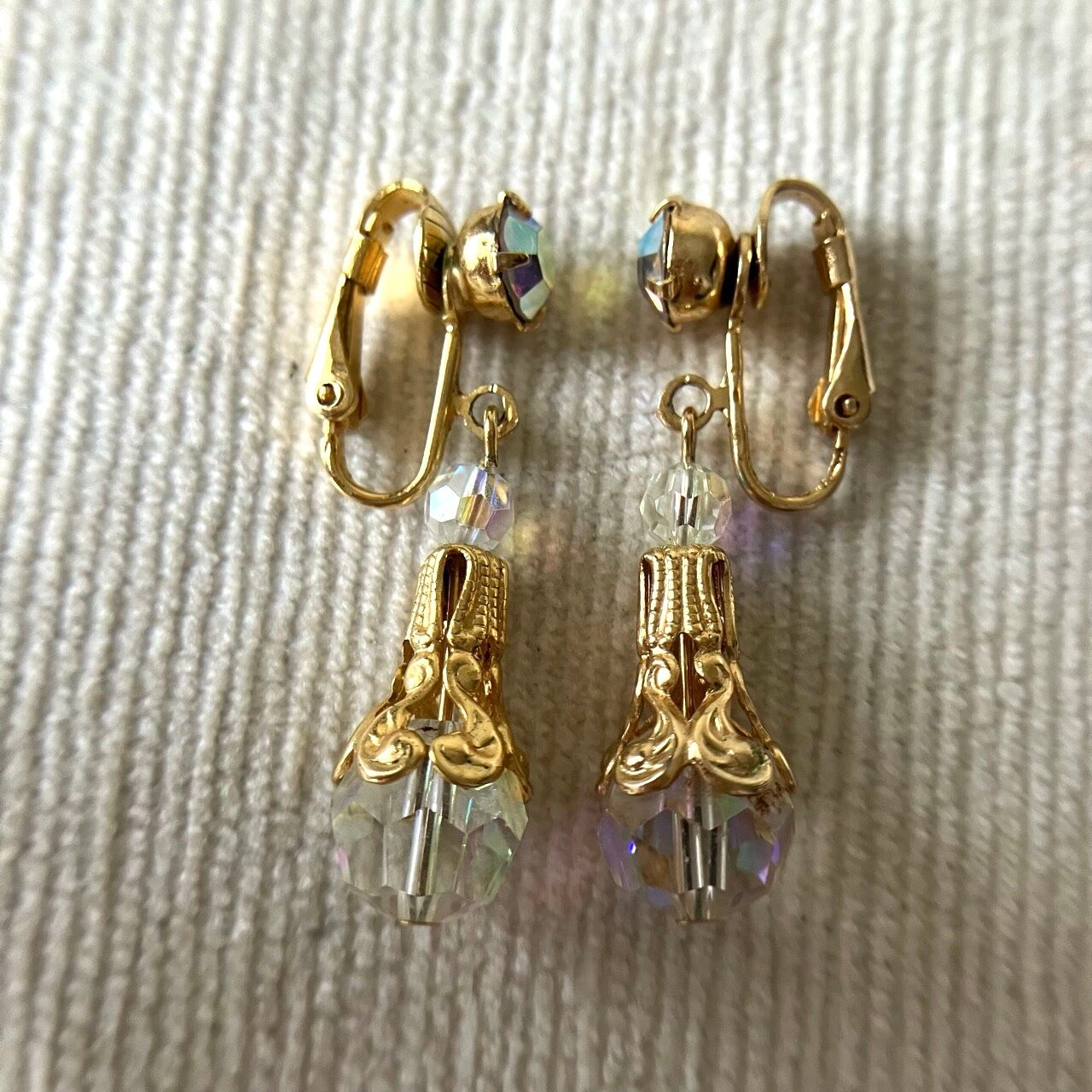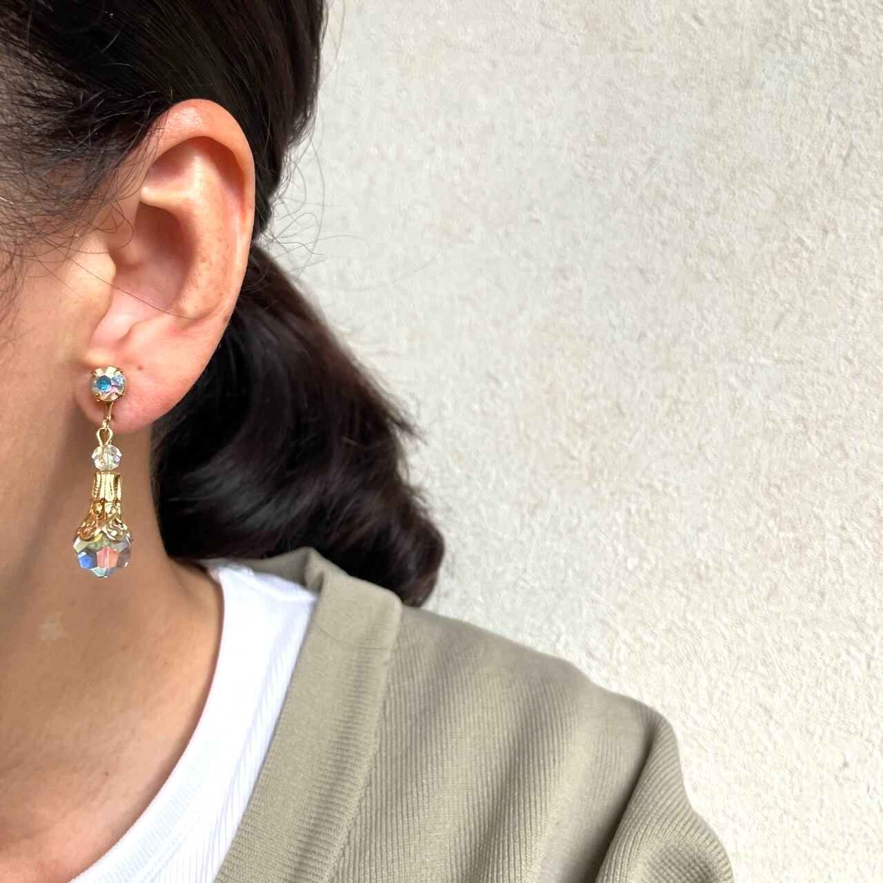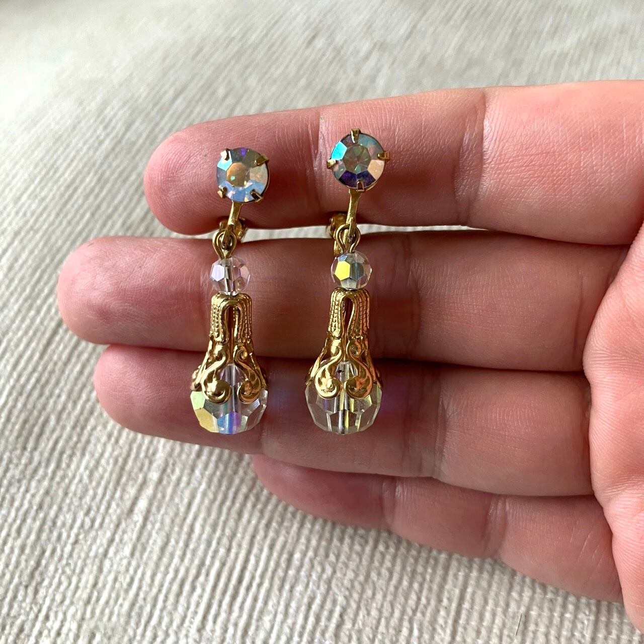 美しいオーロララインストーンのトップに、装飾的なゴールドパーツで飾られたオーロラビーズが揺れるデザインが、とても素敵なヴィンテージイヤリングです。
