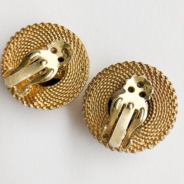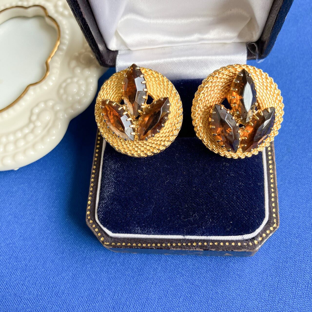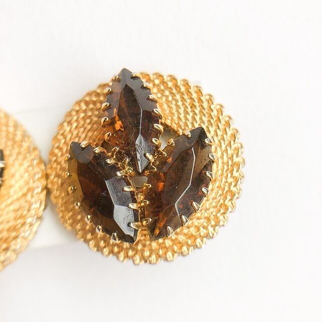 ゴールドメタルの土台に落ち着いたブラウンのアーモンドアイ型ラインストーンで華やかにデザインされた、とても素敵なヴィンテージイヤリングです。
