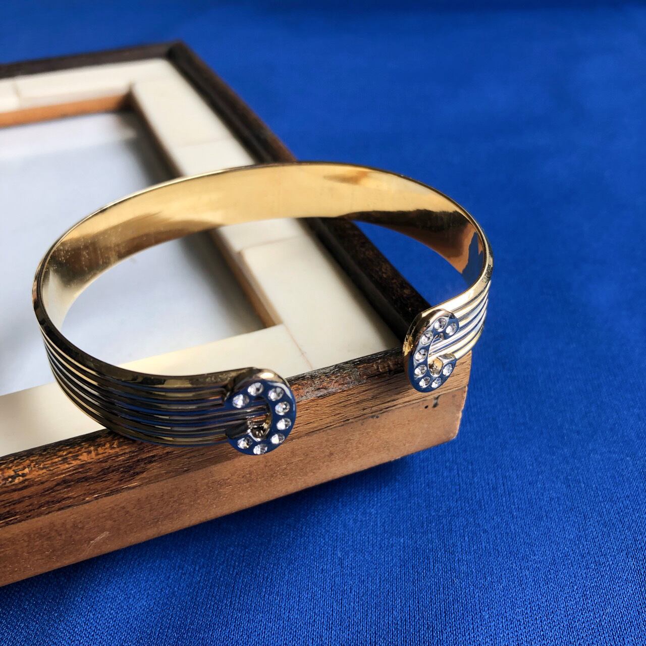 ゴールド&シルバーメタルにクリアラインストーンのモチーフでエレガントにデザインされた、とても素敵なヴィンテージバングルブレスレットです。