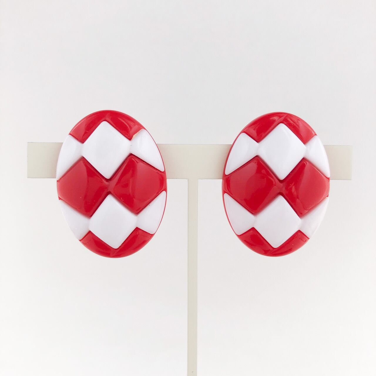 レッド&ホワイトプラスティックでモダンな柄のようにデザインされた、とても素敵な”AVON”(エイボン)のヴィンテージピアスです。