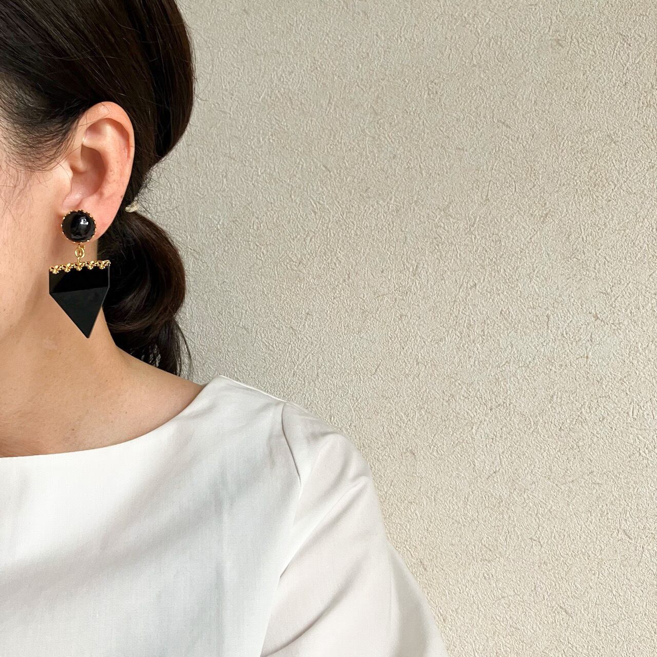 落ち着いたゴールドメタルの装飾の付いたモダンでクールなデザインのブラックカットパーツが揺れる、とても素敵なヴィンテージイヤリングです。