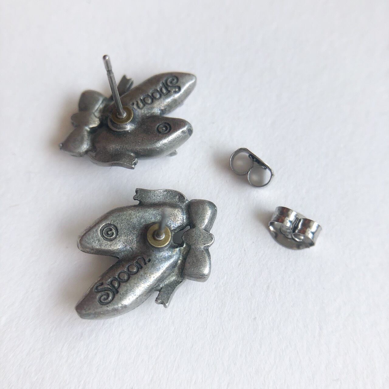 落ち着いた色合いのピューター(スズ)素材の、ガーリーなバレエシューズのデザインがとても素敵なヴィンテージピアスです。