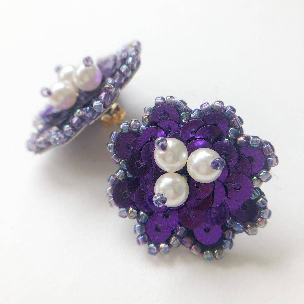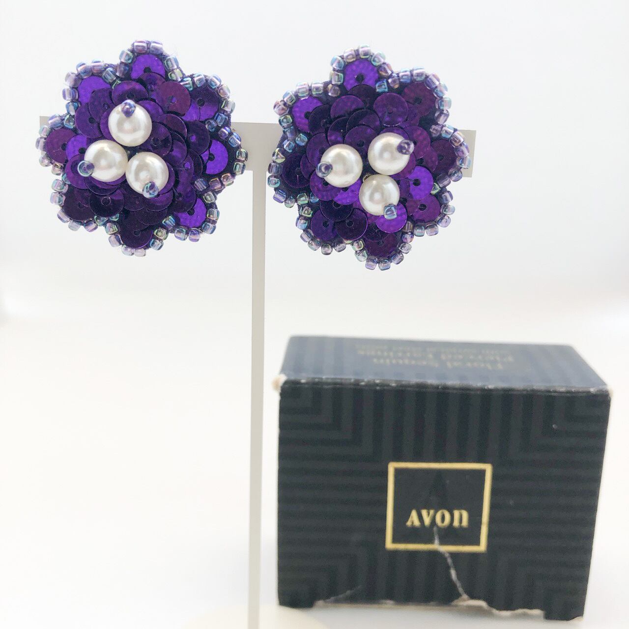 パープル系のスパンコールとビーズ、パールビーズでお花がデザインされた、とても素敵な”AVON”のヴィンテージピアスです。