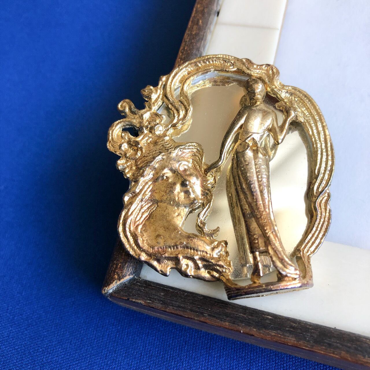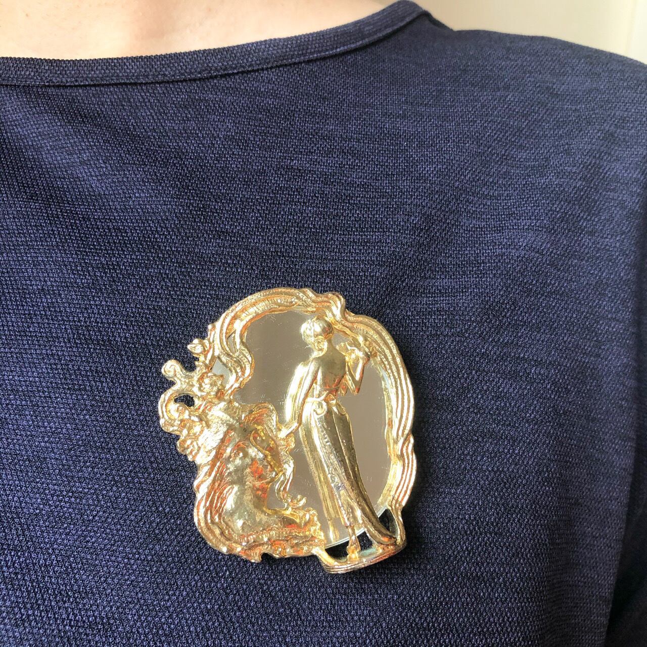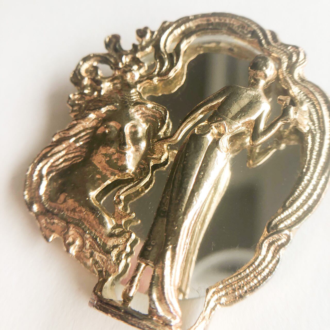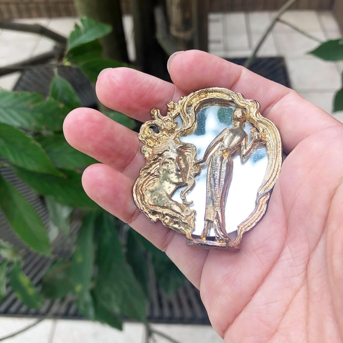 アールヌーボー調に女性がデザインされたゴールドメタルフレームのミラーが、とても素敵なヴィンテージブローチです。