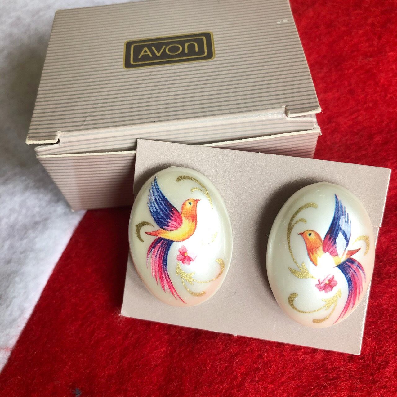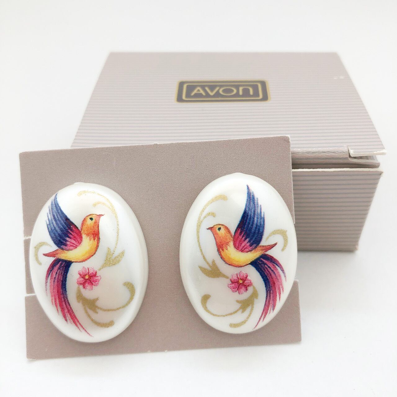 パール感のある土台に、カラフルで華やかな鳥のデザインがとても素敵な”AVON”(エイボン)のヴィンテージイヤリングです。