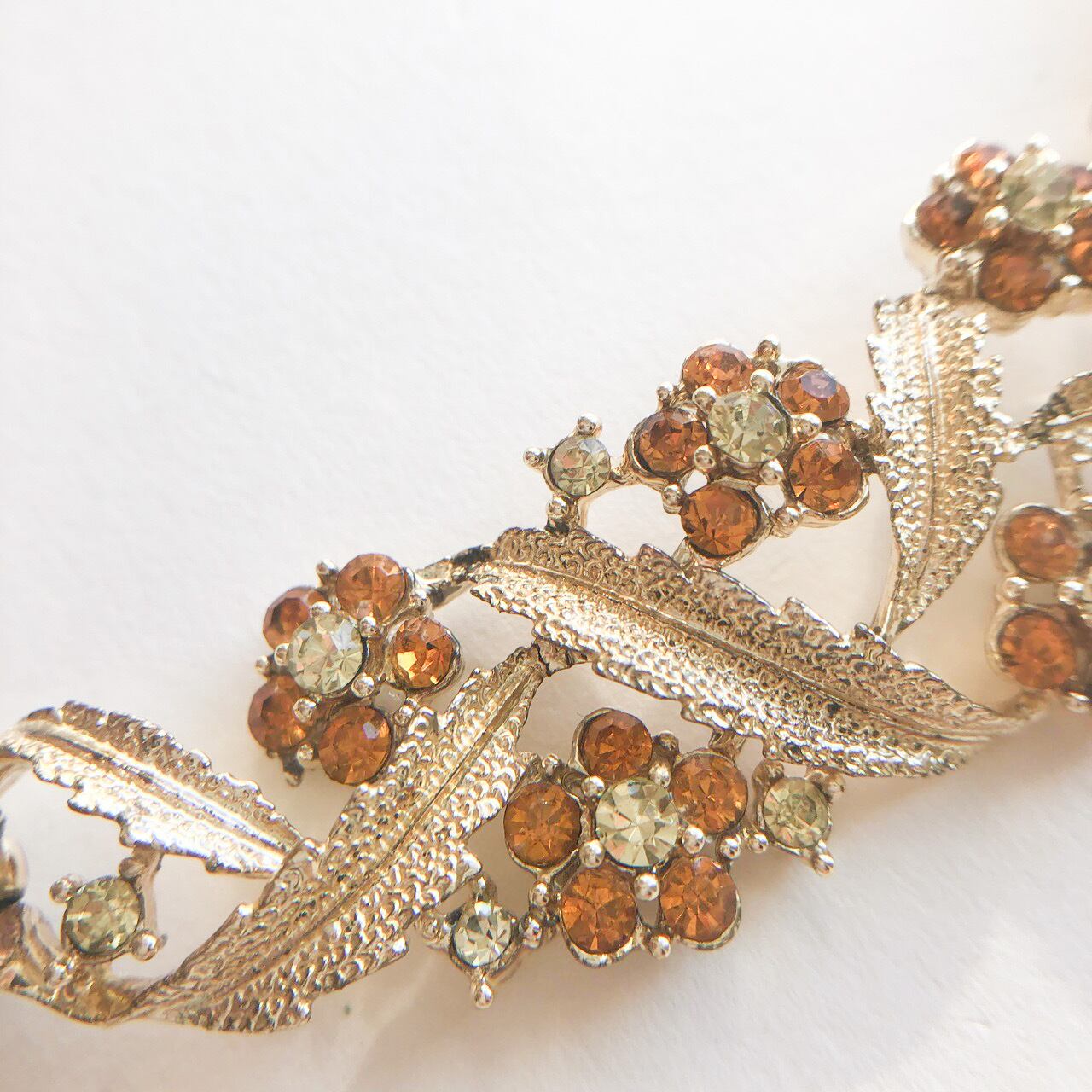 1901年に設立されたジュエリーメーカー”Coro”の、ゴールドメタルの土台に、優しいオレンジ系ラインストーンで可愛いお花がデザインされた、とても素敵なヴィンテージネックレスです。
