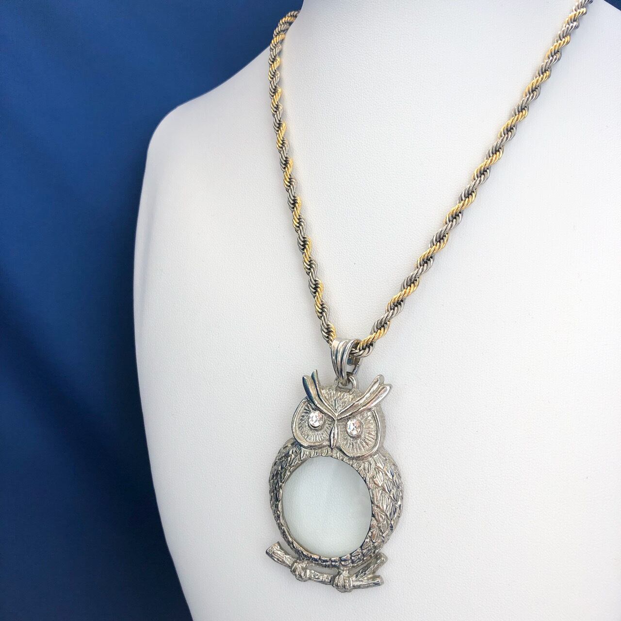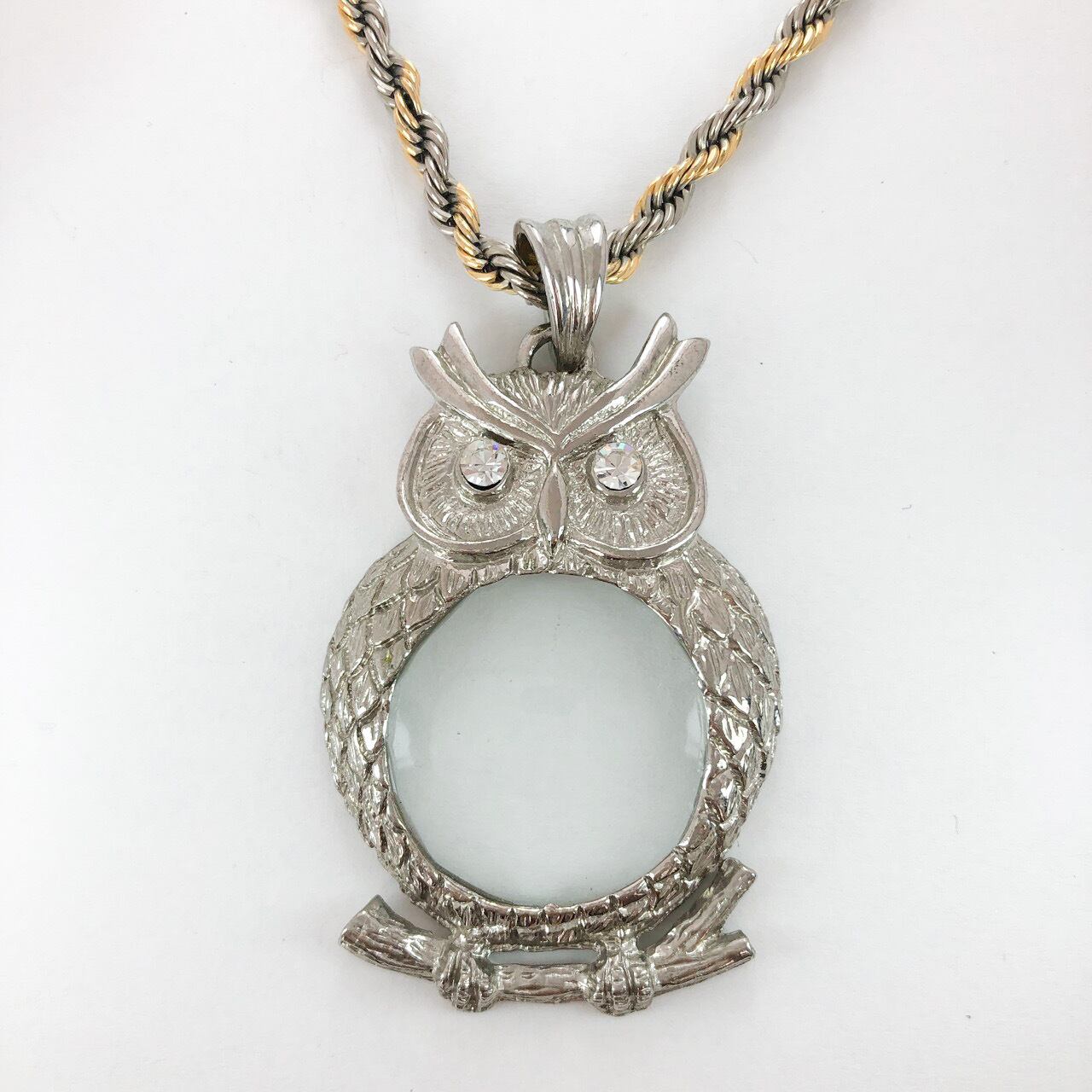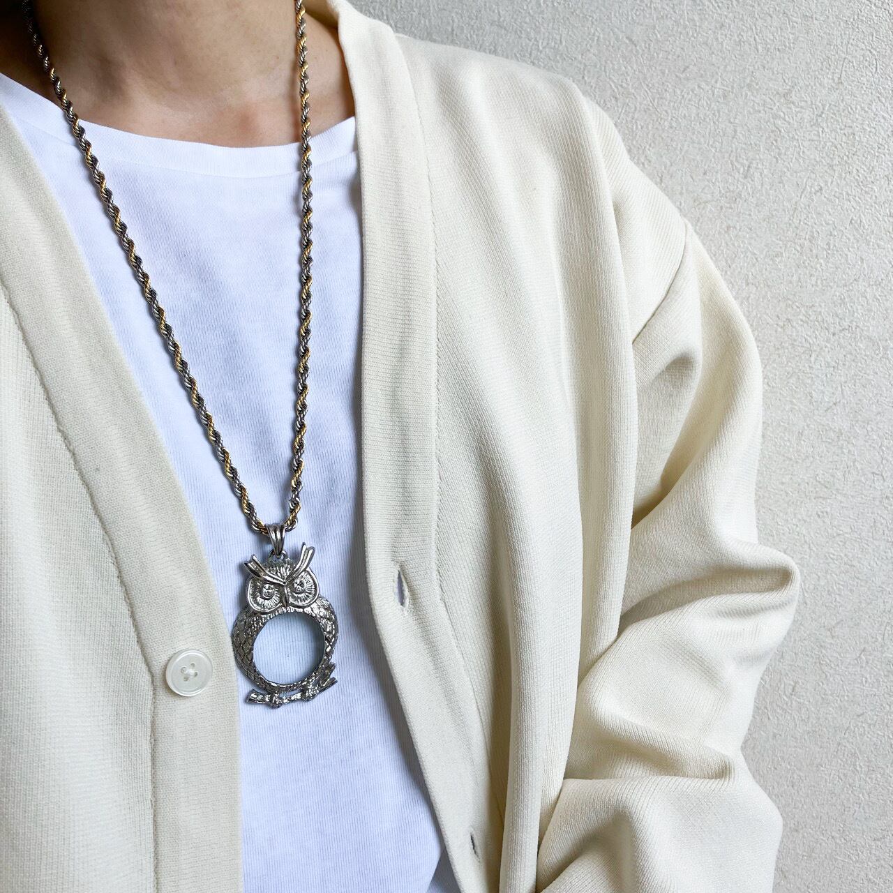 シルバーメタルにラインストーンの目を持つ大きなフクロウのデザインが、とても素敵なヴィンテージネックレスです。