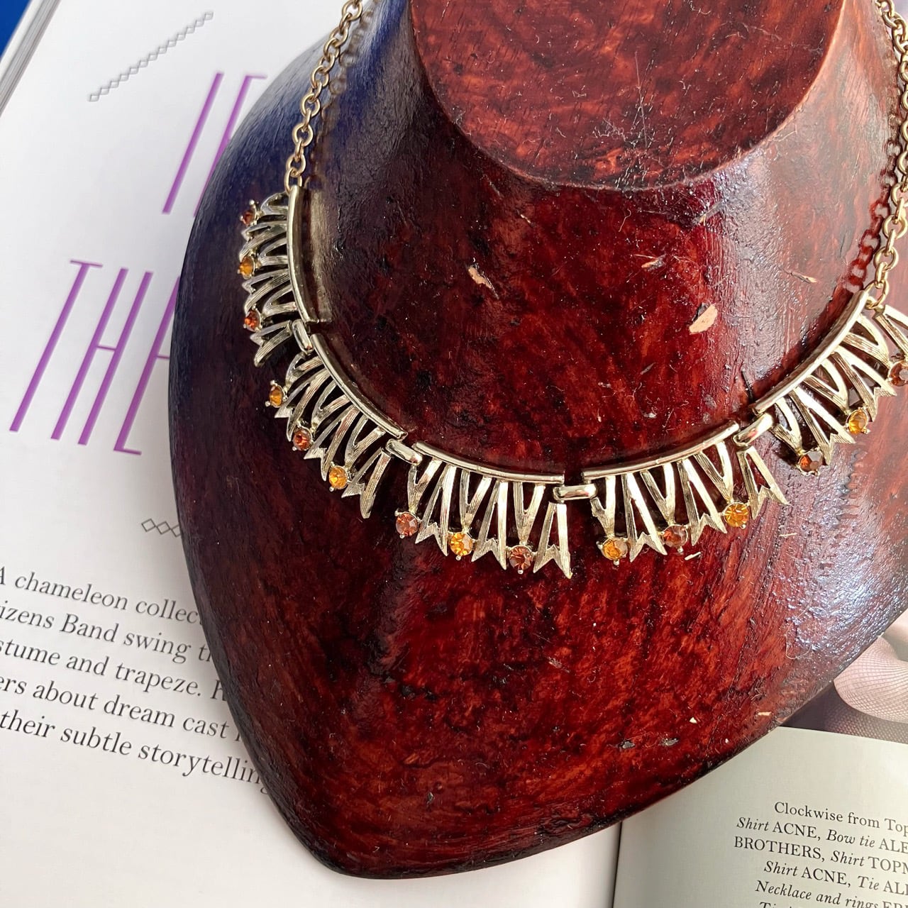 明るいゴールドメタルの土台に、ブラウン&オレンジイエロー系のラインストーンがセットされたモダンなヴィンテージらしいデザインが、素敵なネックレスです。