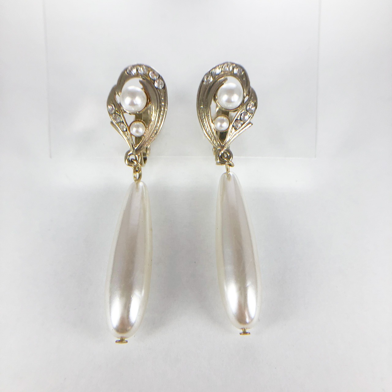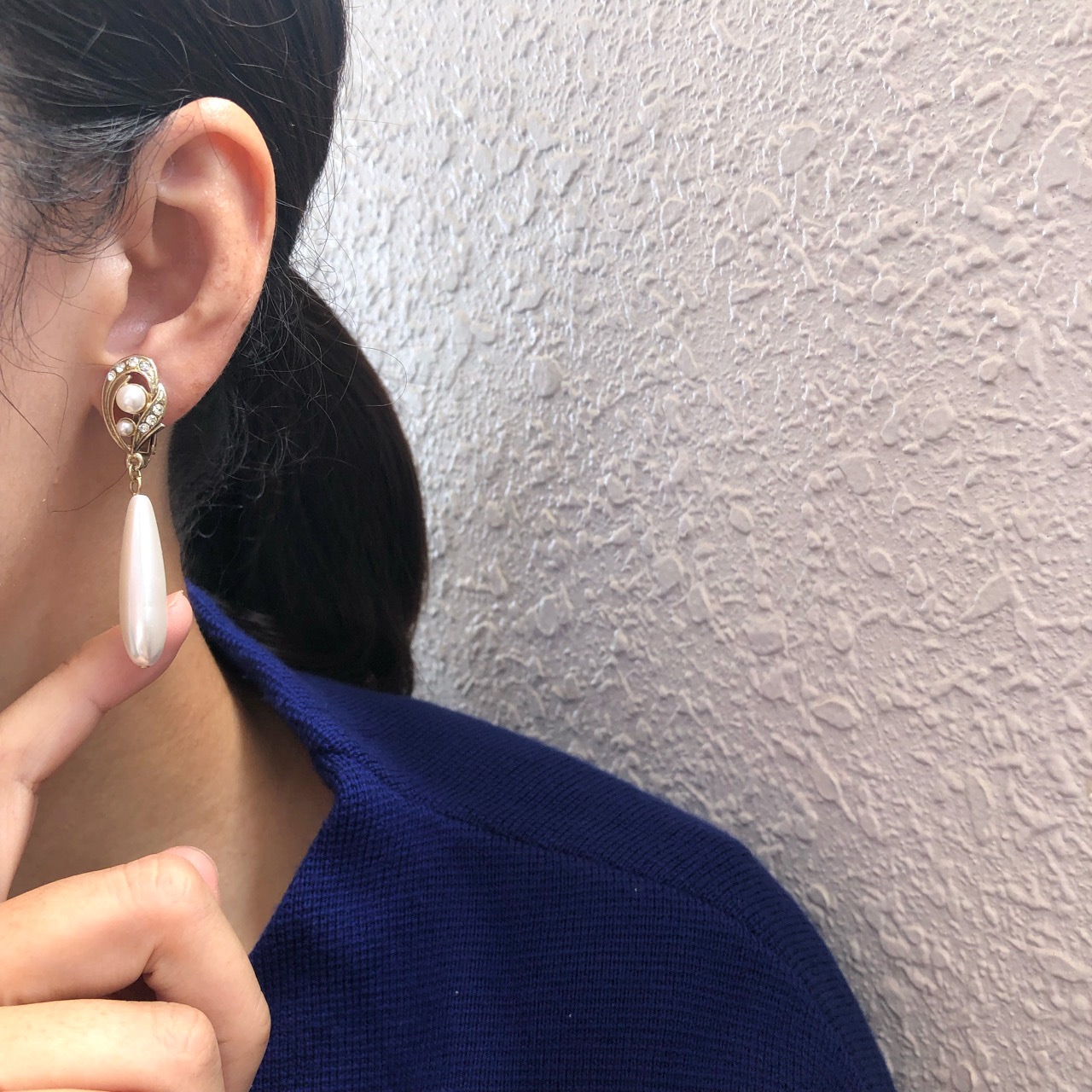 パールビーズとラインストーンでデザインされた装飾的なトップに、ロングドロップパールが揺れる、とても素敵なヴィンテージイヤリングです。