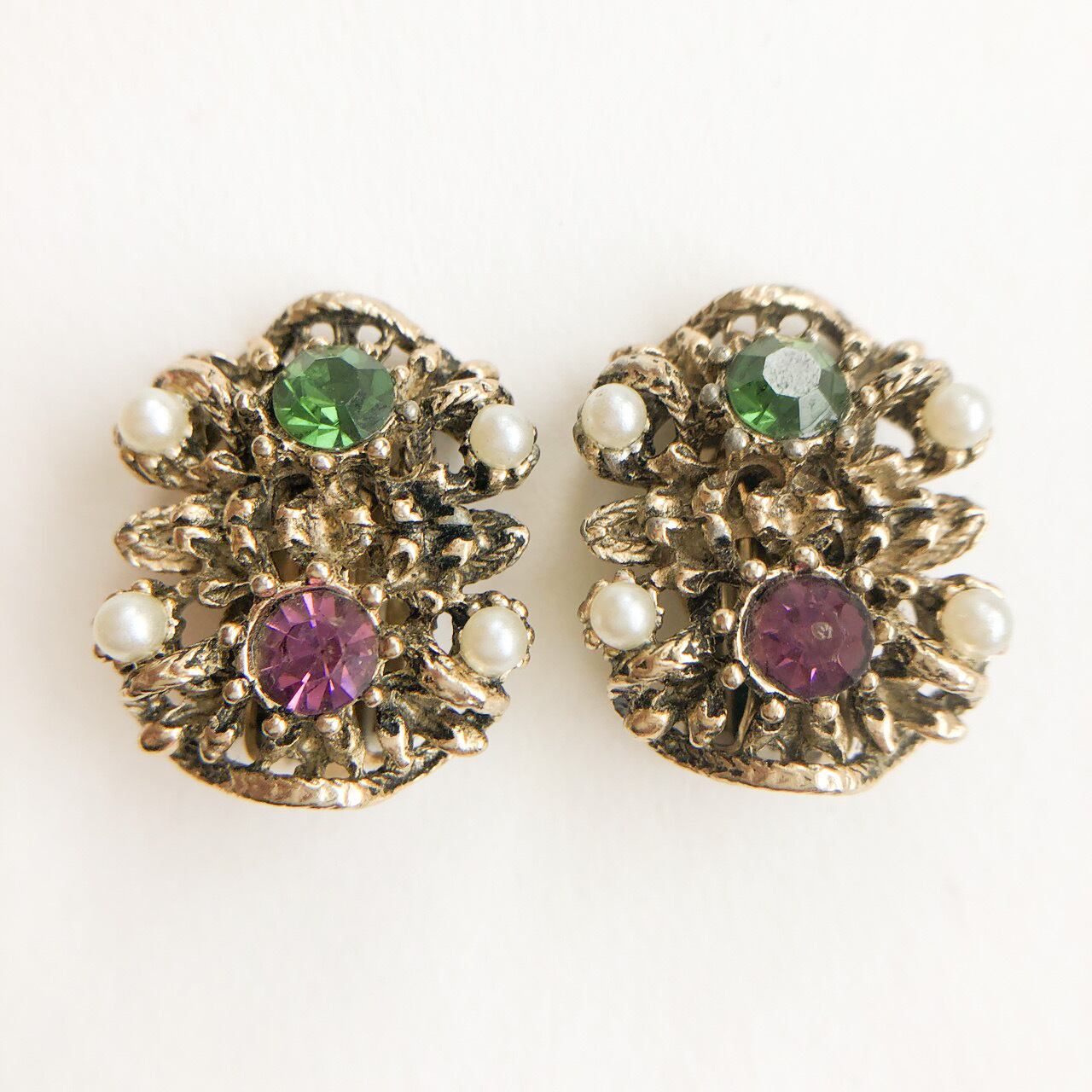 アンティーク調ゴールドメタルの装飾的な土台に、グリーンとピンク(パープル?)ラインストーンと小粒のパールビーズでデザインされた、とても素敵なヴィンテージイヤリングです。