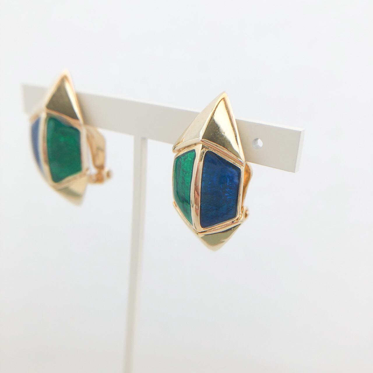 ゴールドメタルにグリーン&ブルーエナメルの、シャープでモダンなオブジェのようなデザインがとても素敵なヴィンテージイヤリングです。