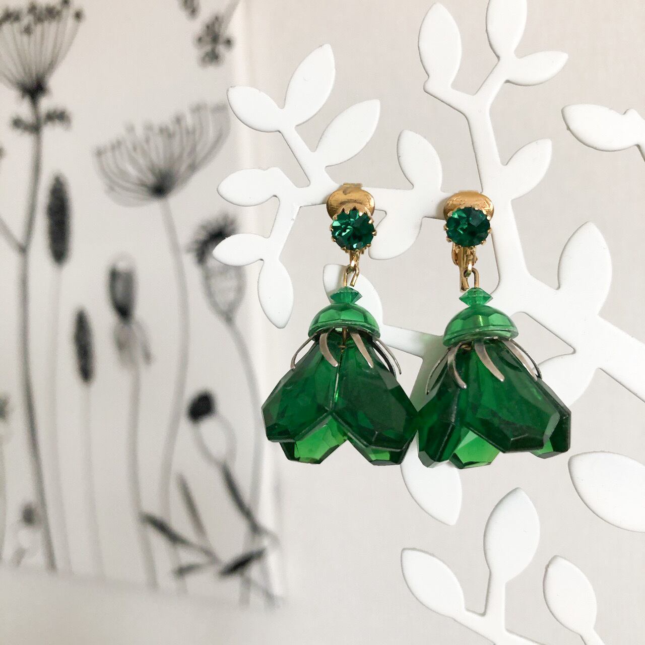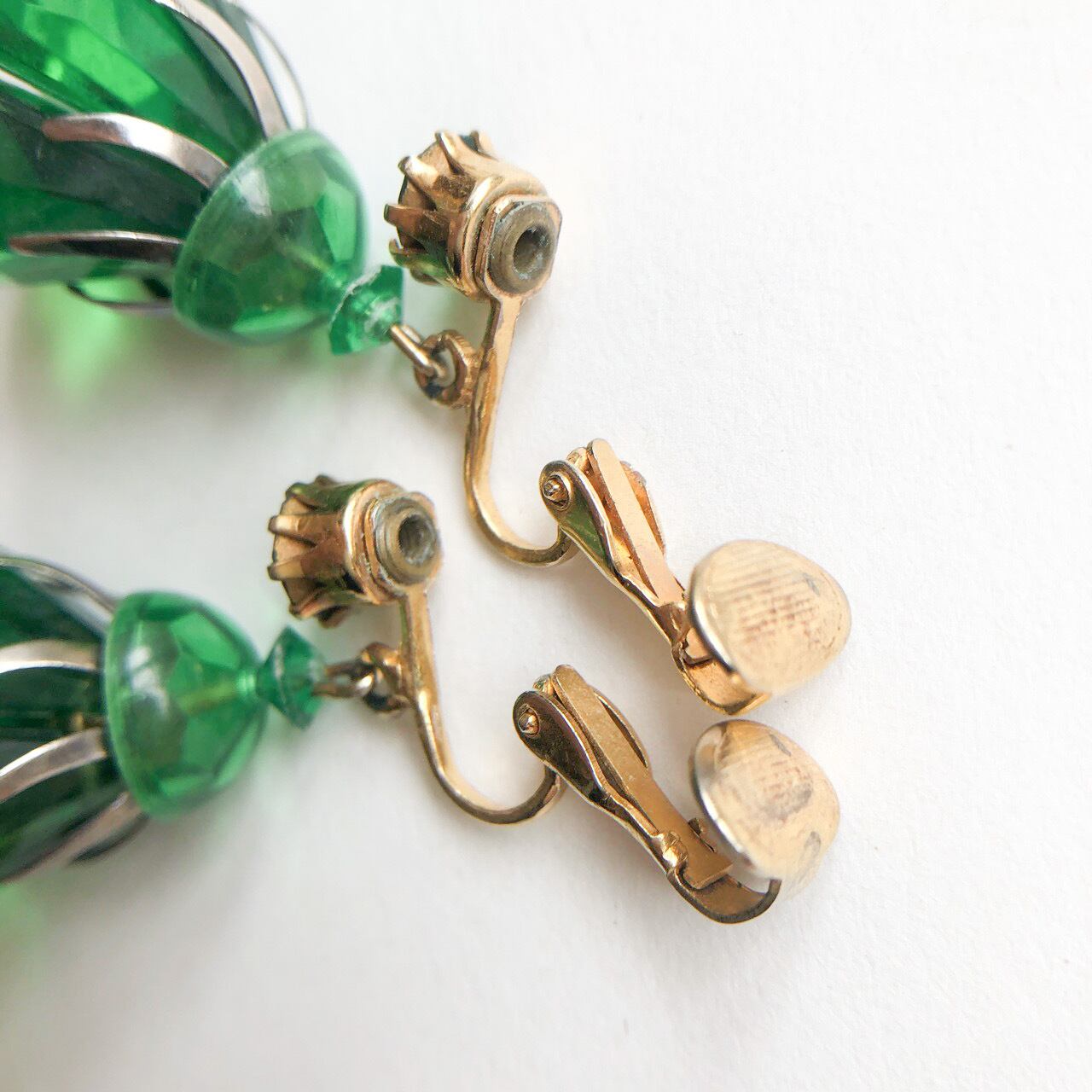 ゴールドメタルの土台に落ち着いたクリアグリーンのビーズの、シャンデリアのような立体的なデザインが、とても素敵なヴィンテージイヤリングです。