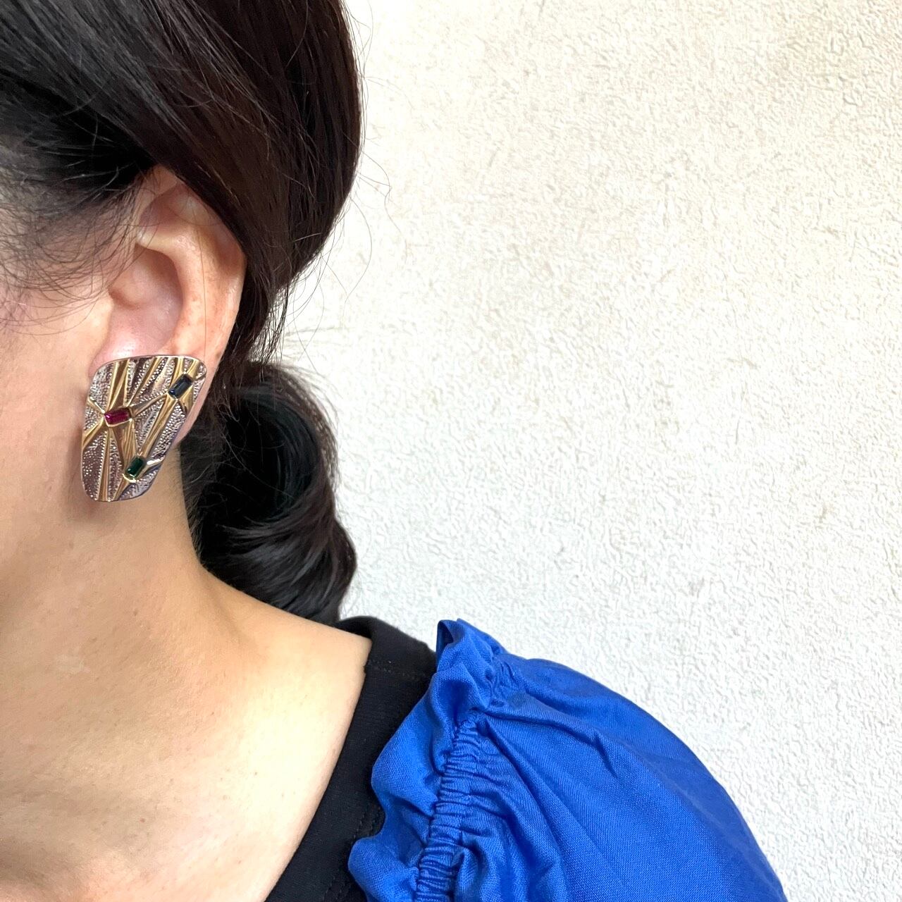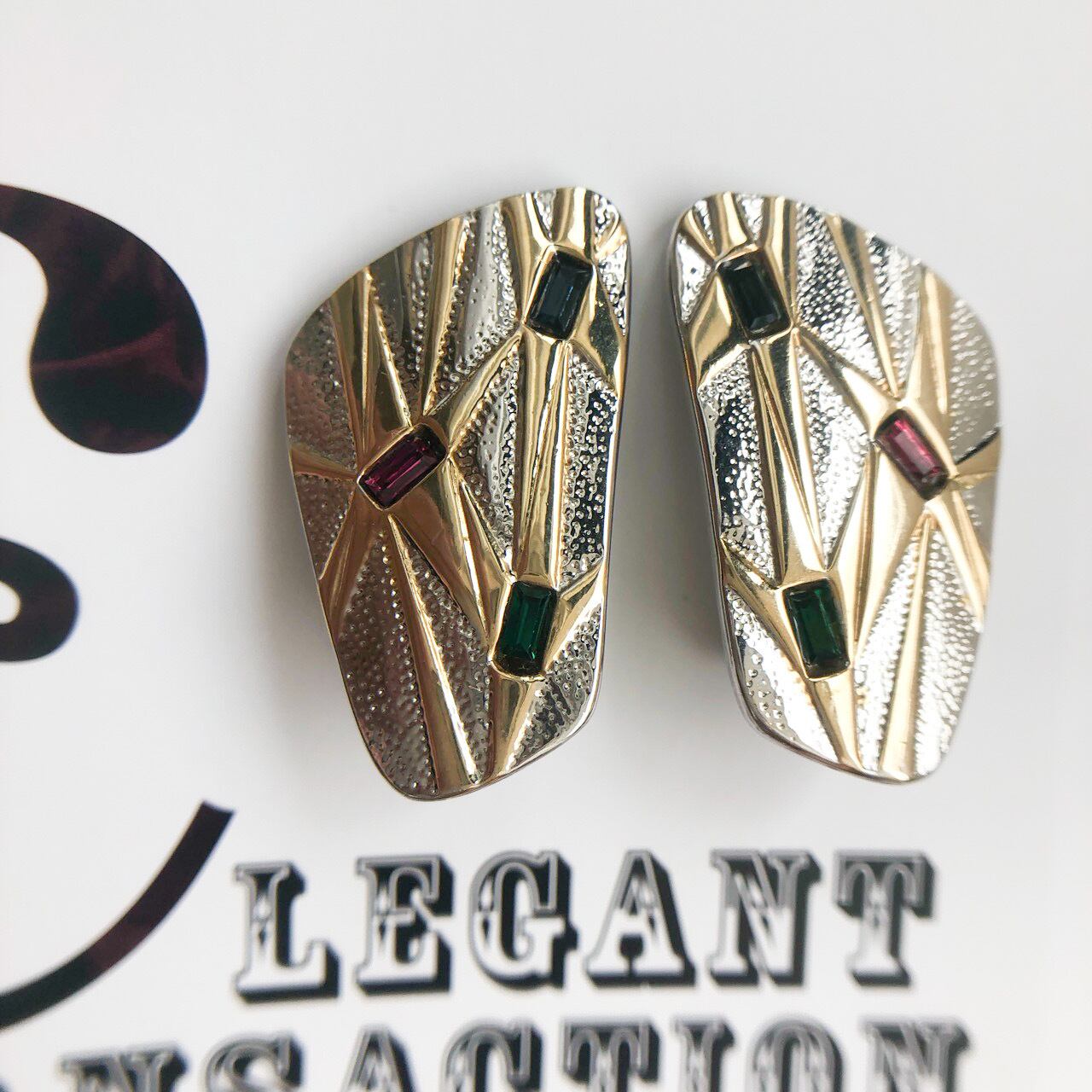 シルバー&ゴールドメタルと、グリーン、ピンク、ブルーのラインストーンでモダンなオブジェのようにデザインされた、とても素敵なヴィンテージイヤリングです。